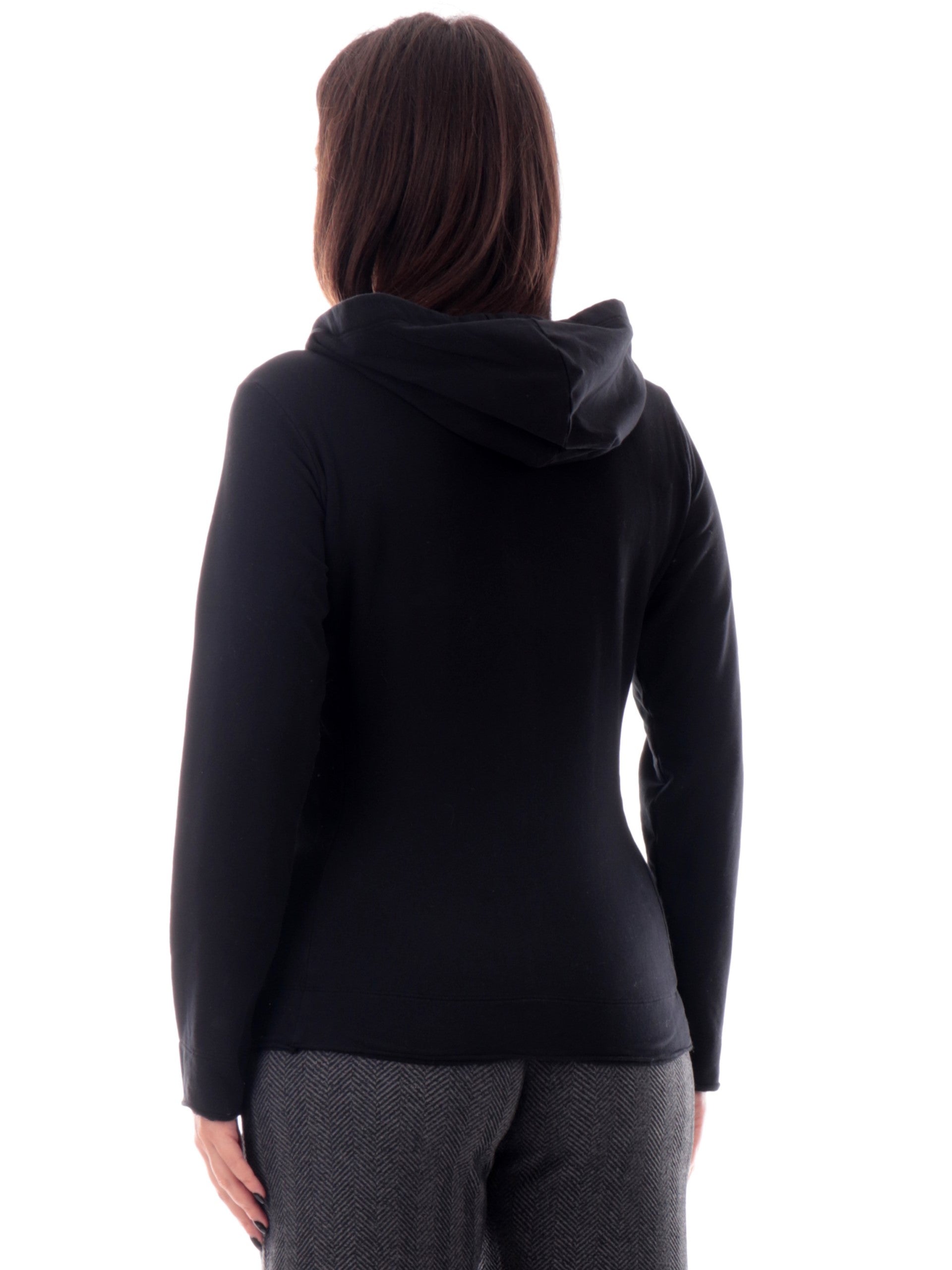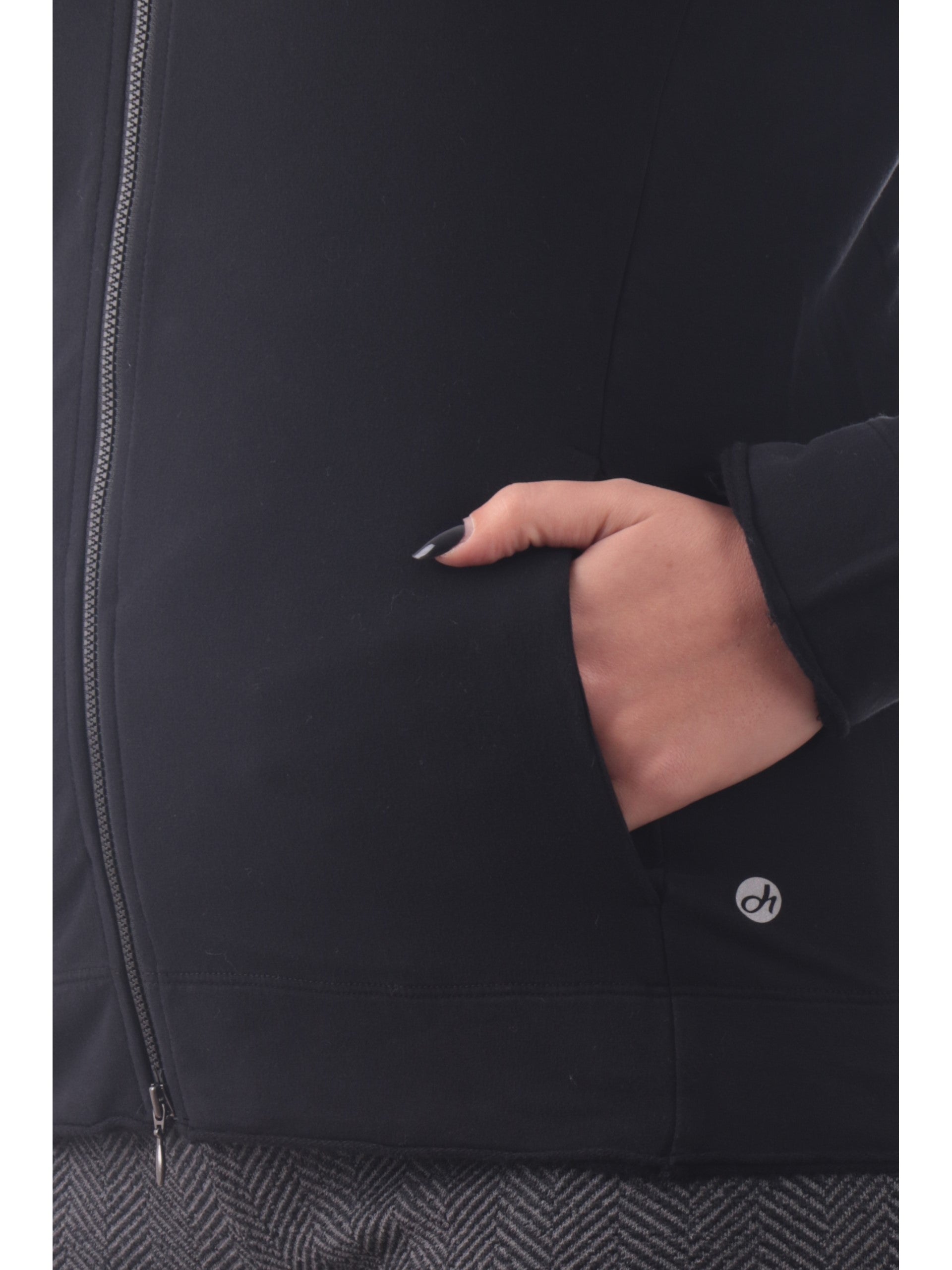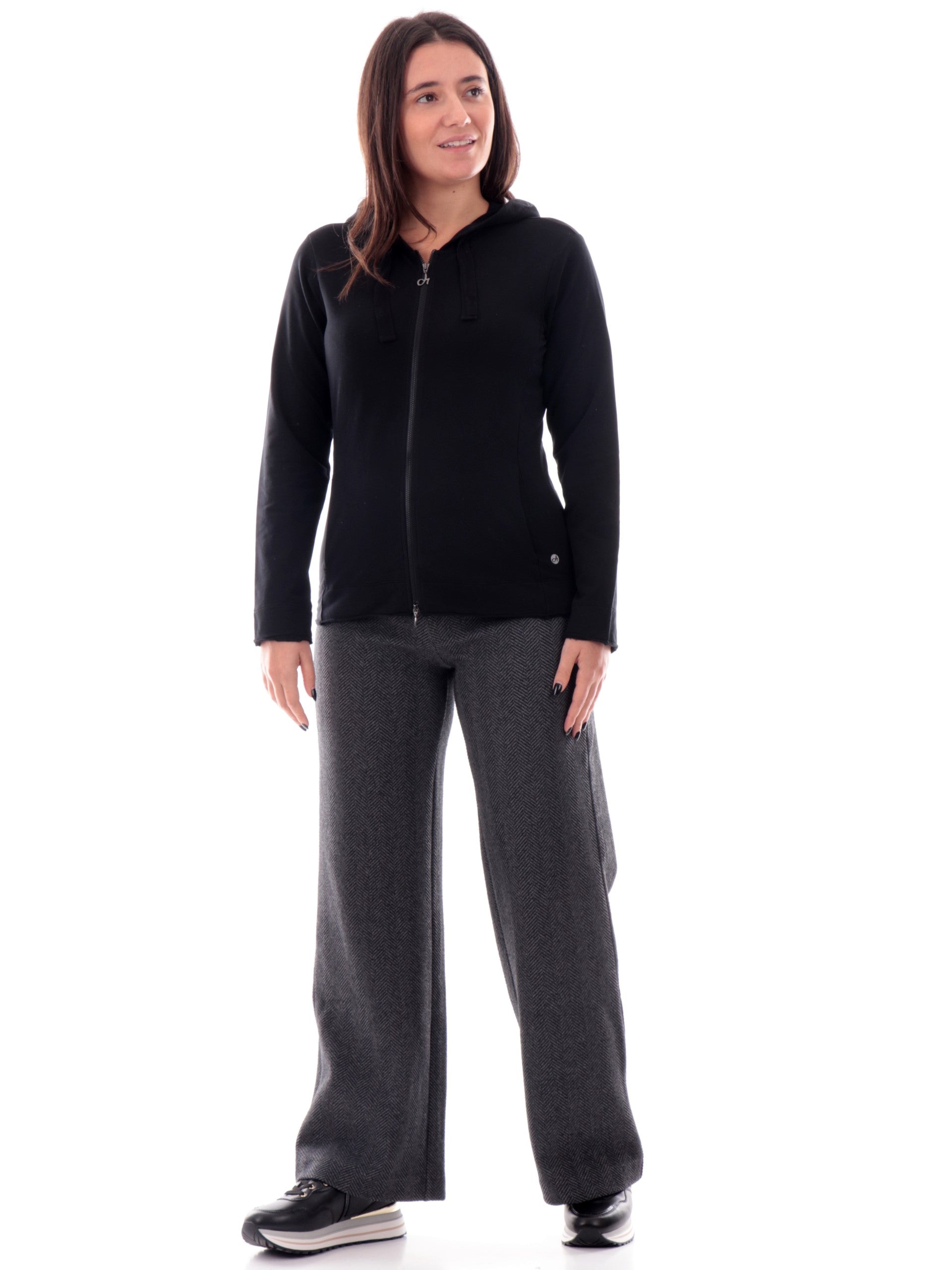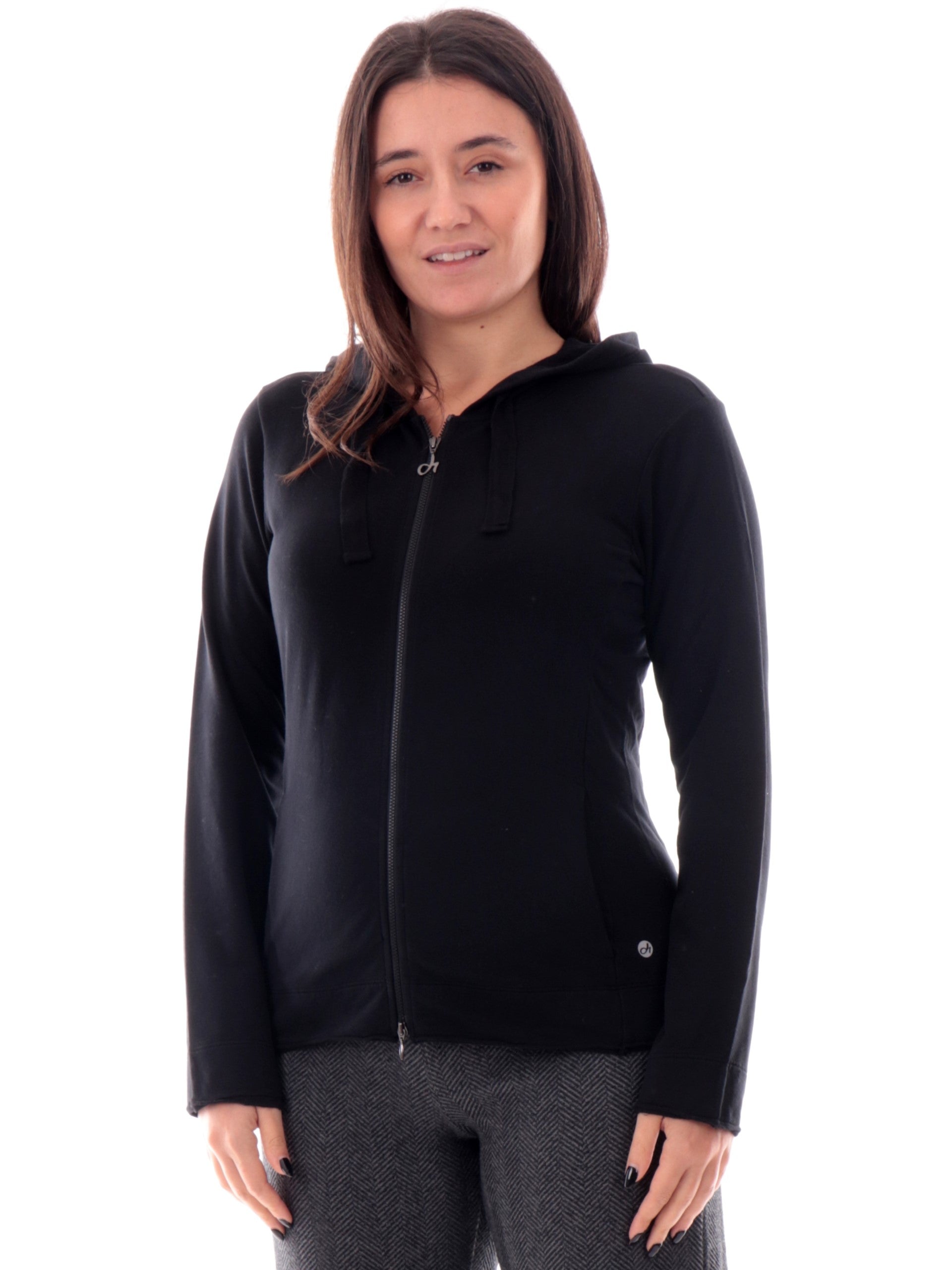 Felpa nera Deha con cappuccio. Questa felpa nera Deha realizzata in cotone è caratterizzata da un cappuccio regolabile con lacci, chiusura centrale full zip con doppio cursore, due tasche laterali aperte, polsini e fondo regolare. Questa felpa con cappuccio grazie alla sua versalità si adatta perfettamente ad ogni occasione e non può mancare nel tuo guardaroba.
