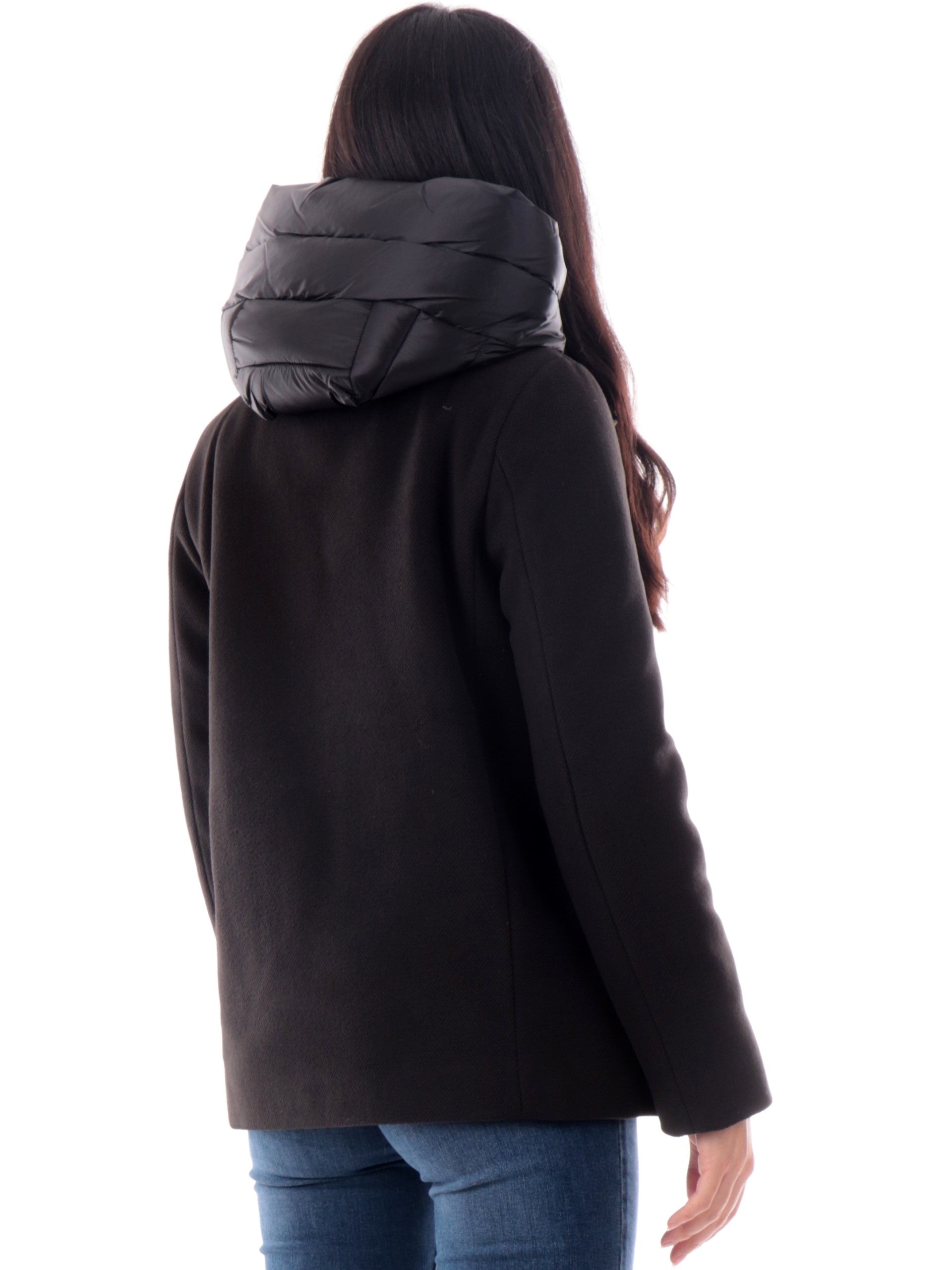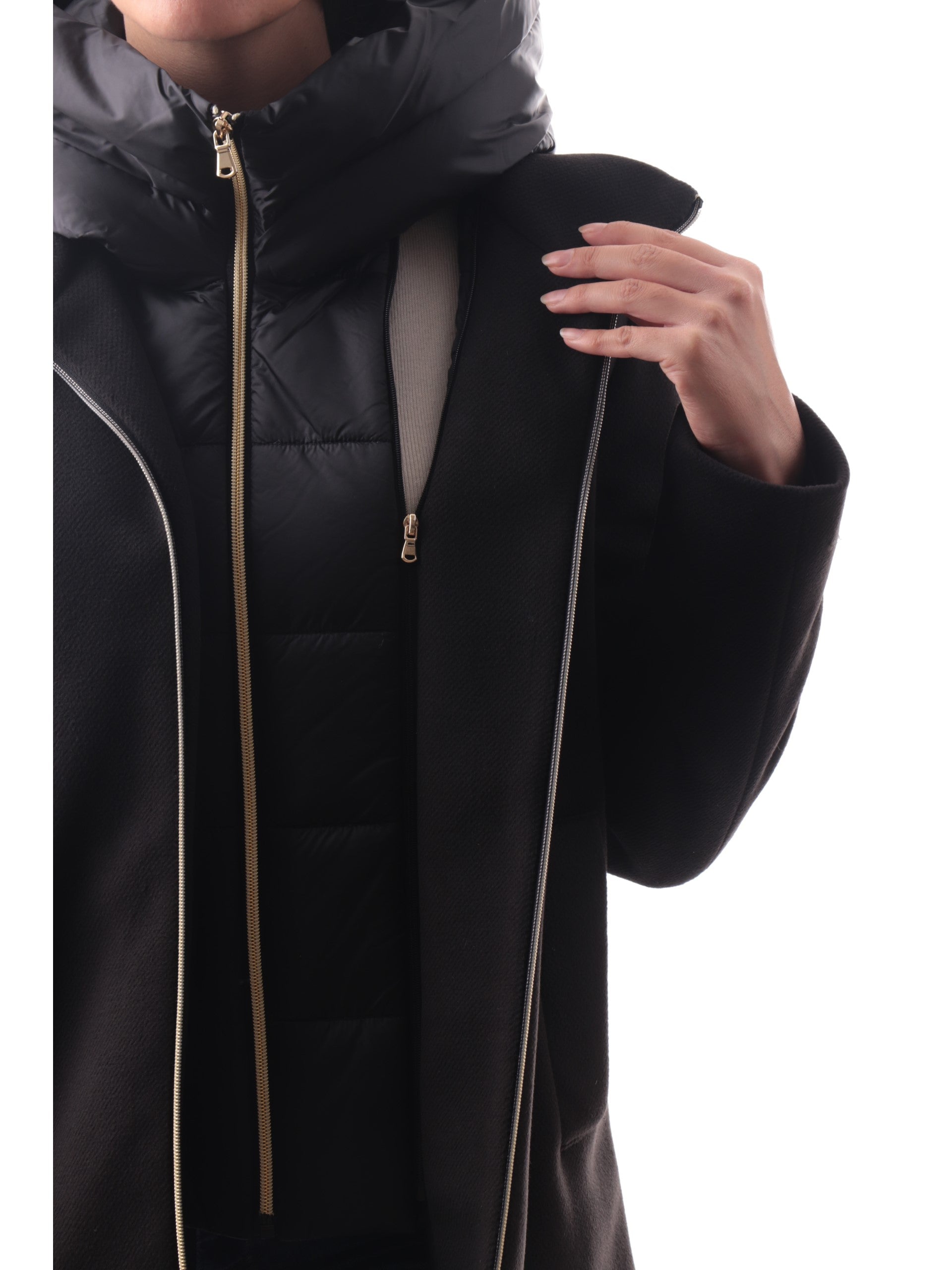 Giacca Emme Marella nera da donna con finto gilet removibile SORRISO, realizzata con imbottitura eco-friendly. Questo giubbino Marella nero ha un finto gilet interno removibile (rimuovendolo verrà tolto anche il cappuccio), la chiusura full zip centrale, due tasche laterali aperte e il fondo regolare.