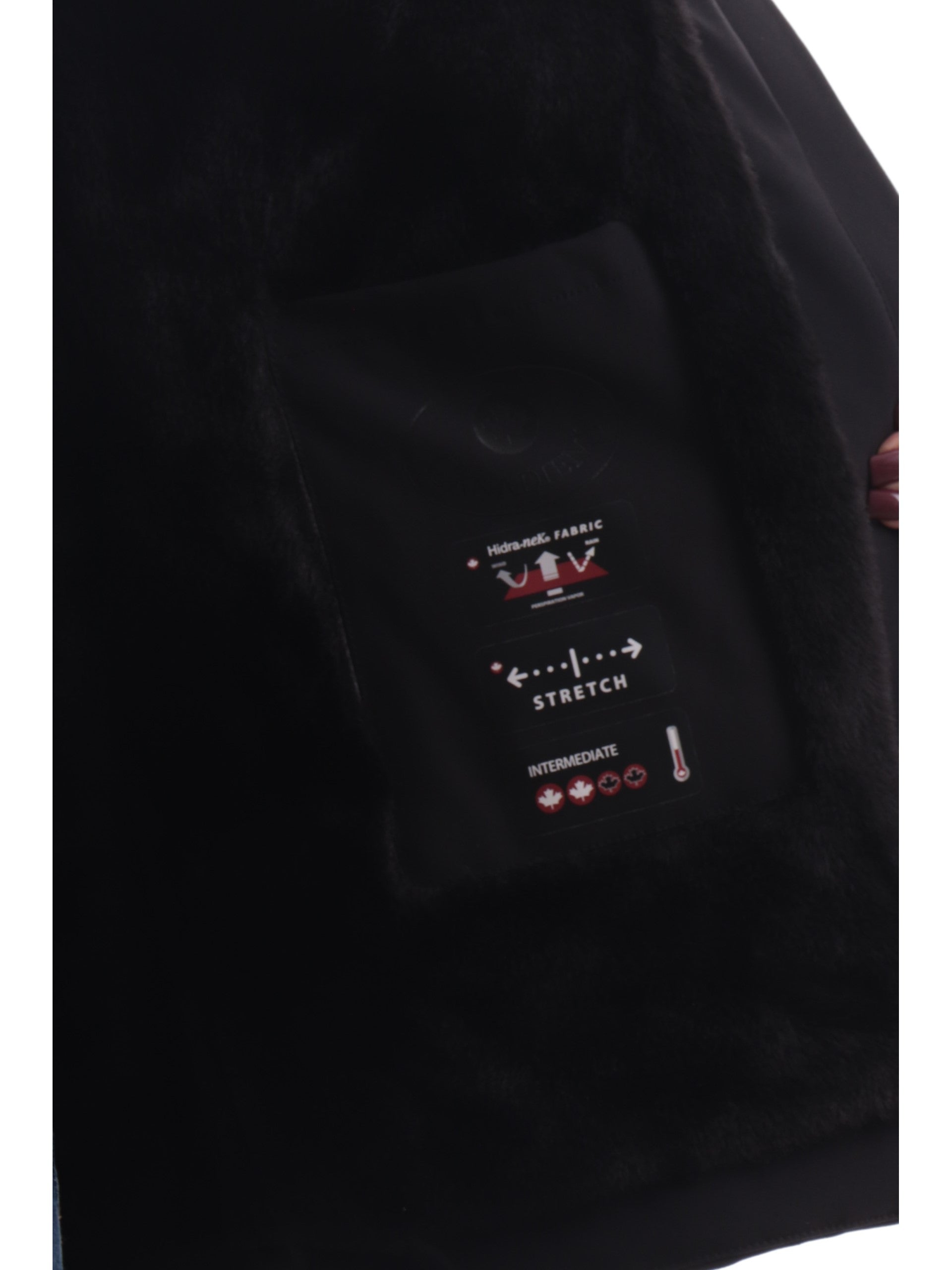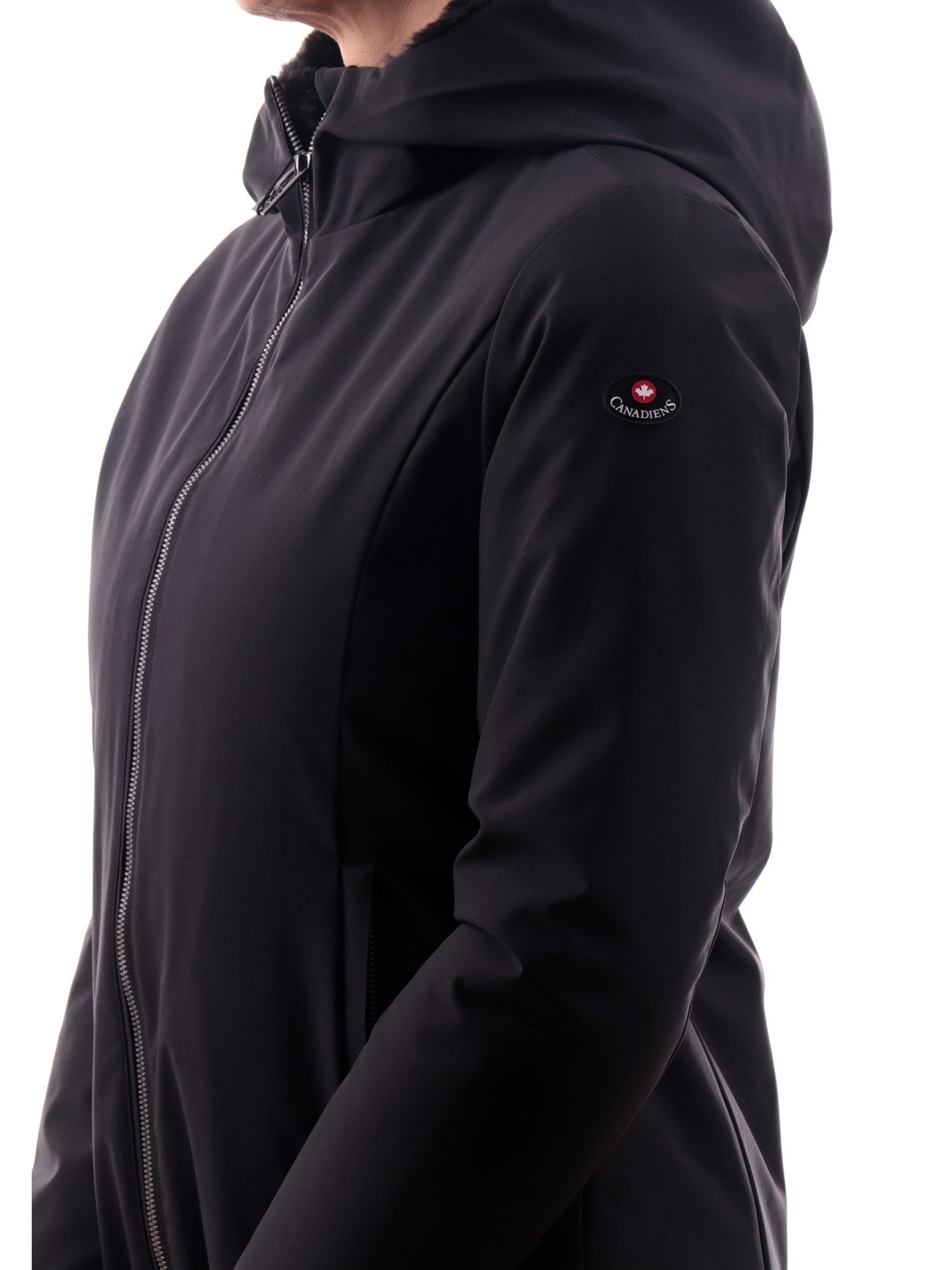 Giubbino Canadiens nero da donna Kate. Questo giubbino da donna realizzato da un tessuto caldo ed avvolgente e da un tessuto tecnico e impermeabile perfetto per la stagione invernale. Questo giubbinoCanadiens da donna nero è caratterizzato dal cappuccio fisso, chiusura full zip con doppio cursore, due tasche laterali con zip, una tasca interna aperta, il logo del brand applicato sulla manica sinistra, polsini e fondo regolare. All'interno di questo giubbino da donna troviamo un tessuto in ecopelliccia