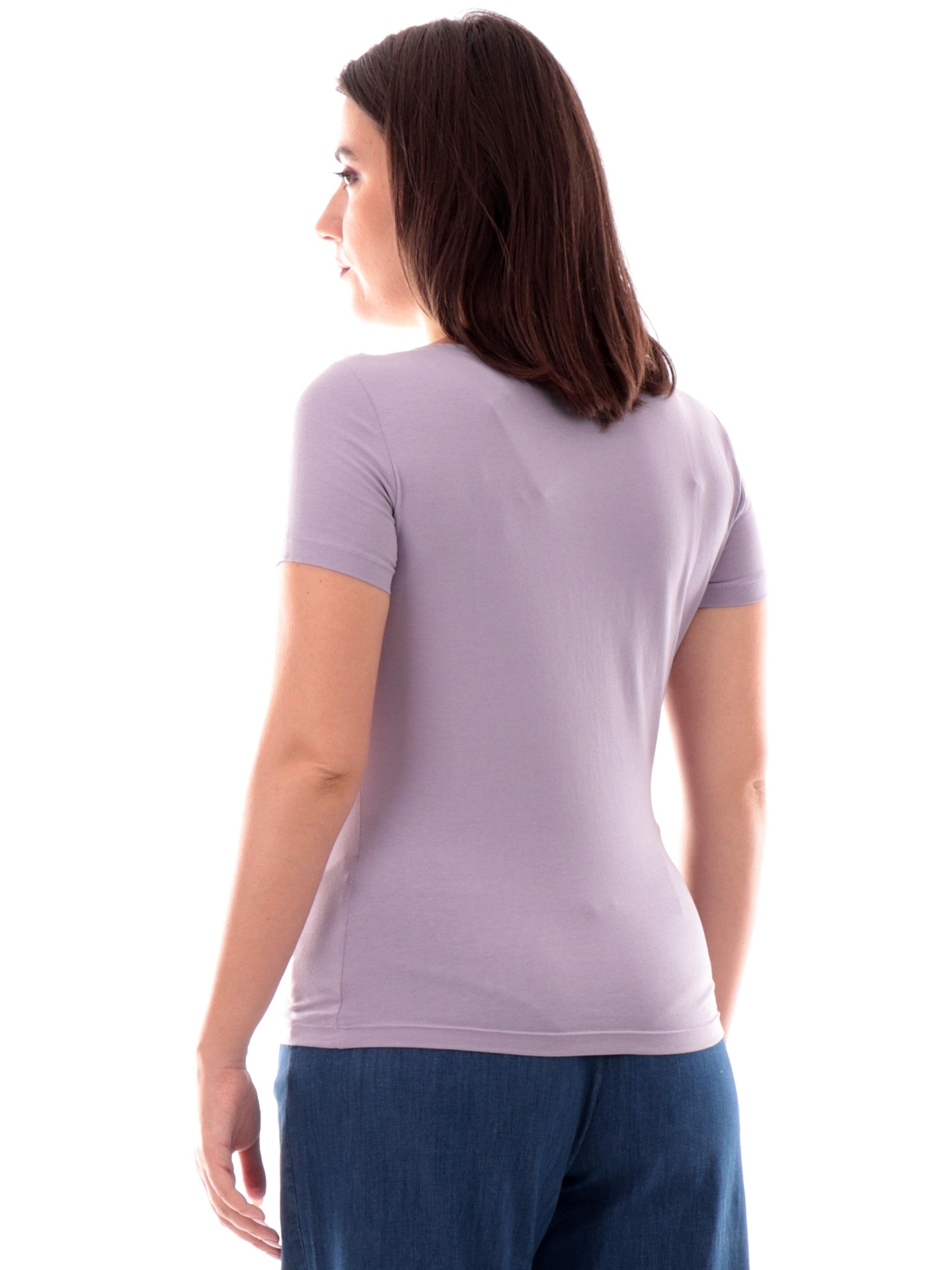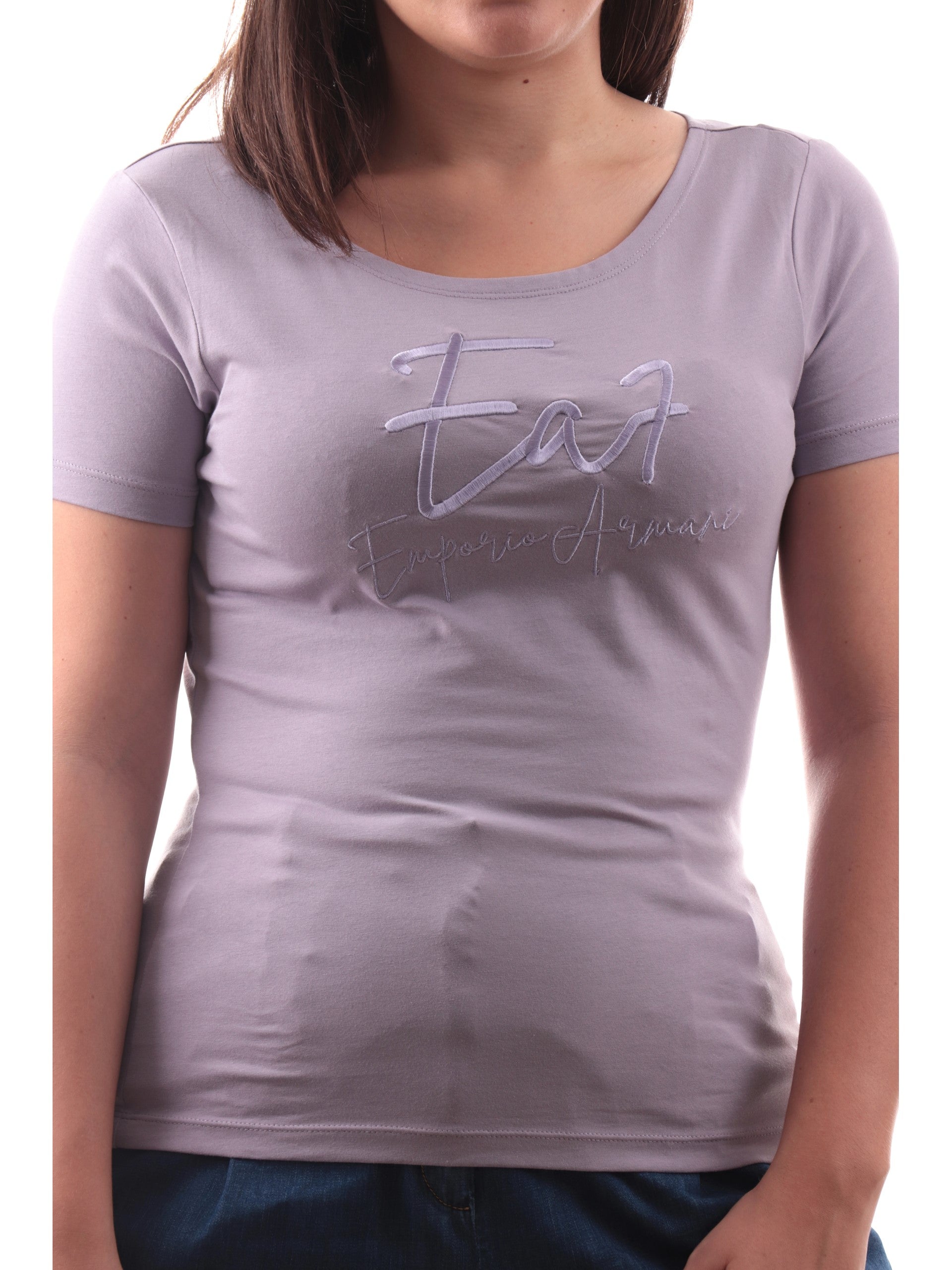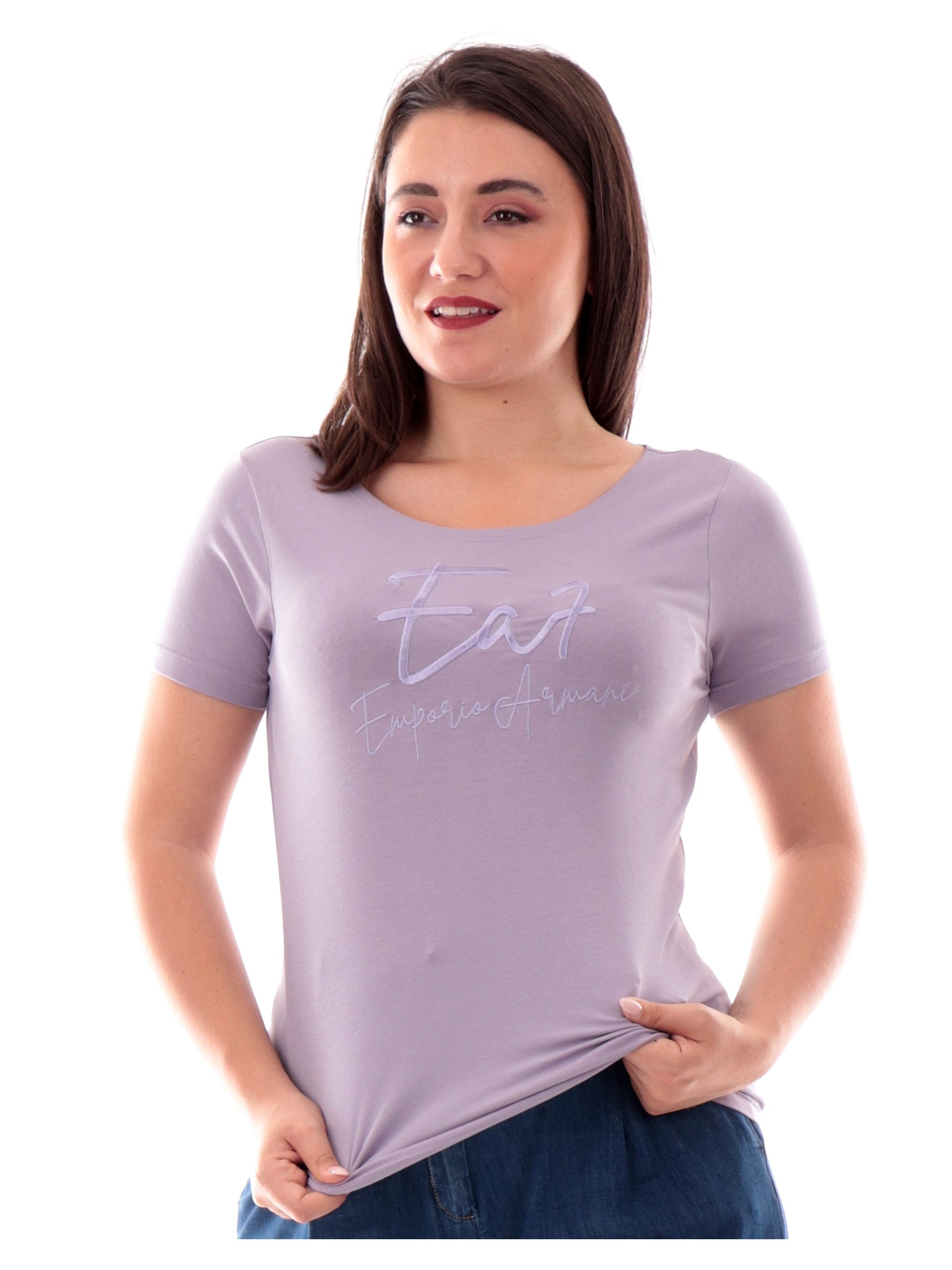 T-Shirt Emporio Armani Lilla con scritta bianca EA7 ricamata. Questa maglia Armani donna EA7 è realizzata in morbido cotone elasticizzato e linee femminili.