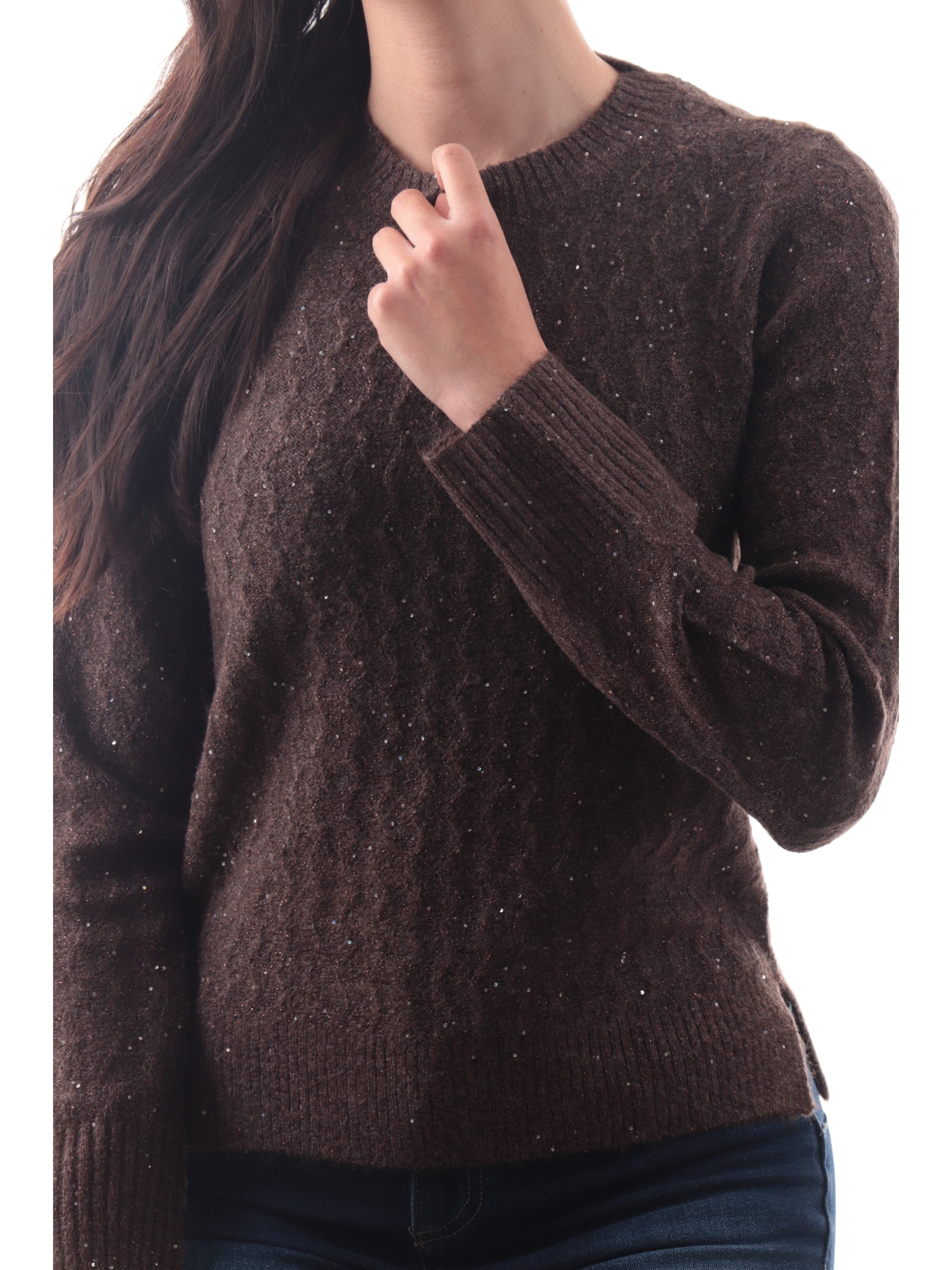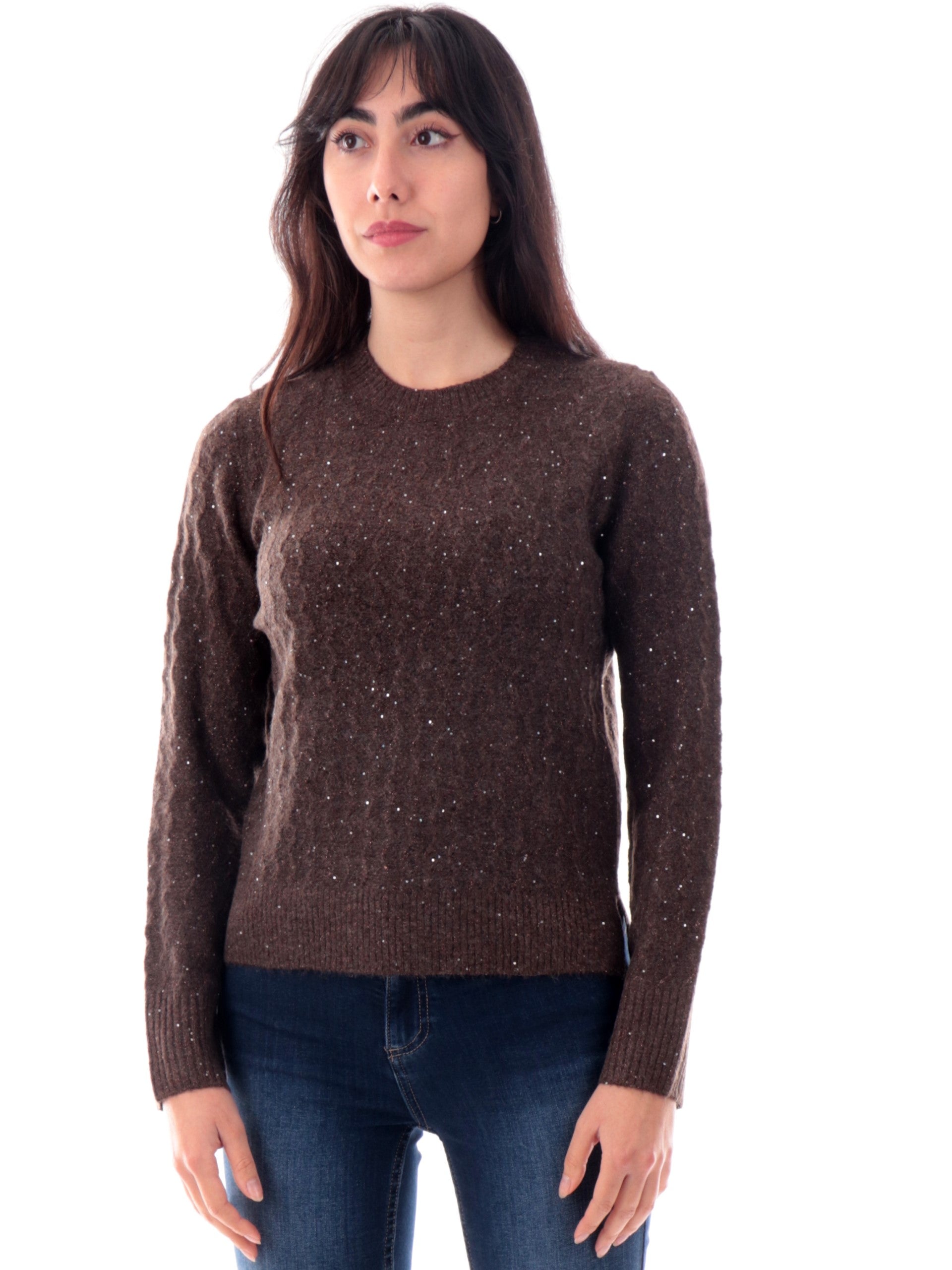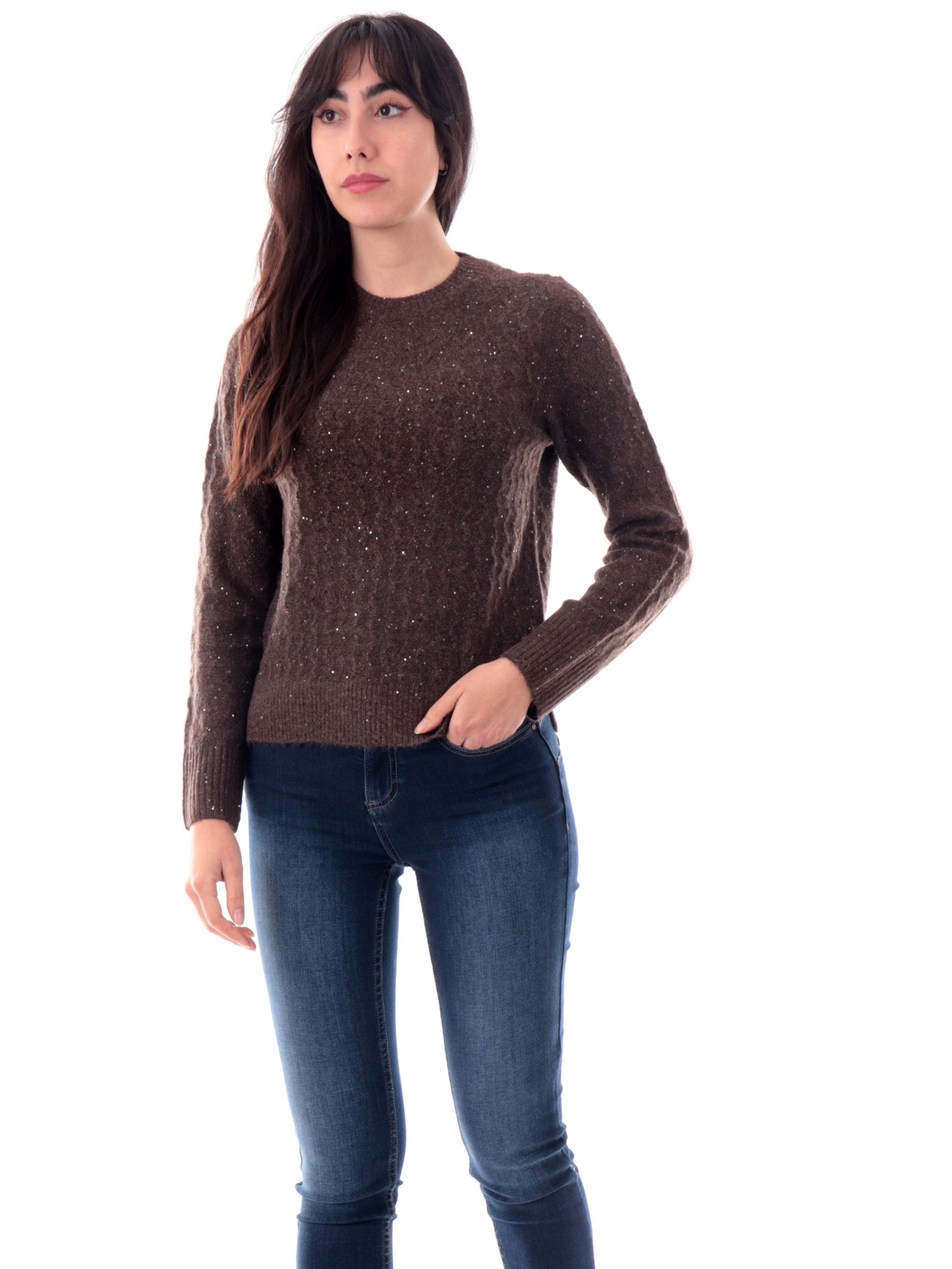 Maglione Anis White marrone da donna con pailletes . Questo maglione Anis è caratterizzato da trama lurex e vestibilità morbida con attenzione ai tessuti morbidi e di alta qualità . Un maglione marrone donna elegante e dinamico, da abbinare come preferisci.