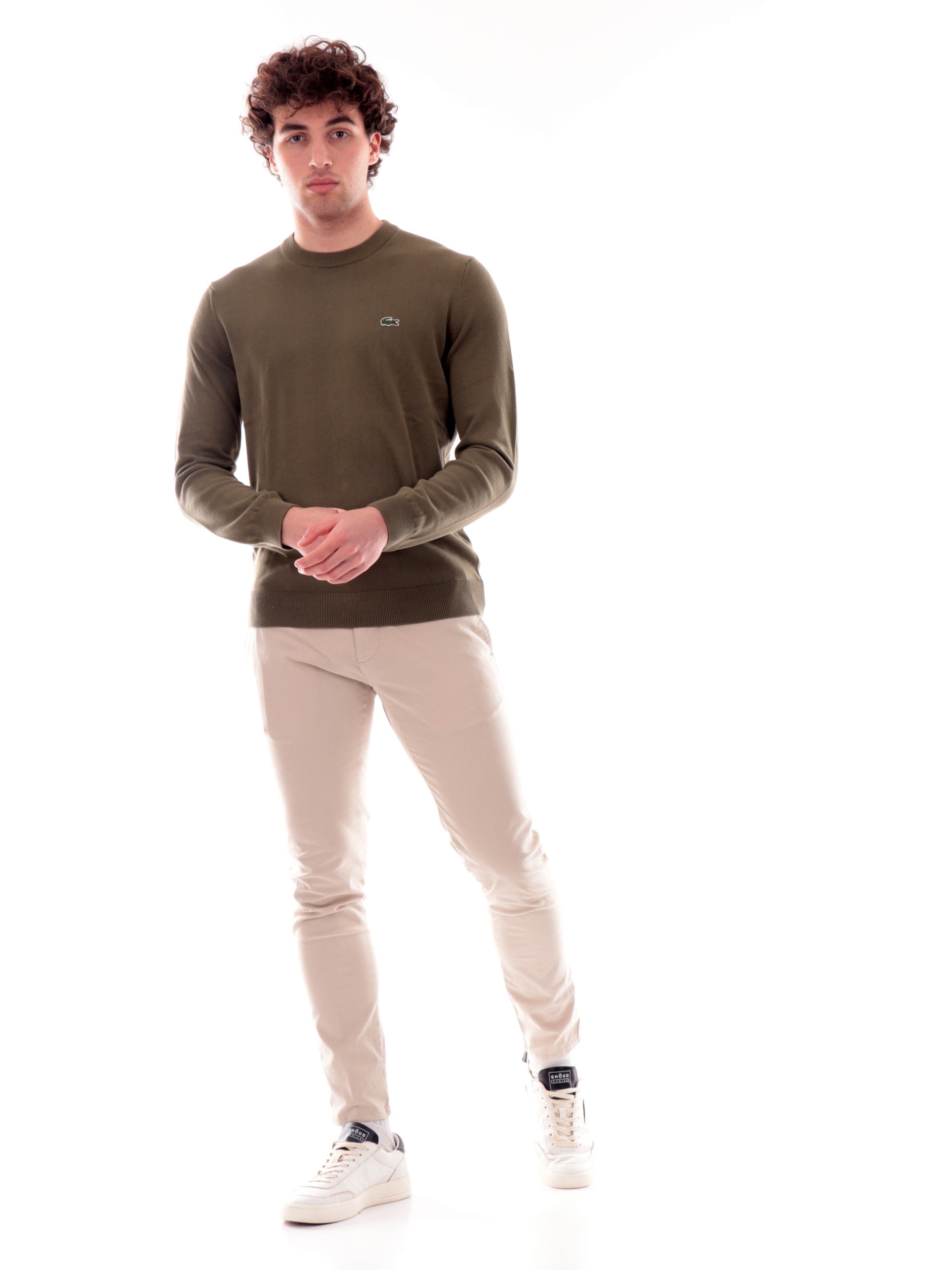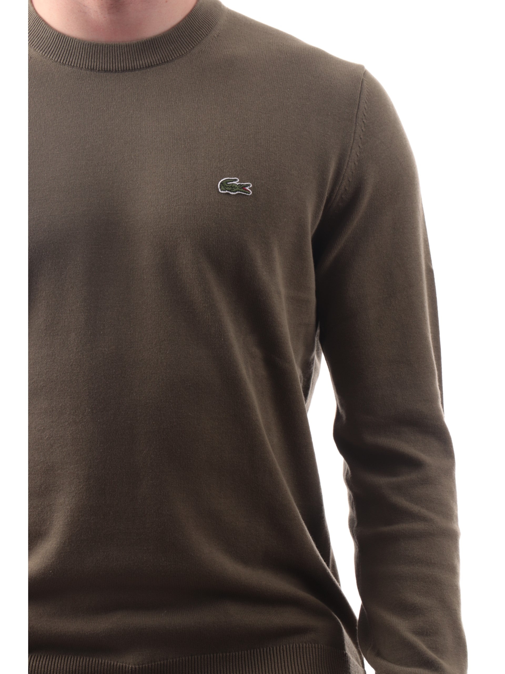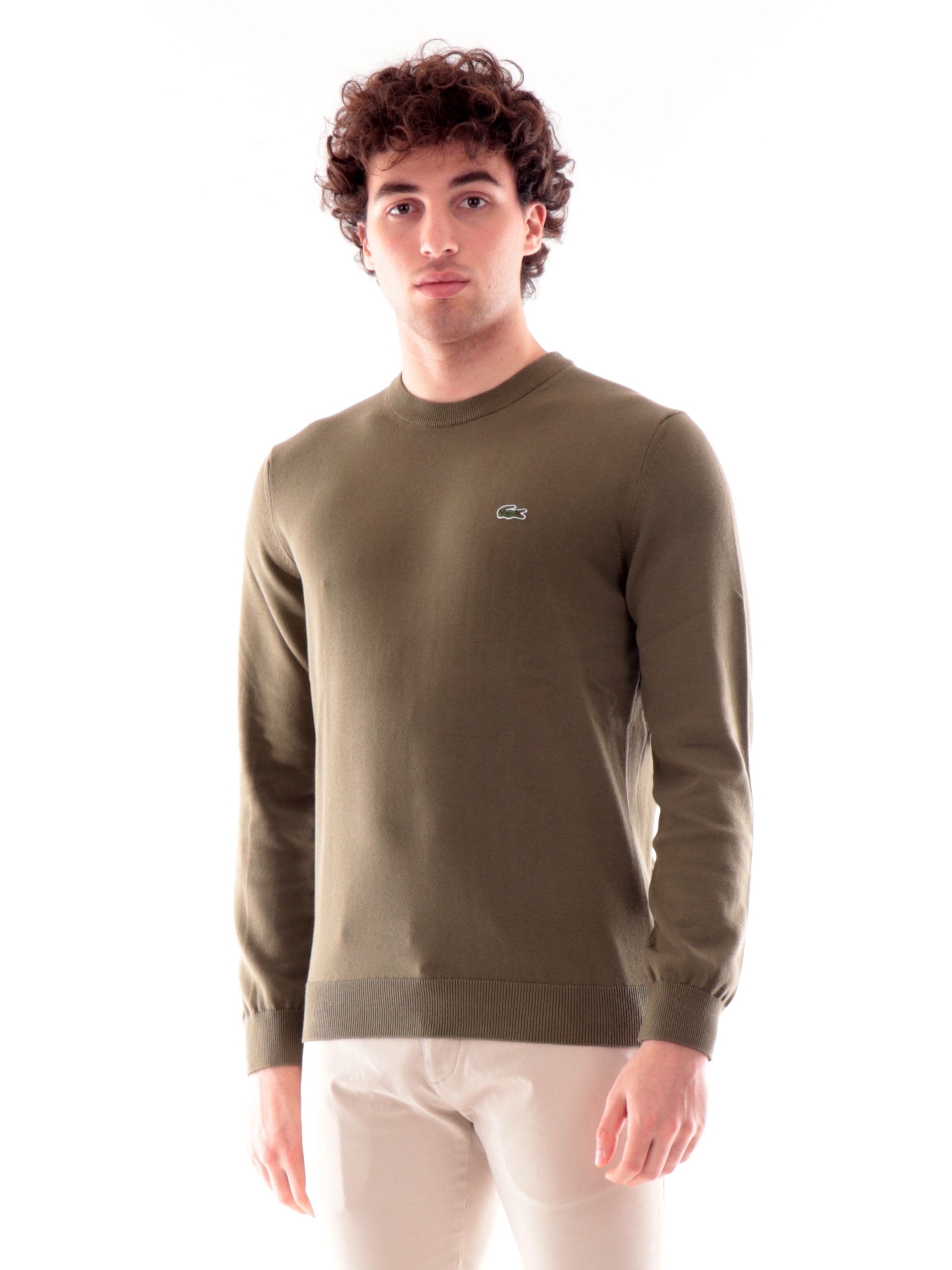Maglione Lacoste in morbido organic cotton a tinta unita di colore verde. Pullover da uomo dalla vestibiltà regolare, presenta girocollo, polsini e fascia di fondo rifiniti a coste. Il patch con il logo si trova sul petto lato cuore. Questo iconico pullover Lacoste modello AH1985 si può indossare in ogni occasione con una t-shirt o con una camicia a seconda delle vostre esigenze