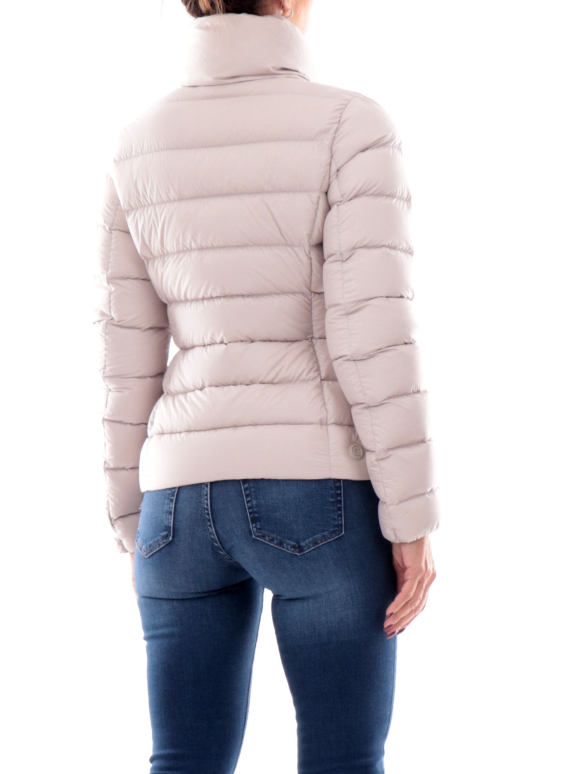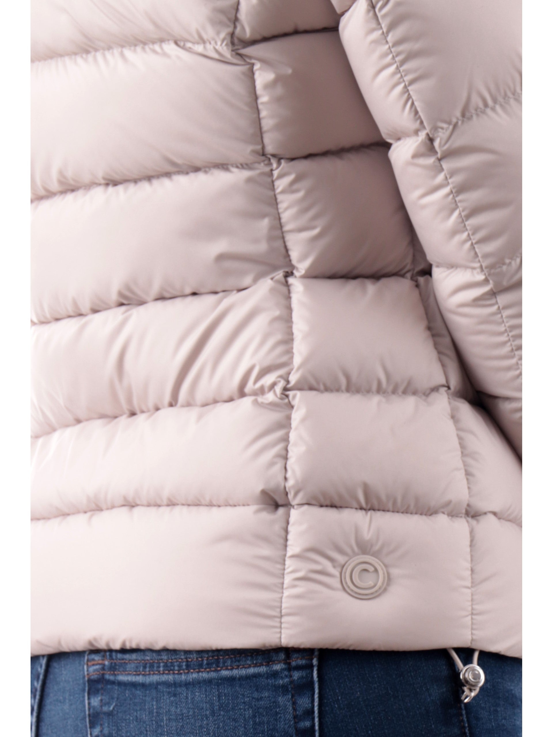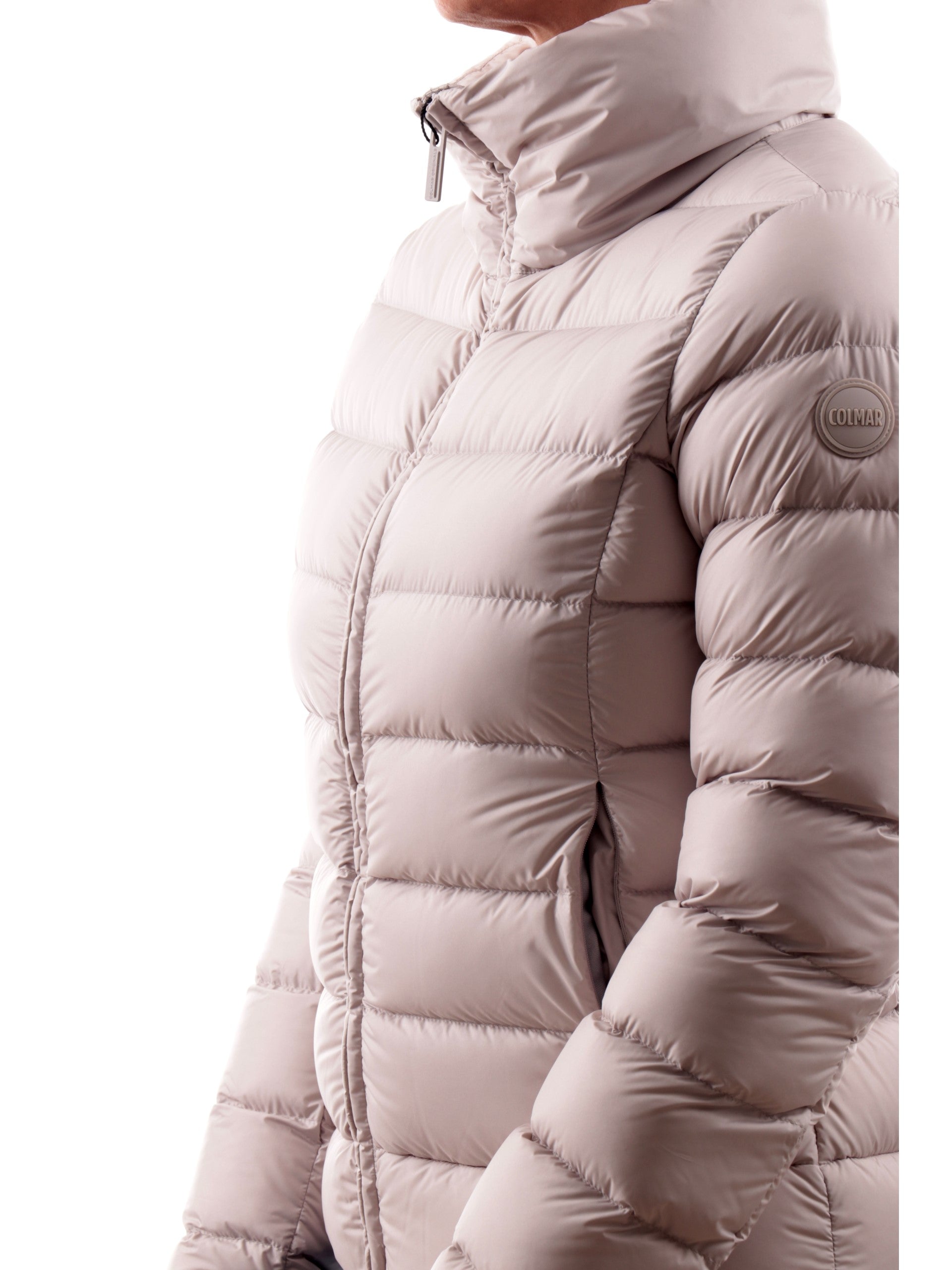 Piumino beige da donna Colmar. Questo piumino da donna realizzato da un'imbottitura in vera piuma ed è caratterizzato dallo scaldacollo, chiusura centrale full zip con doppio cursore, due tasche laterali con zip, polsini elasticizzati e fondo con coulisse. Questo giubbino è perfetto sopra un jeans