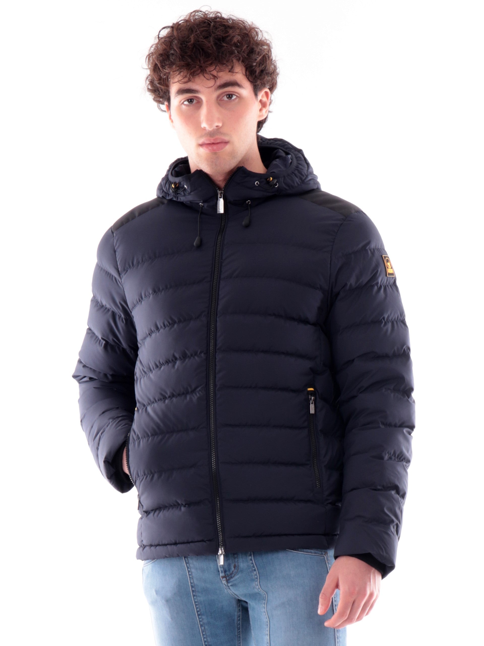 Piumino Ciesse da uomo blu STEVENSON. Questo Piumino Ciesse blu da uomo è realizzato in vera piuma, caldo ed avvolgente. Questo giubbotto Ciesse è caratterizzato da cappuccio fisso regolabile con lacci, chiusura full zip, due tasche laterali con zip, all'interno troviamo una tasca a zip e sulla manica sinistra il logo giallo di Ciesse applicato
