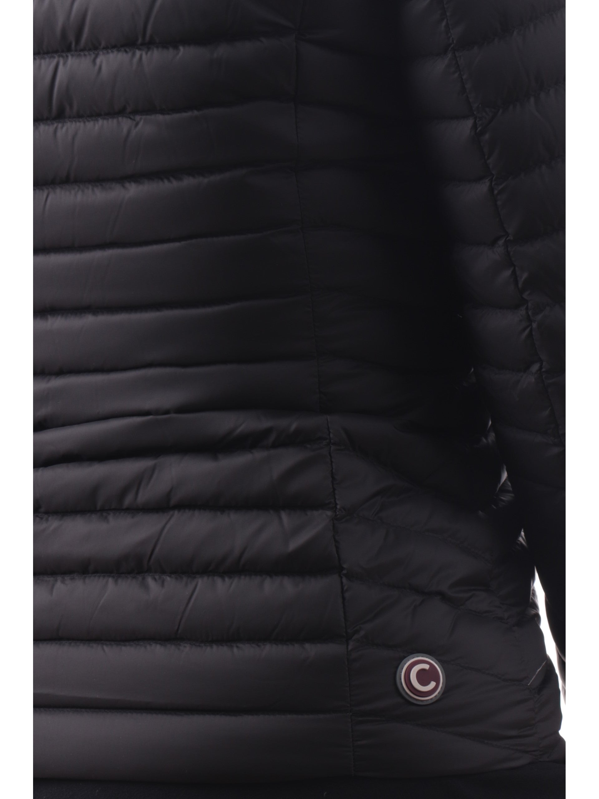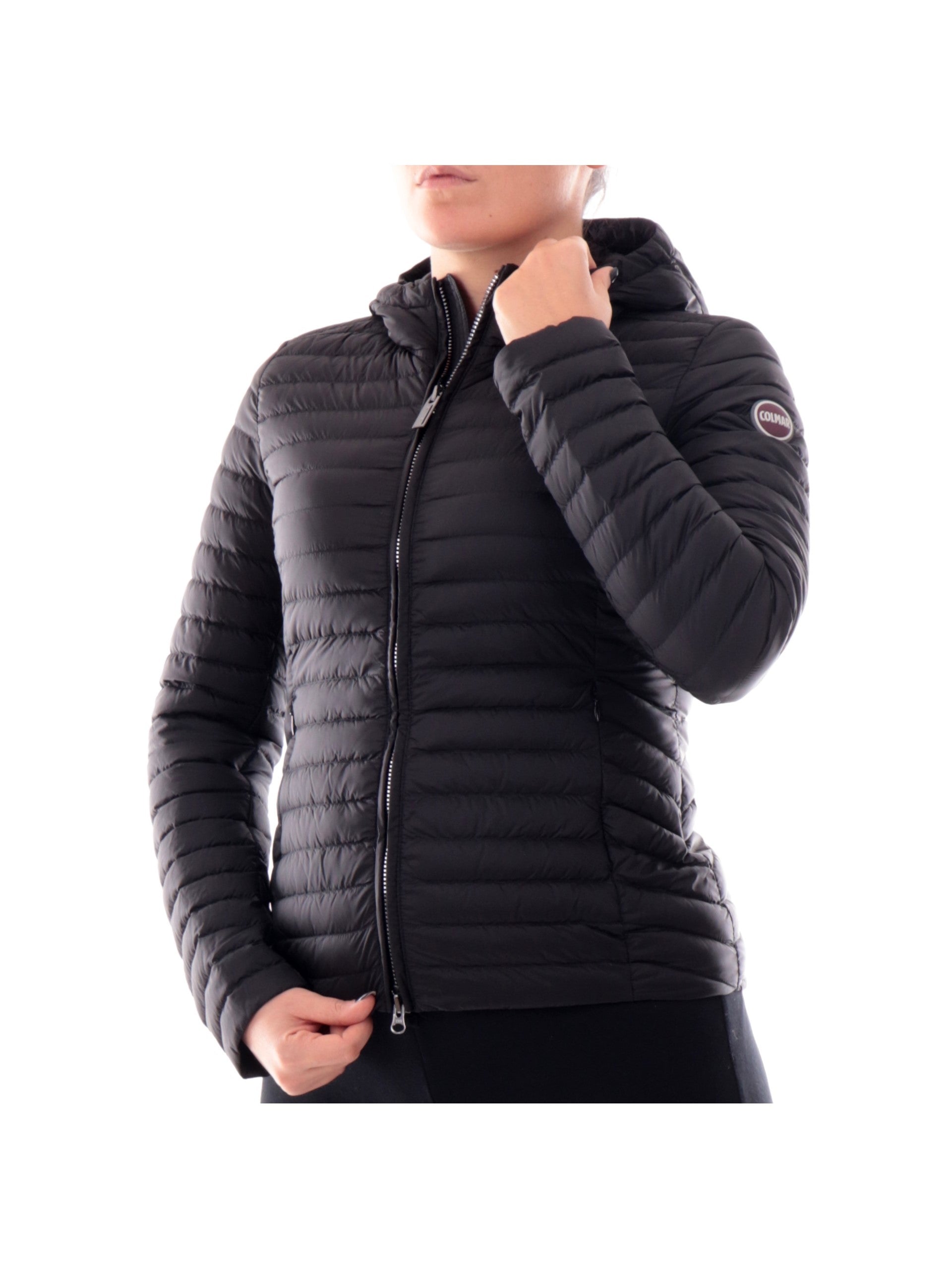 Piumino Colmar donna nero. Questo giubbino Colmar da donna nero è realizzato da un tessuto trapuntato con l'imbottitura in vera piuma è caratterizzato da cappuccio fisso, chiusura full zip con doppiocursore, due tasche laterali con zip, polsini e fondo regolari e il logo del brand applicato sulla manica sinistra. Questo piumino Colmar da donna nero è perfetto su un jeans ed è perfetto per la stagione autunno-inverno