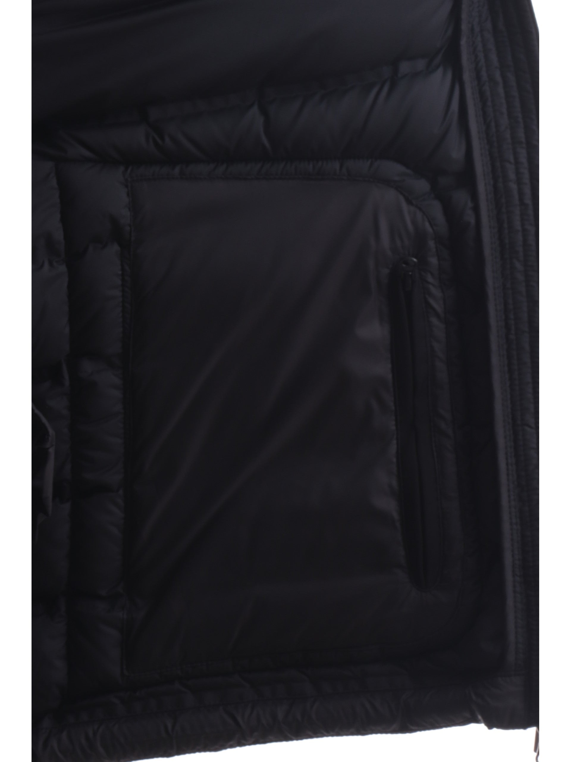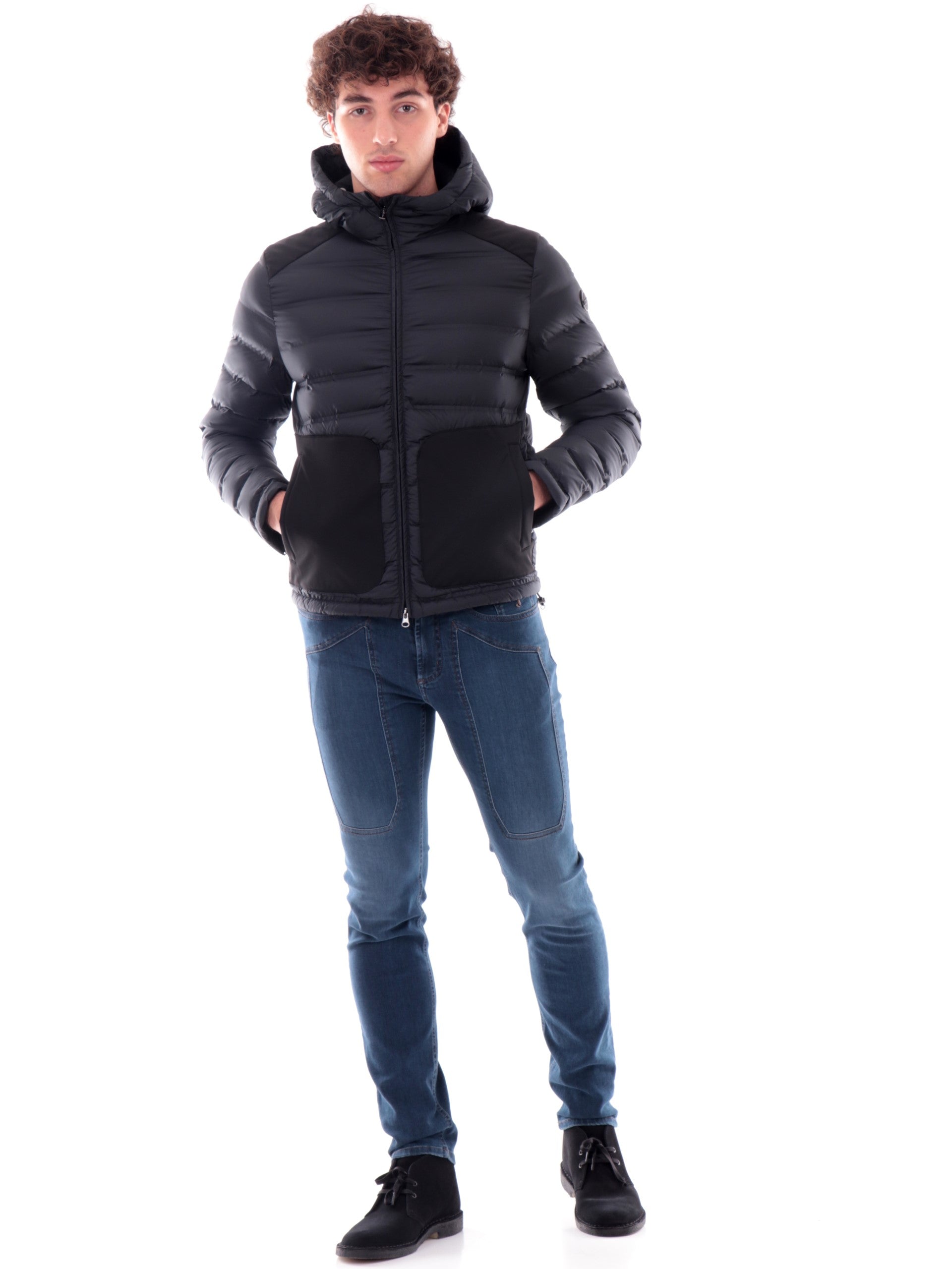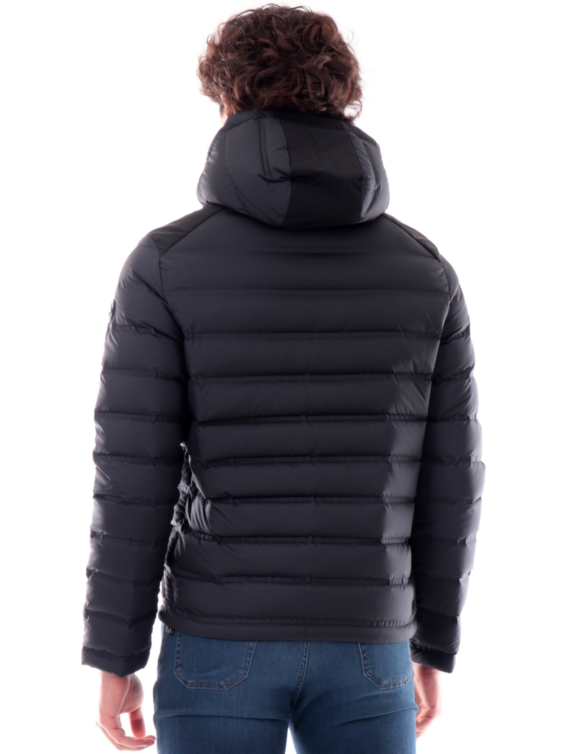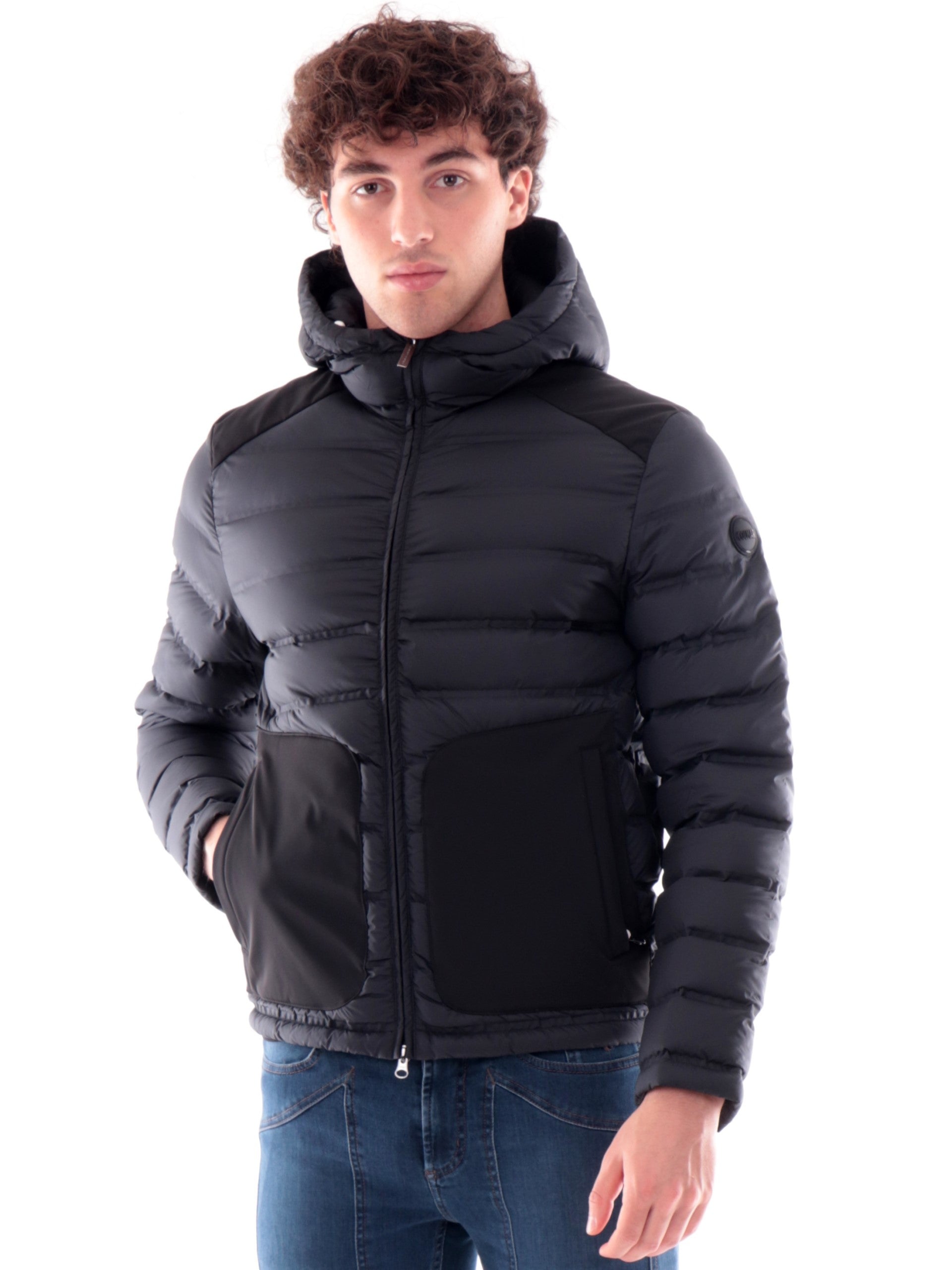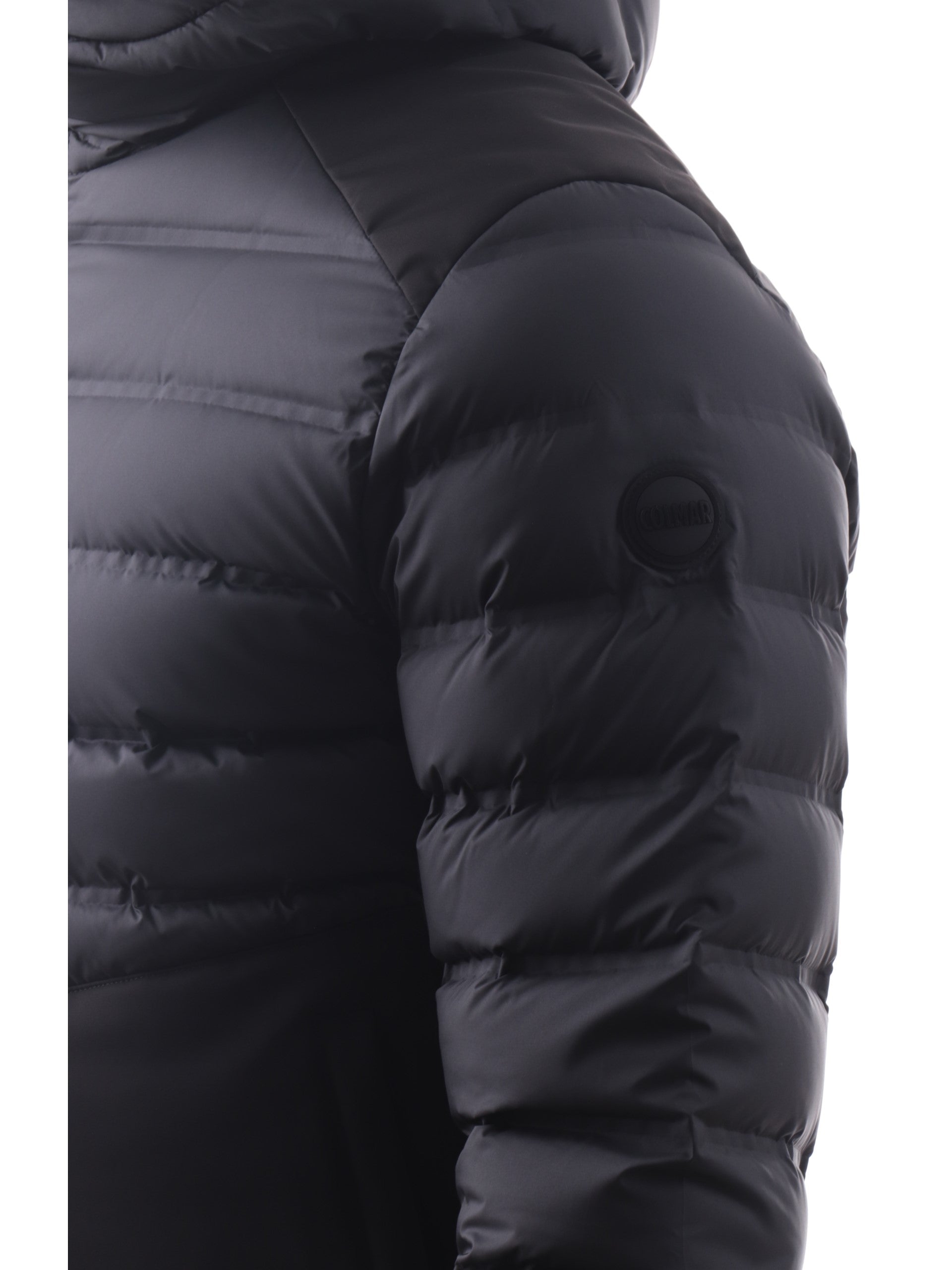 Piumino Colmar nero da uomo. Questo piumino Colmar da uomo, realizzato da tessuto in piuma trapuntato con inserti lisci, è ideale per climi rigidi, per le temperature molto fredde e protegge dalla piogga. Questo piumino Colmar nero da uomo è caratterizzato da cappuccio fisso regolabile con lacci, chisura centrale full zip con doppio cursore, due tasche laterali con zip, fondo elasticizzato e regolabile con lacci, tasca interna con zip e il logo del brand applicato sulla manica sinistra