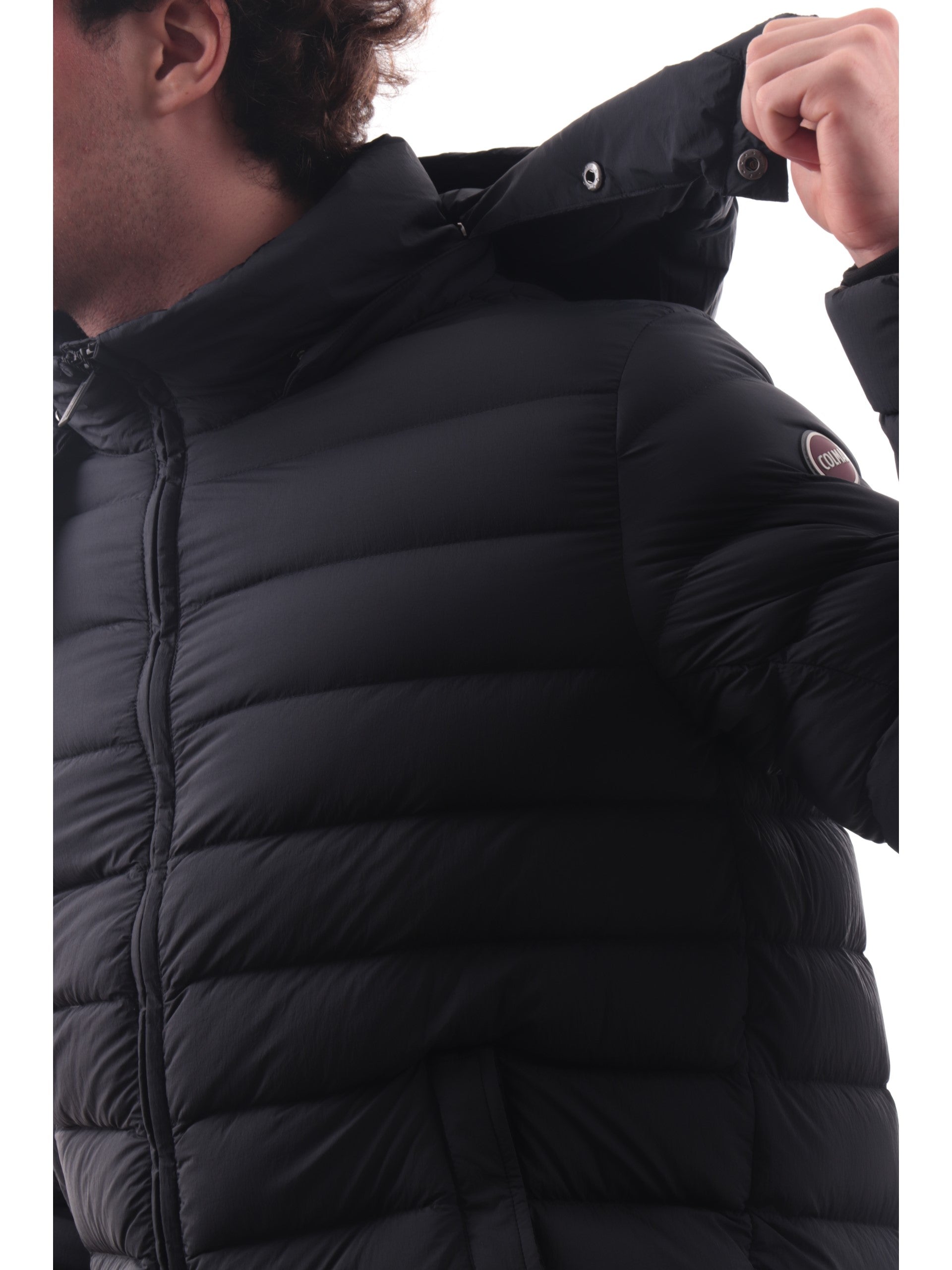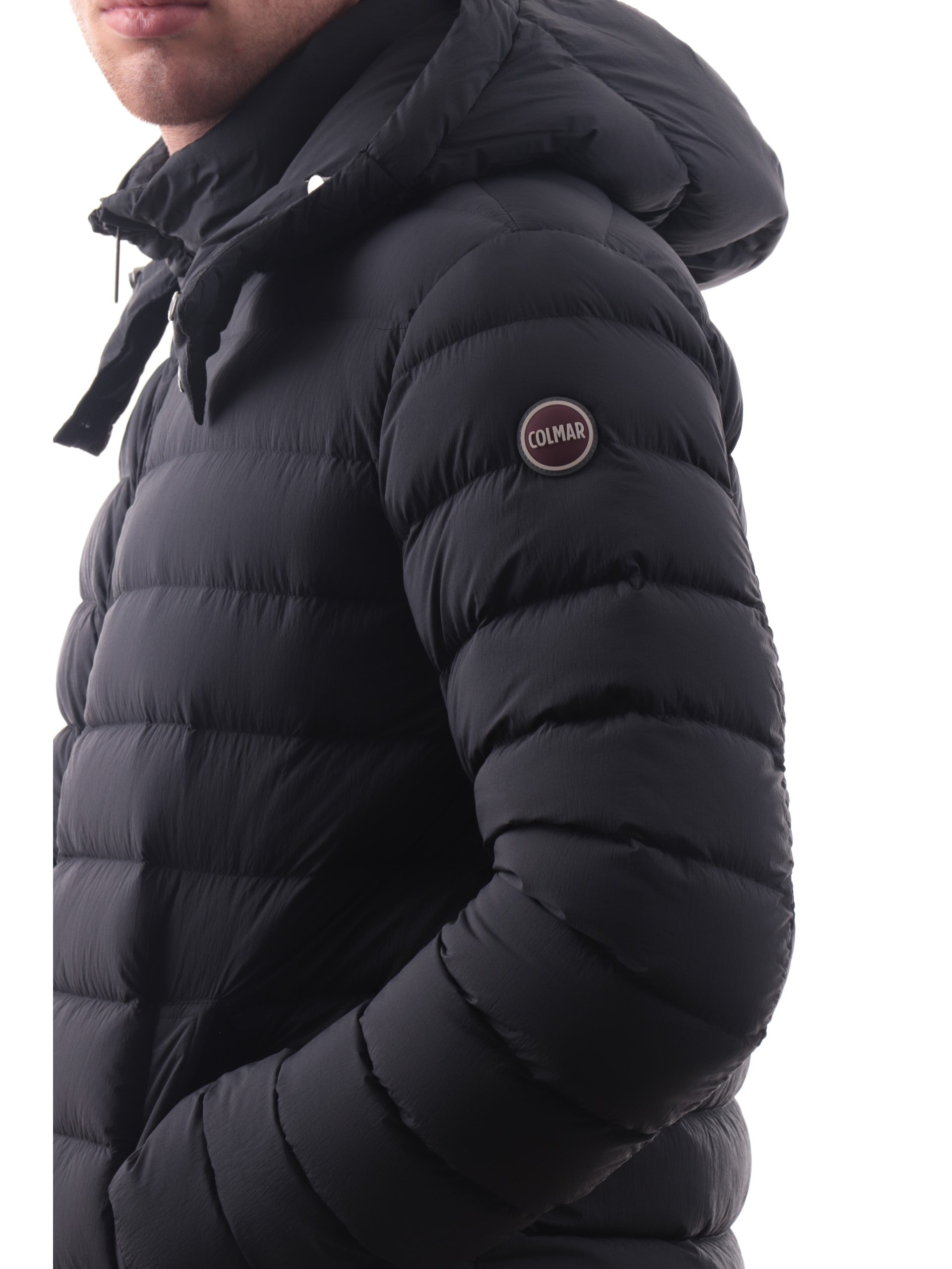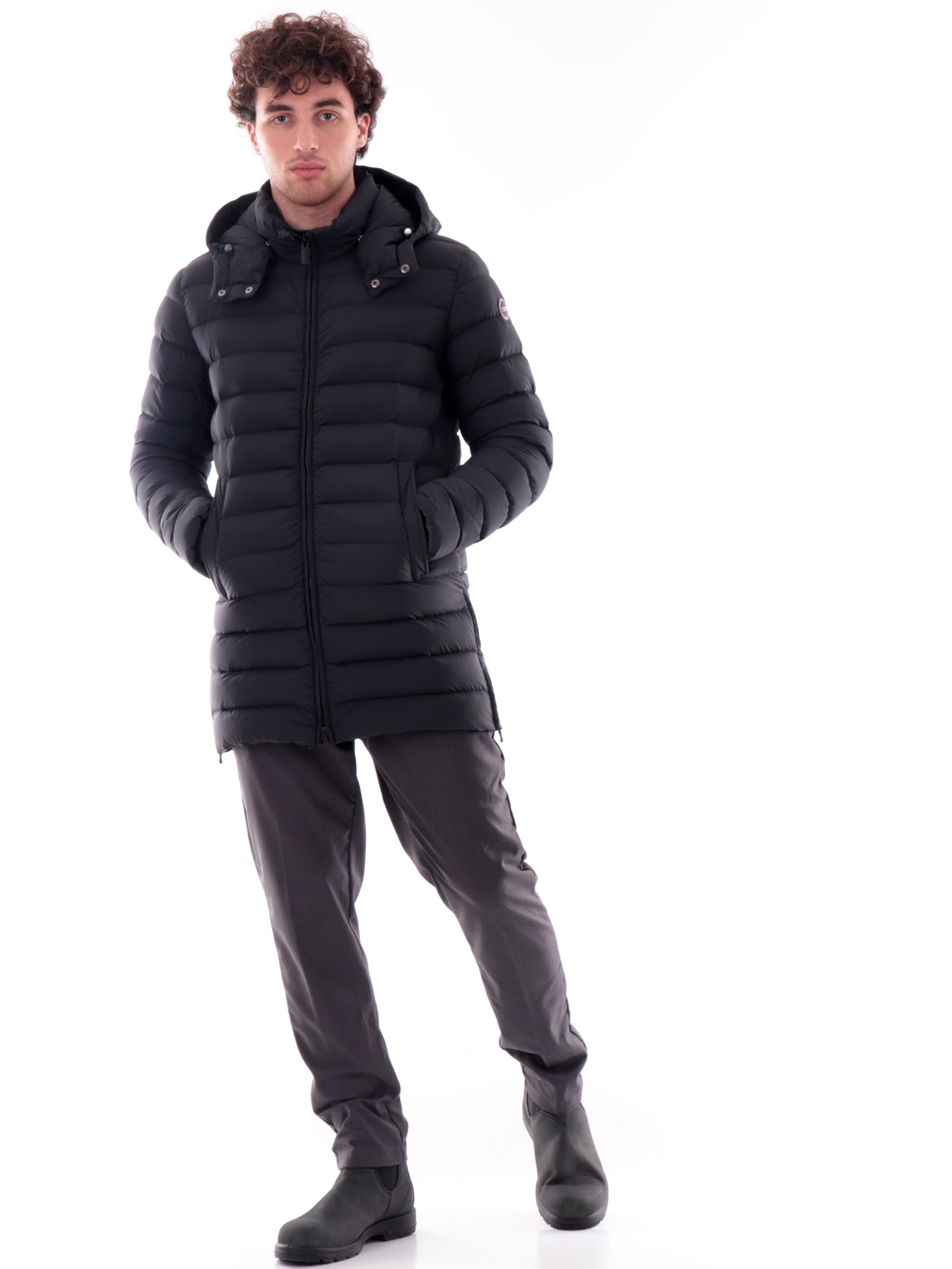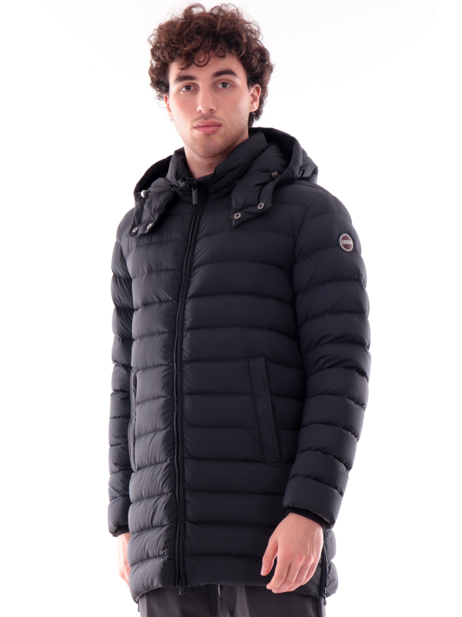 Piumino lungo Colmar nero da uomo. Questo piumino nero Colmar da uomo è realizzato da un imbottitura di vera piuma, caldo ed avvolgente. L'iconico giubbino colmar con colletto e bottone è caratterizzato da cappuccio fisso removibile, chiusura centrale full zip, due tasche laterali con zip, polsini e fono elasticizzati e il logo del brand applicato sulla manica sinistra. All'interno di questo piumino troviamo una tasca interna con la chiusura a zip. Questo capo è perfetto per i primi freddi invernali