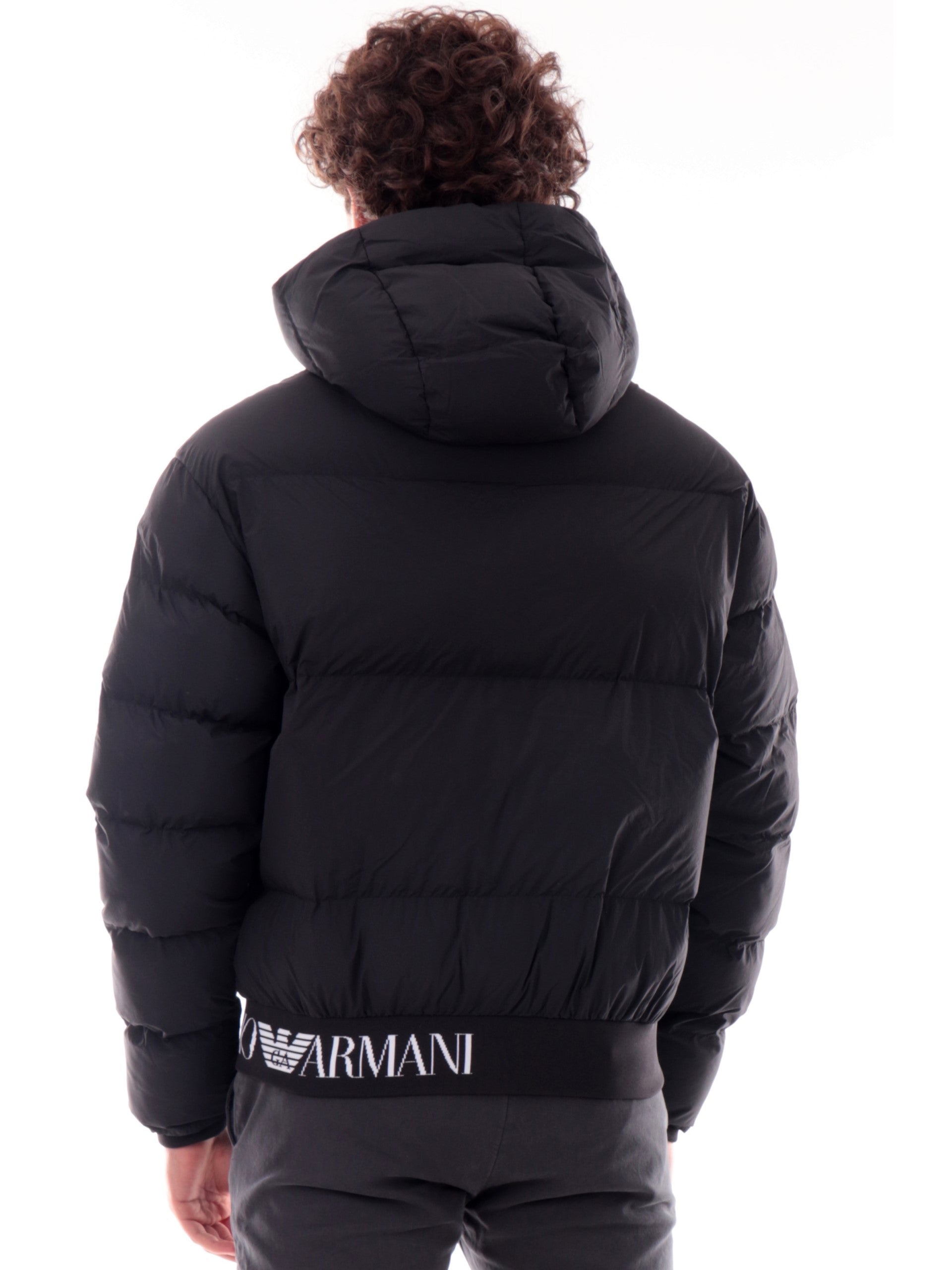 Piumino nero EA7 da uomo. Questo piumino Emporio Armani nero da uomo è realizzato da un imbottitura calda ed avvolgente perfetto per l'inverno, è caratterizzato da collo alto, cappuccio fisso regolabile con lacci, chiusura full zip centrale con doppio cursore, due tasche laterali con zip,una tasca interna con zip, polsini e fondo elasticizzati e il logo EA7 applicato sul lato cuore, Sul fondo di questo Giubbino emporio Armani troviamo la maxi scritta del brand
