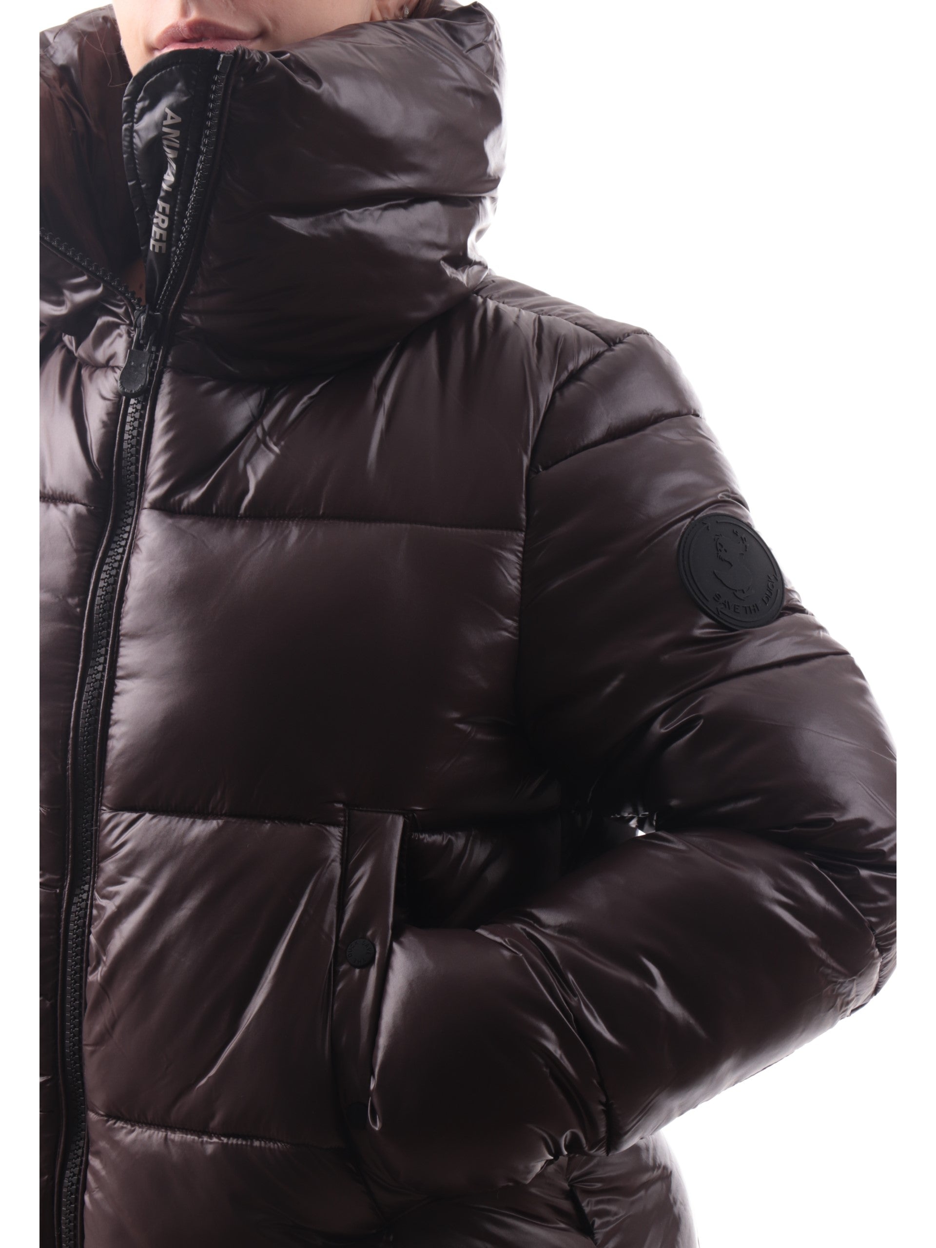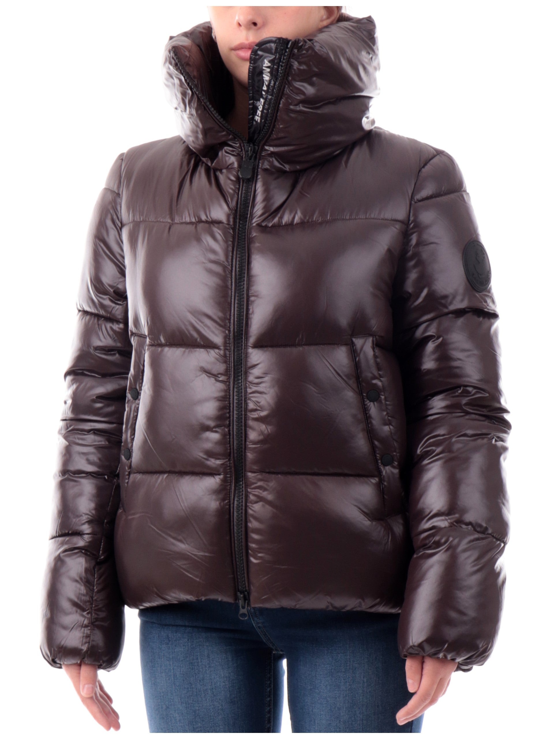 Piumino Save the Duck marrone da donna con collo alto e tasche. Questo Save the Duck marrone lucido modello Isla è realizzato in imbottitura ecologica cruelty free, e tessuto marrone lucido. Questo piumino marrone da donna ha il collo alto antivento e la cerniera moderna sul davanti.
