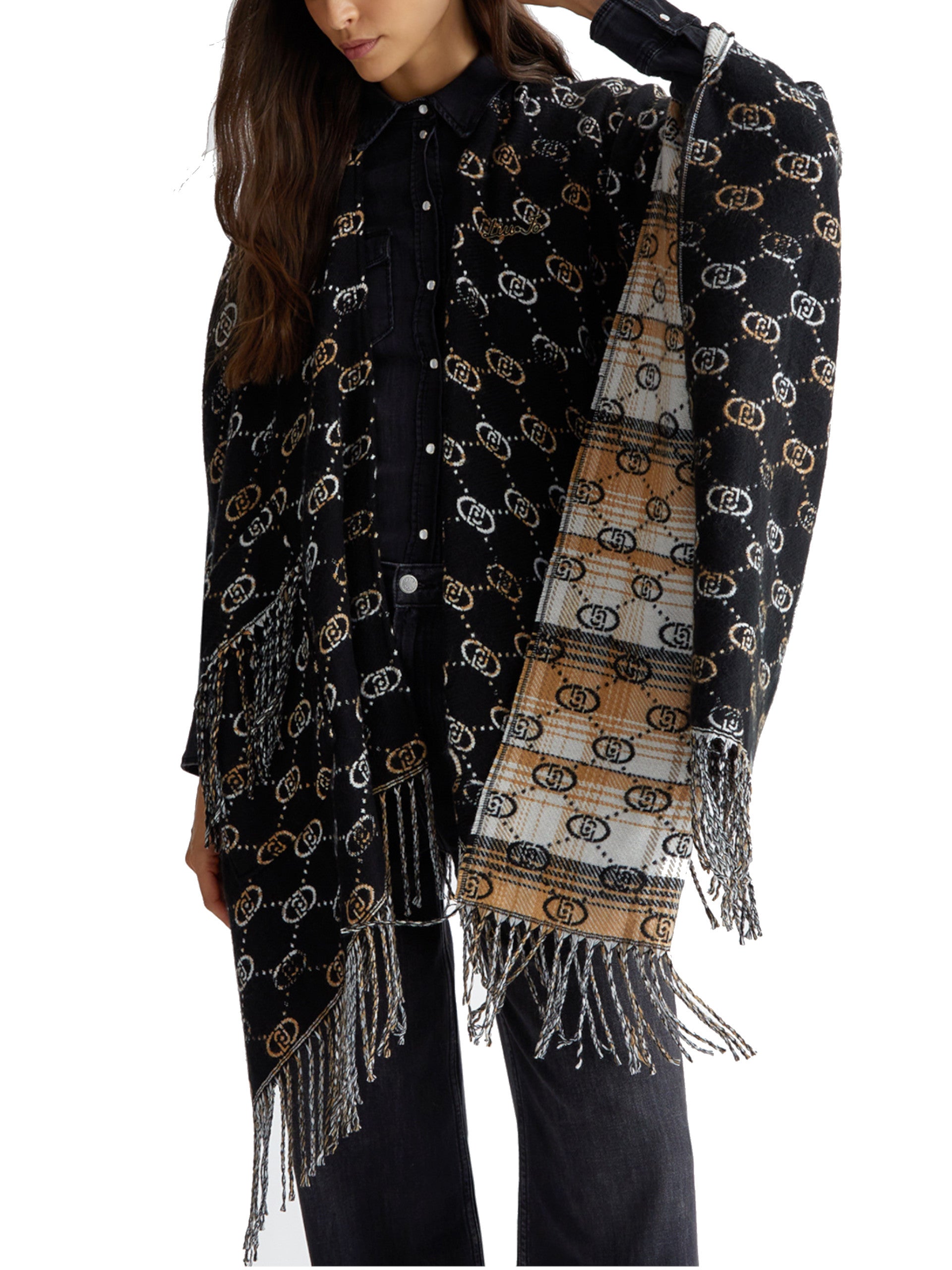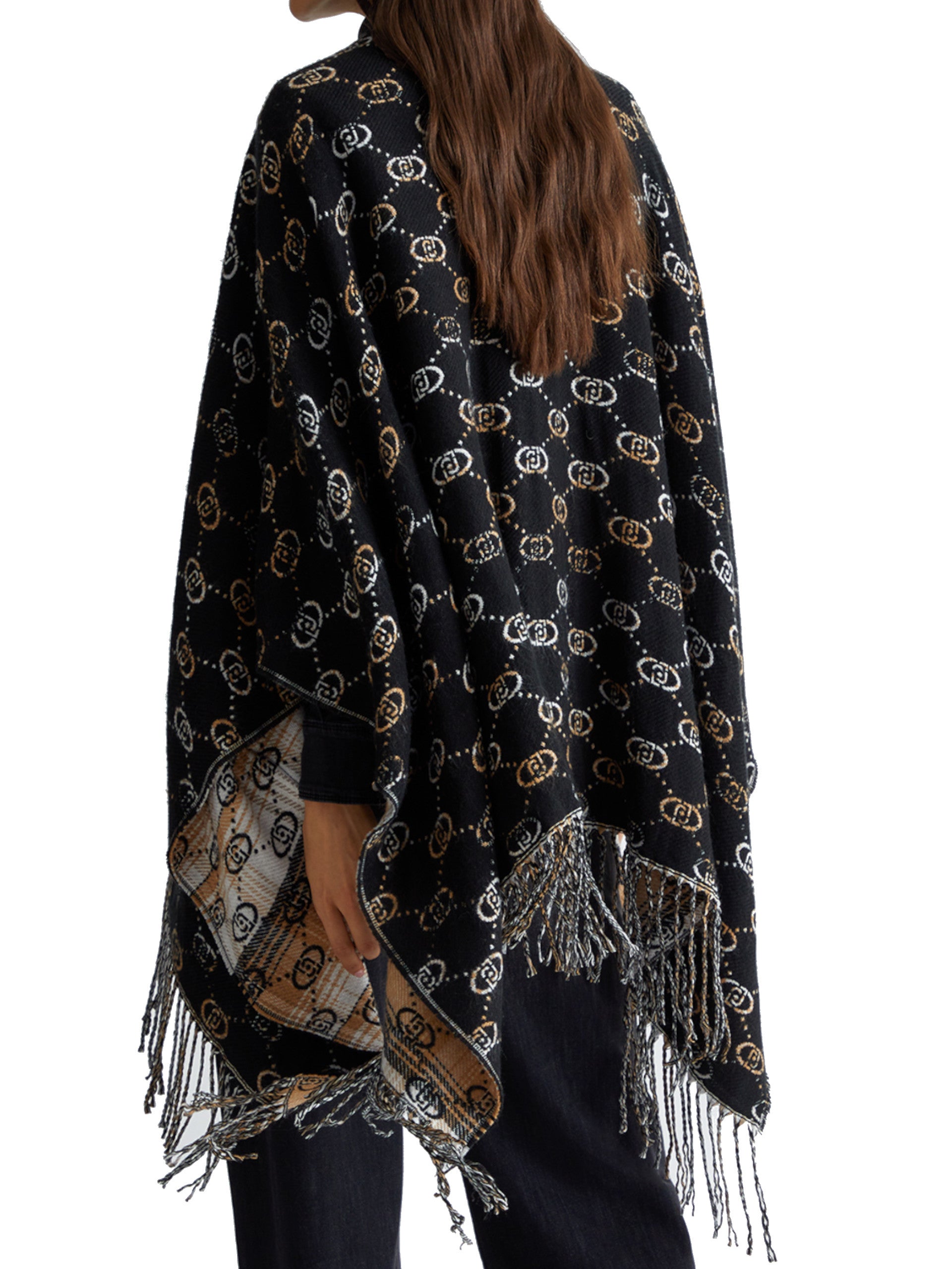 Poncho Liu Jo nero Mix Pattern da donna logo a contrasto 2F4014T0300. Questa sciarpa foulard Liu Jo nera ha gli orli sfrangiati e la fantasia logo all over a contrasto colore.