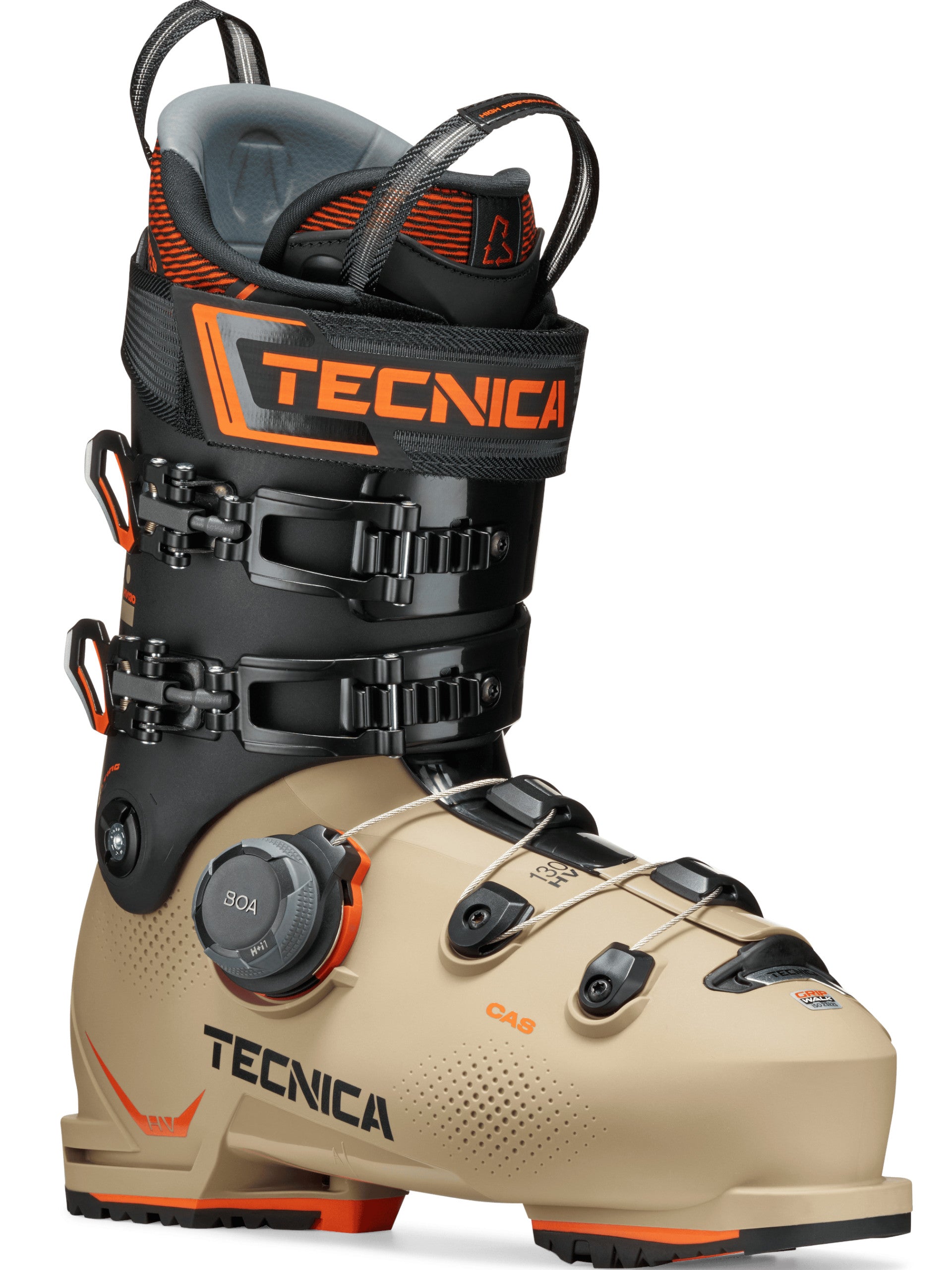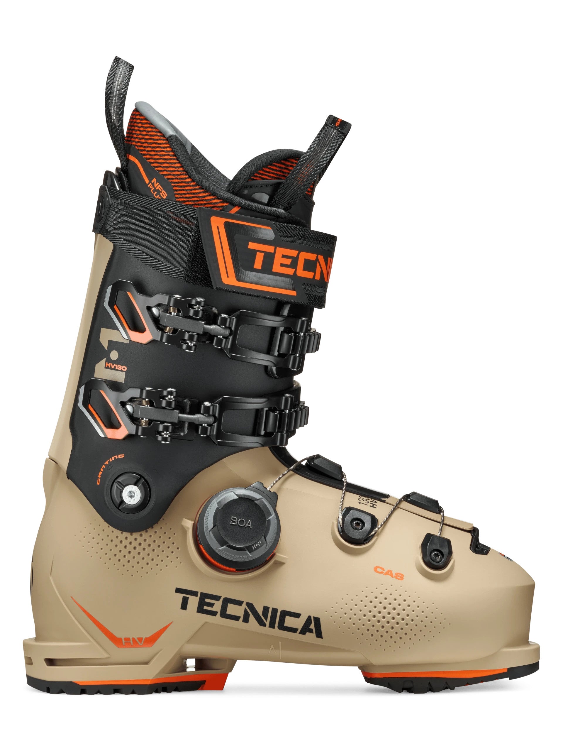 Scarponi da sci beige da uomo Tecnica Mach Boa HV 130 GW. Questi scarponi da sci beige sono realizzati da una calzata precisa e performante con flex 130, caratterizzati da uno scafo ad alto volume che si combina perfettamente con il BOA Fit System, questo scarpone offre un comfort senza precedenti unito alle prestazioni Tecnica, permettendoti di affrontare qualsiasi condizione sulla neve. Questi scarponi da sci da uomo sono realizzati da diverse tecnologie: C.A.S. Shell, N.F.S Liner e Boa thecnology. La tecnologia C.A.S Shell, Lo scafo C.A.S ha una forma anatomica compatibile con la forma delpiede. Questo permette una calzata migliore, i piccoli avvallamenti sullo scafo offrono una minore tensione superficiale che favorisce il riscaldamento, rendendo possibile una più facile personalizzazione dello scafo. Lo scafo mantiene la nuova forma più a lungo.