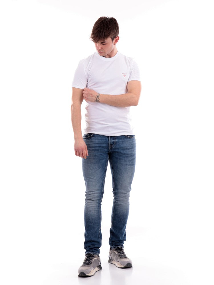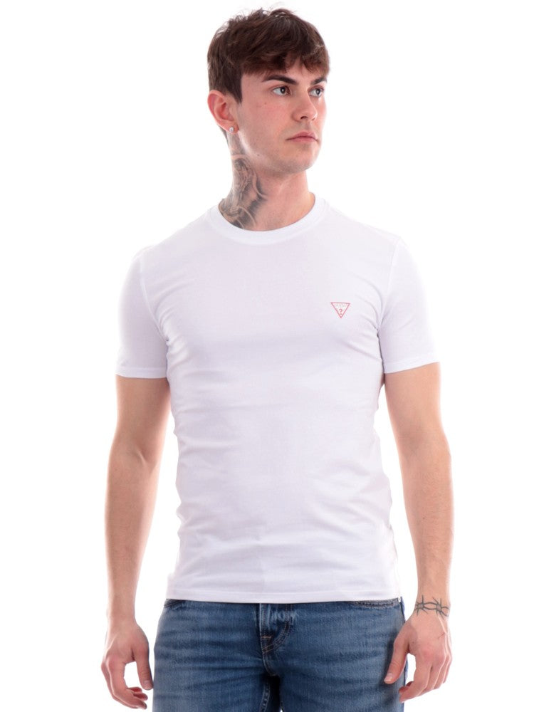 T-shirt Guess bianca da uomo M2YI24J1314, realizzata in morbido cotone. Questa maglia Guess bianca ha il girocollo, le maniche corte, il fondo regolare e il logo del brand sul cuore a contrasto colore.