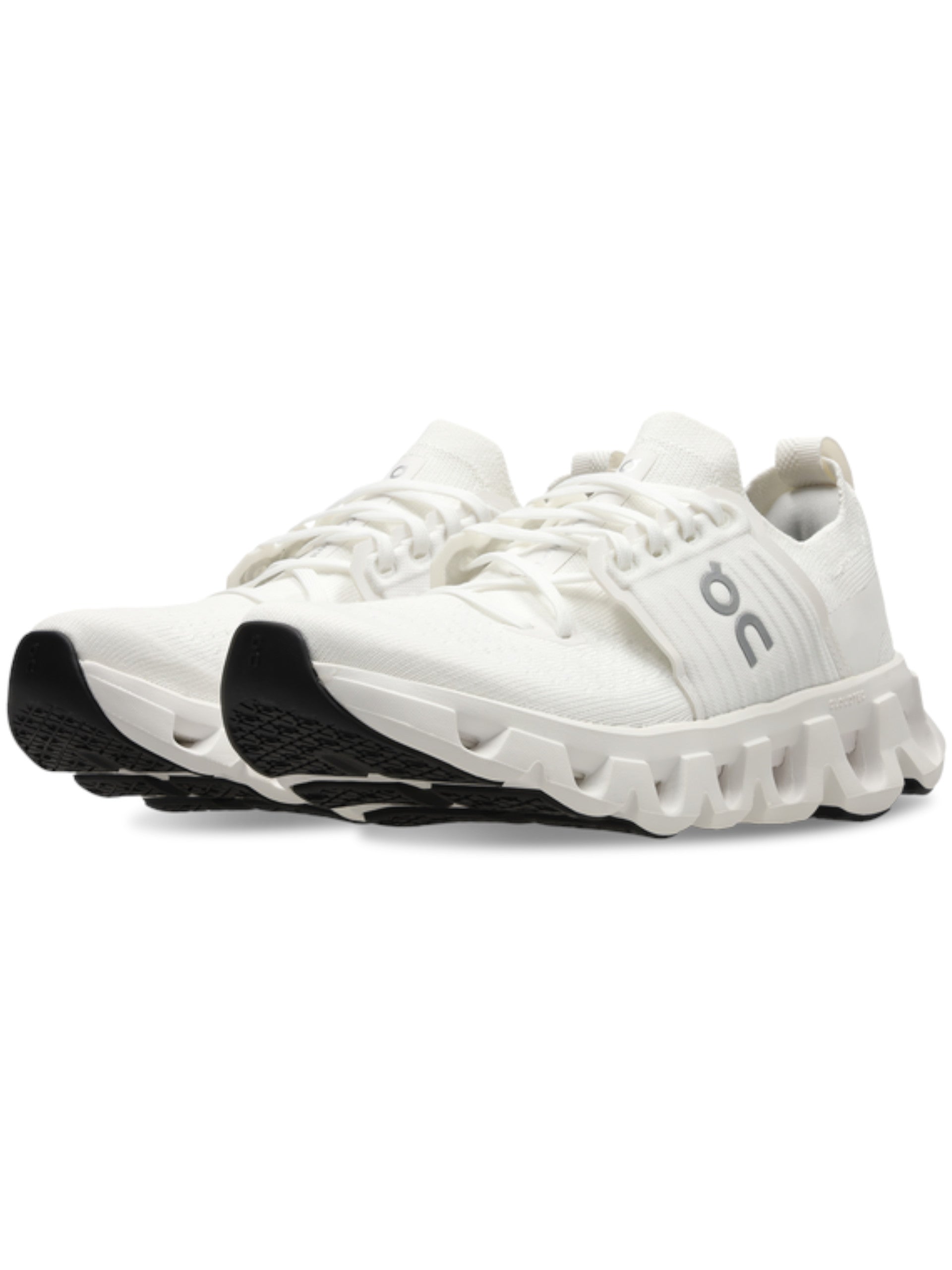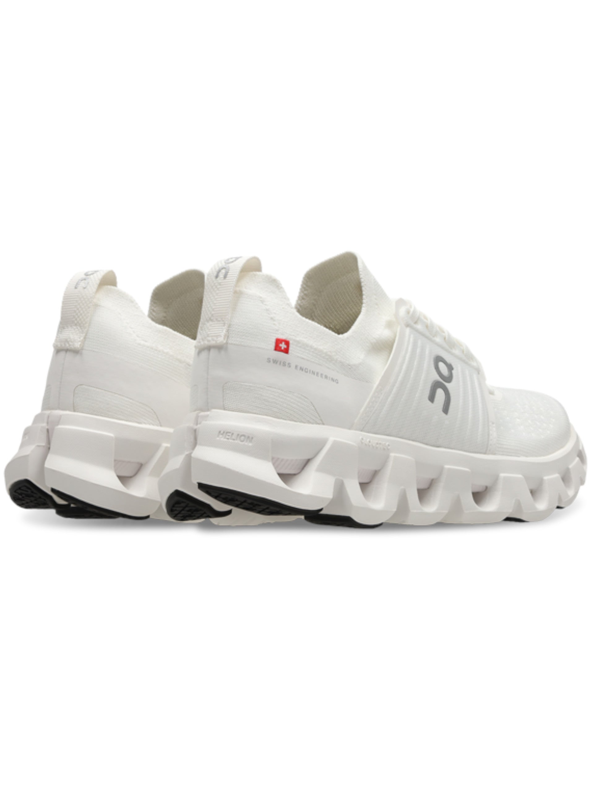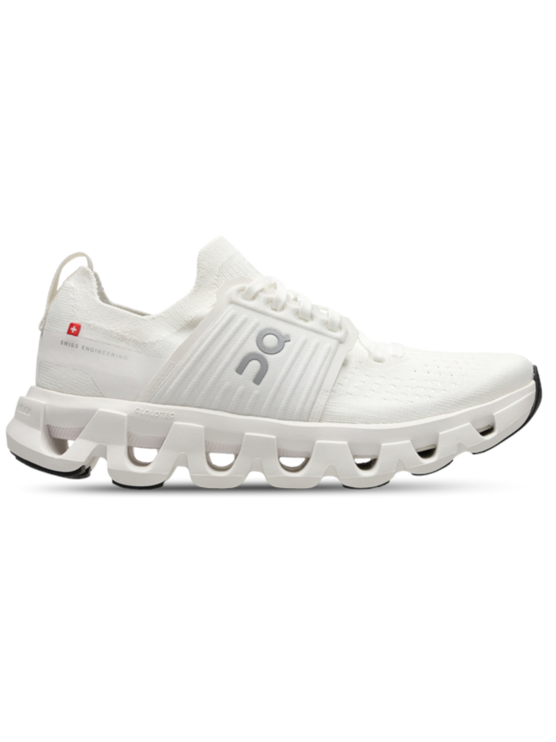 Scarpe On bianche Cloudswift 4 da donna 3WF1011120. Queste scarpe da running On bianche hanno la tomaia realizzata in tessuto traspirante, la chiusura con lacci, la suola in gomma traforata per massimizzare le tue performance e il sottosuola con trama antiscivolo per garantire cambi di direzioni puliti ed efficaci. Patch applicato ambo i lati.