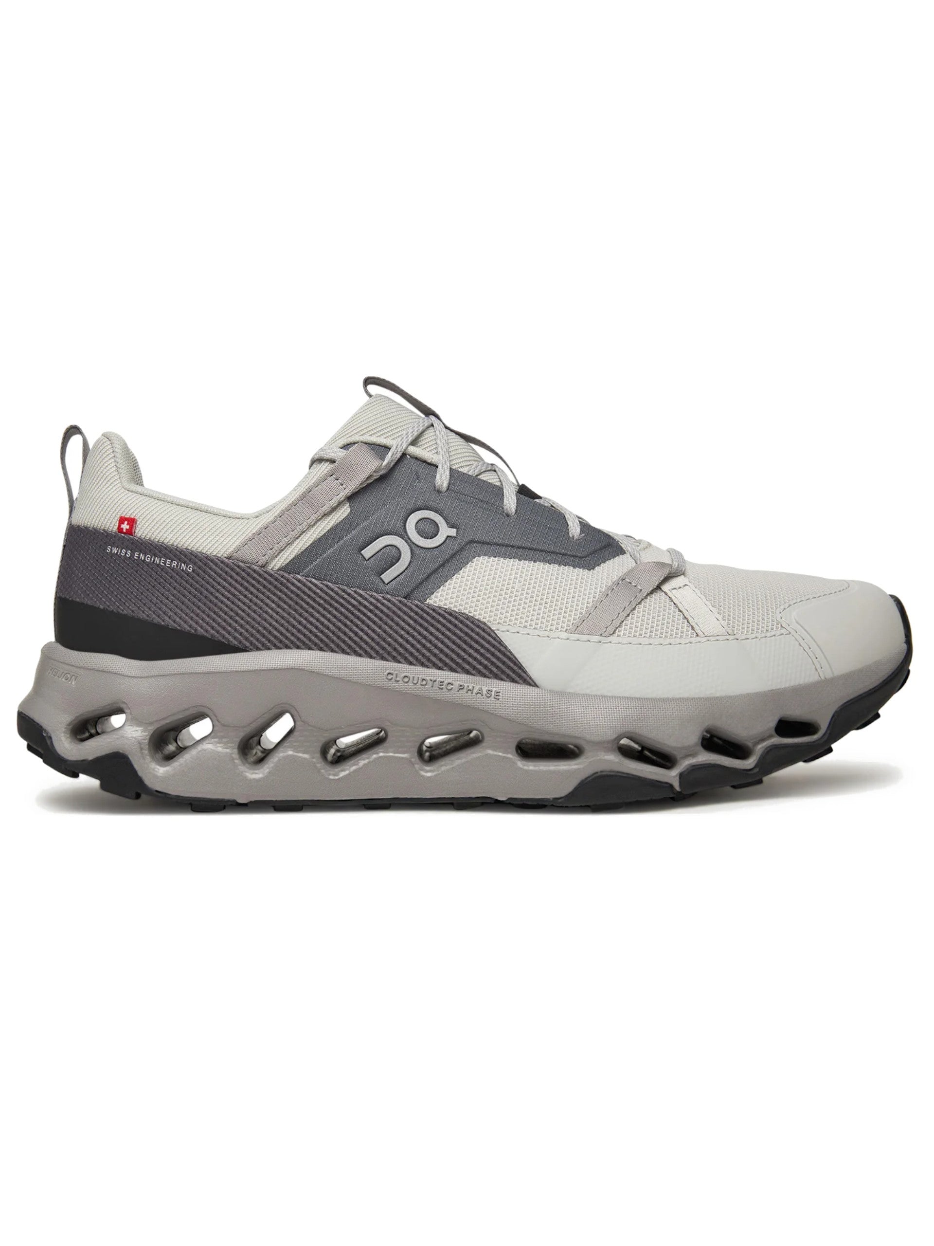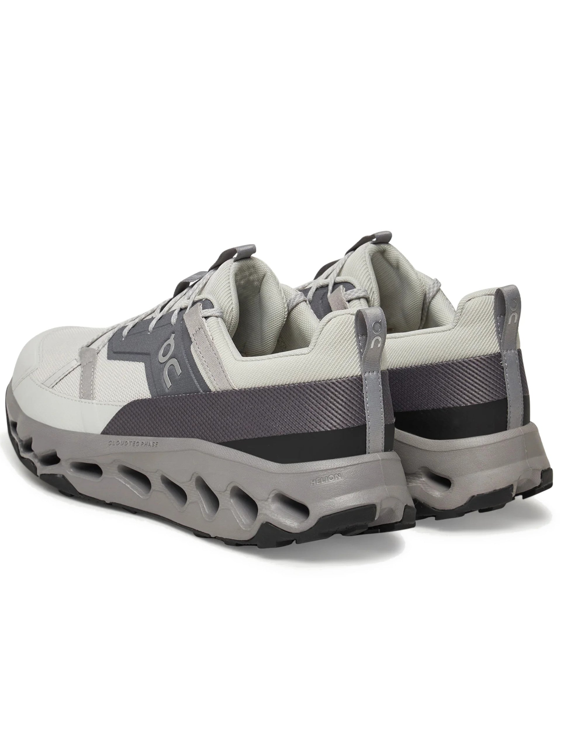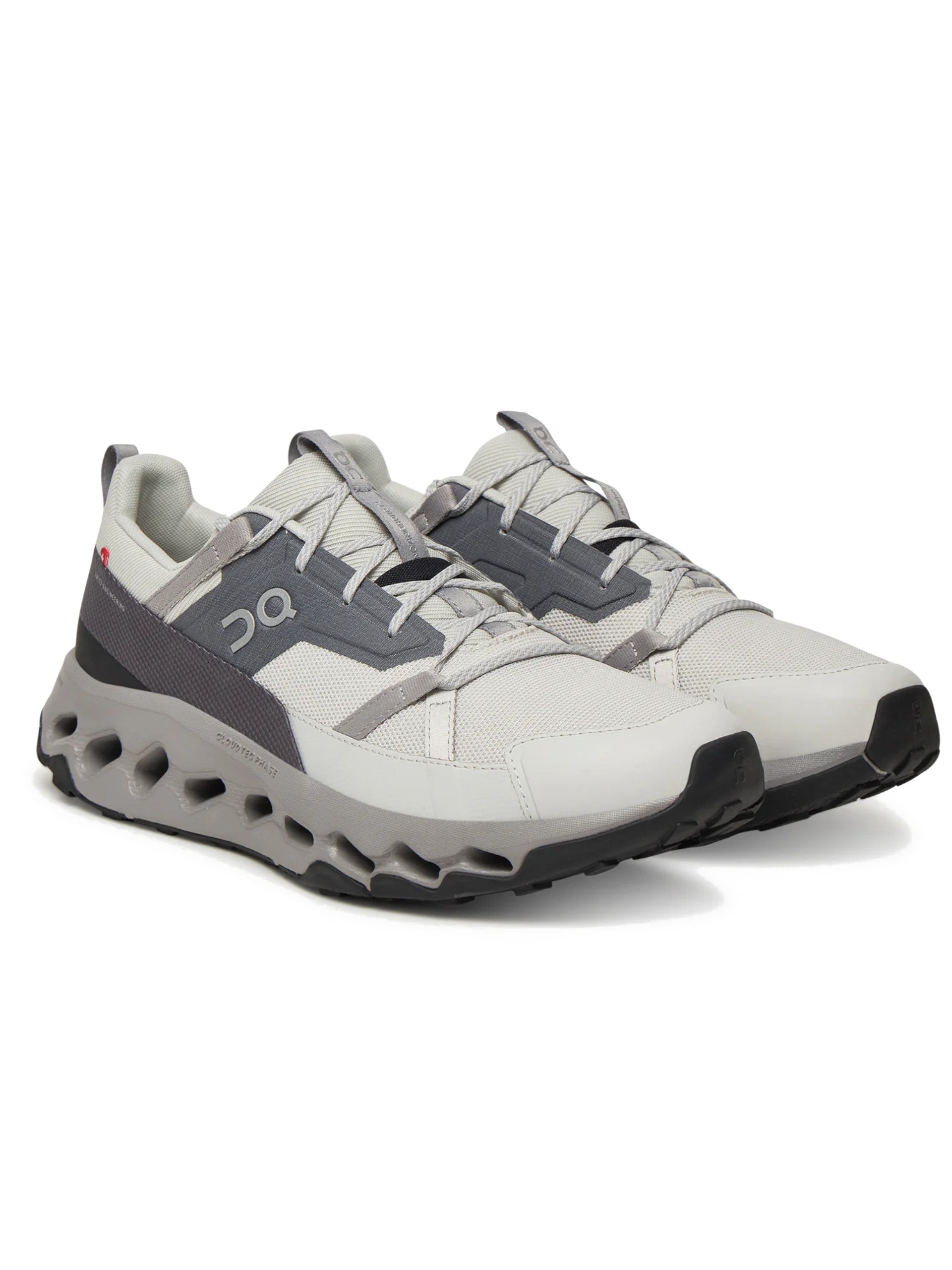Scarpe On grigie e bianche Cloudhorizon da uomo 3ME1003329. Queste scarpe da running On grigie hanno la tomaia realizzata in tessuto traspirante, la chiusura con lacci, la suola in gomma traforata per massimizzare le tue performance e il sottosuola con trama antiscivolo per garantire cambi di direzioni puliti ed efficaci. Patch gommato con lettering 'Cloudtechphase'.