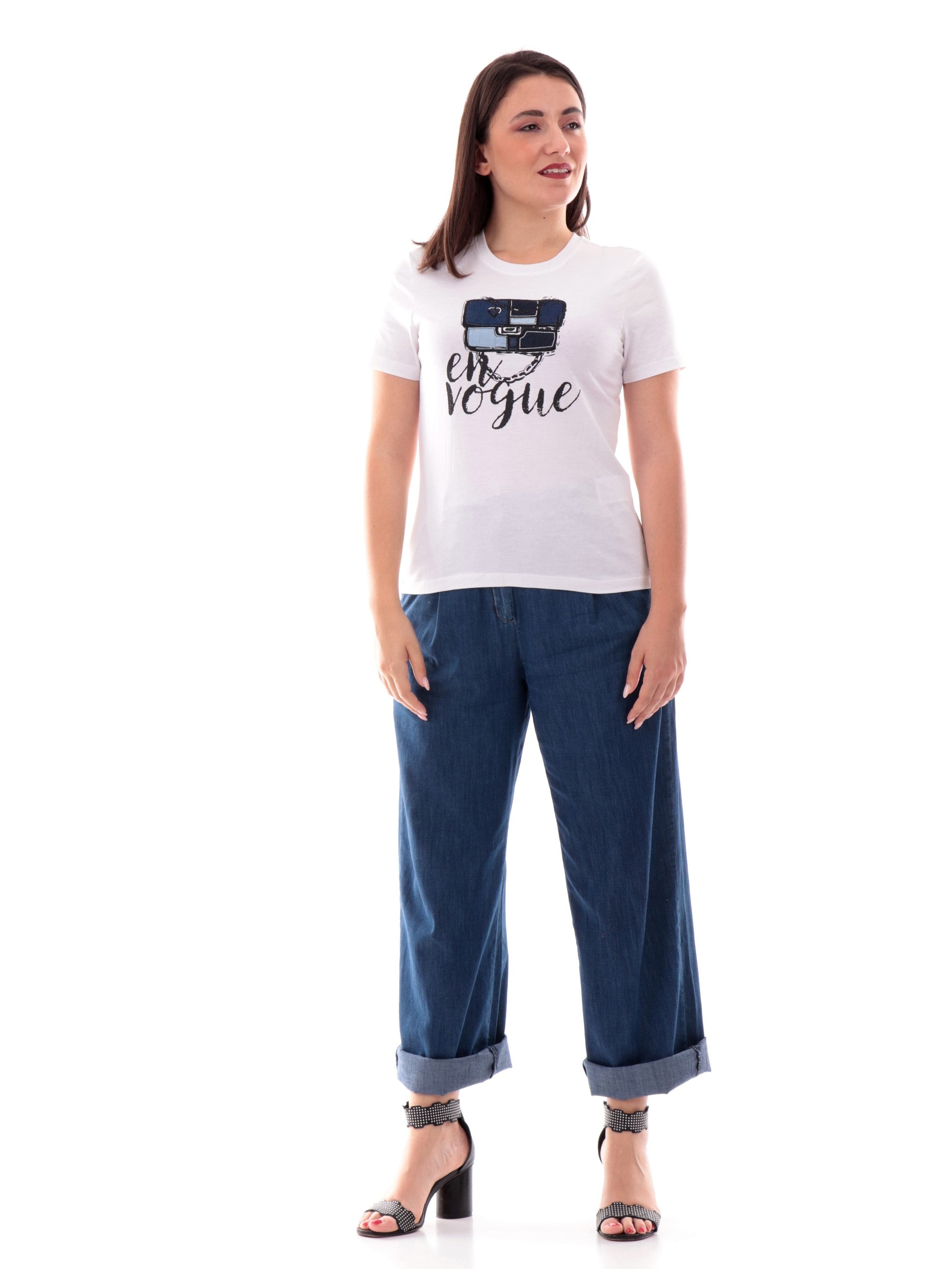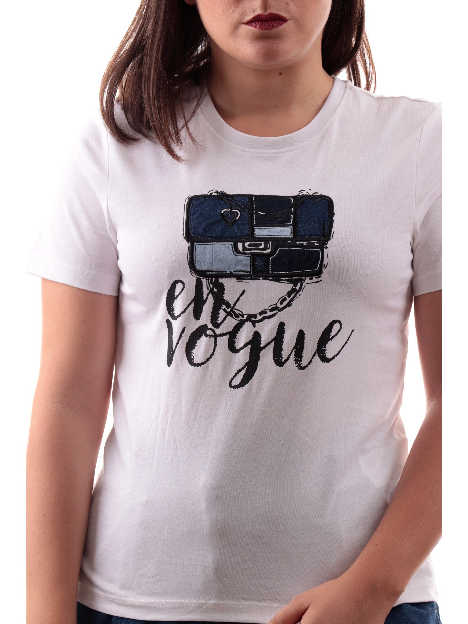 Maglia Only bianca girocollo da donna con stampa e patch borsa 15329752, realizzata in 100% puro cotone. Questa t-shirt Only bianca girocollo ha le maniche corte e la stampa con patch fiocco.