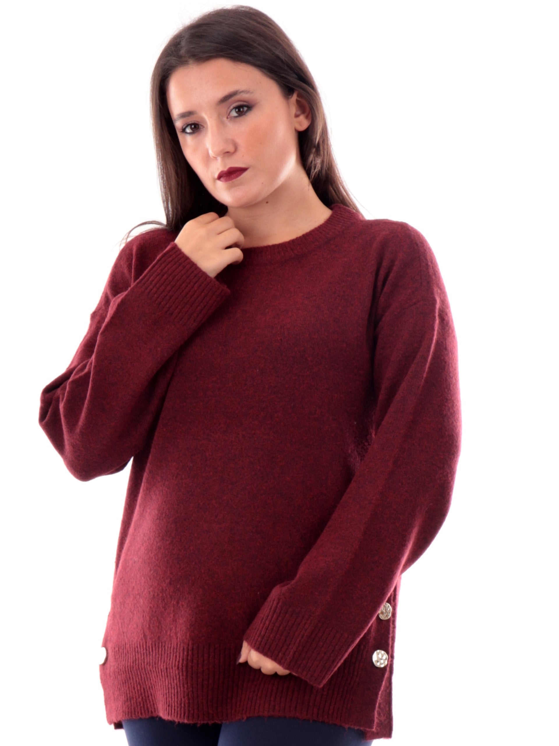 Maglione Only bordeaux da donna con bottoni oro sul fondo realizzati con finitura martellata . Questo maglione Only è realizzato in tessuto morbido e soffice al tatto. La vestibilità over ti permettedi utilizzarlo anche con i leggins!