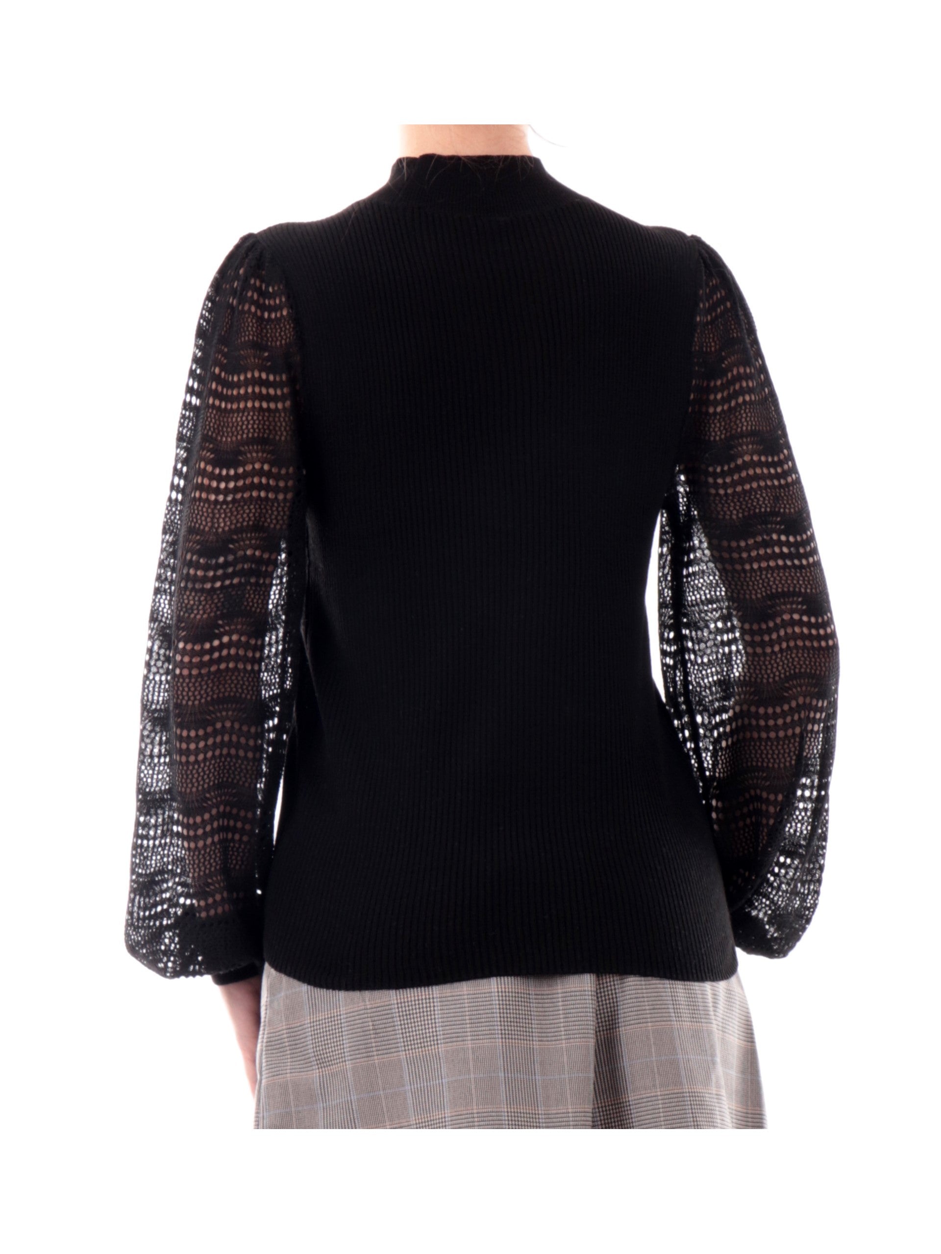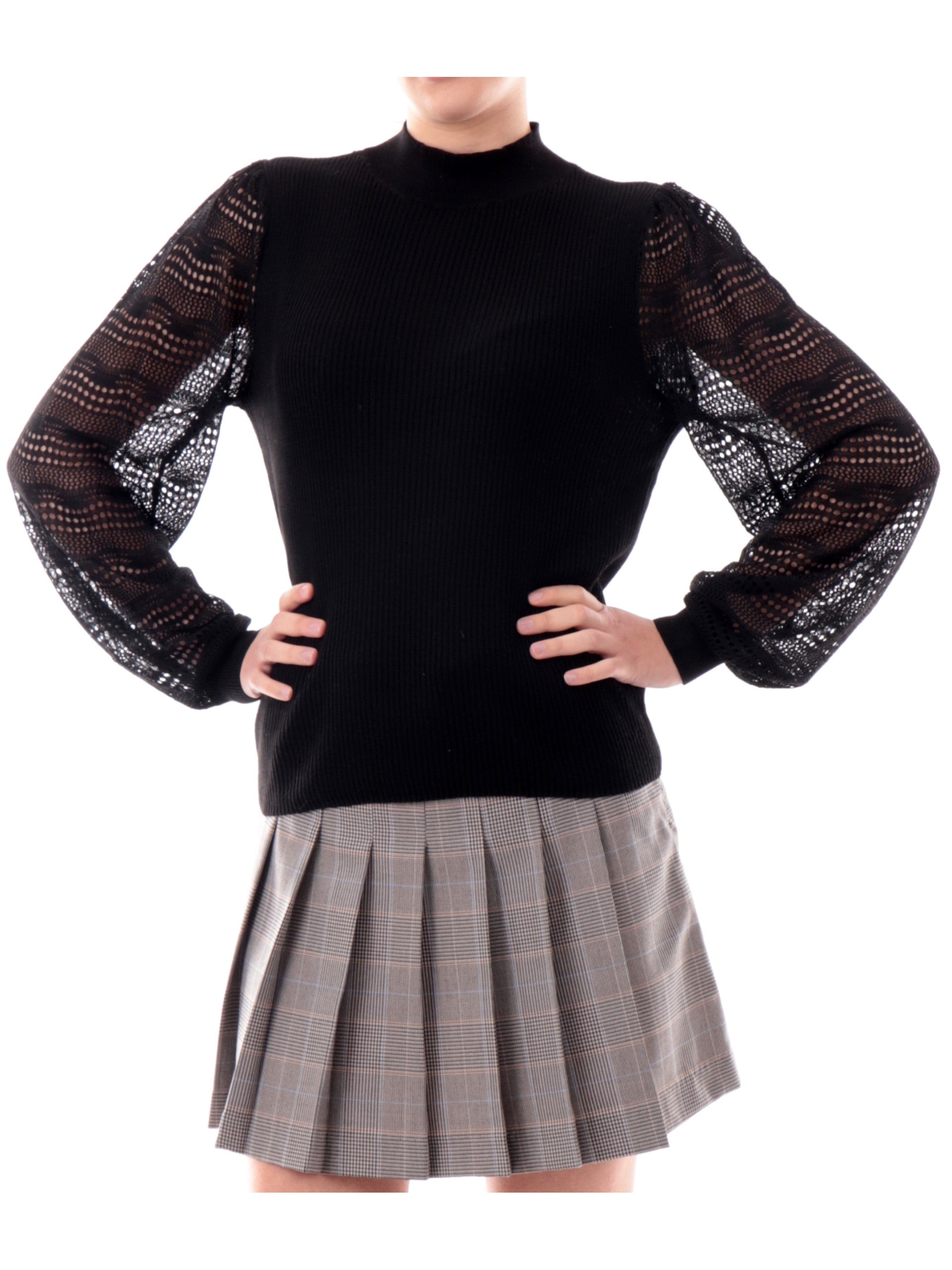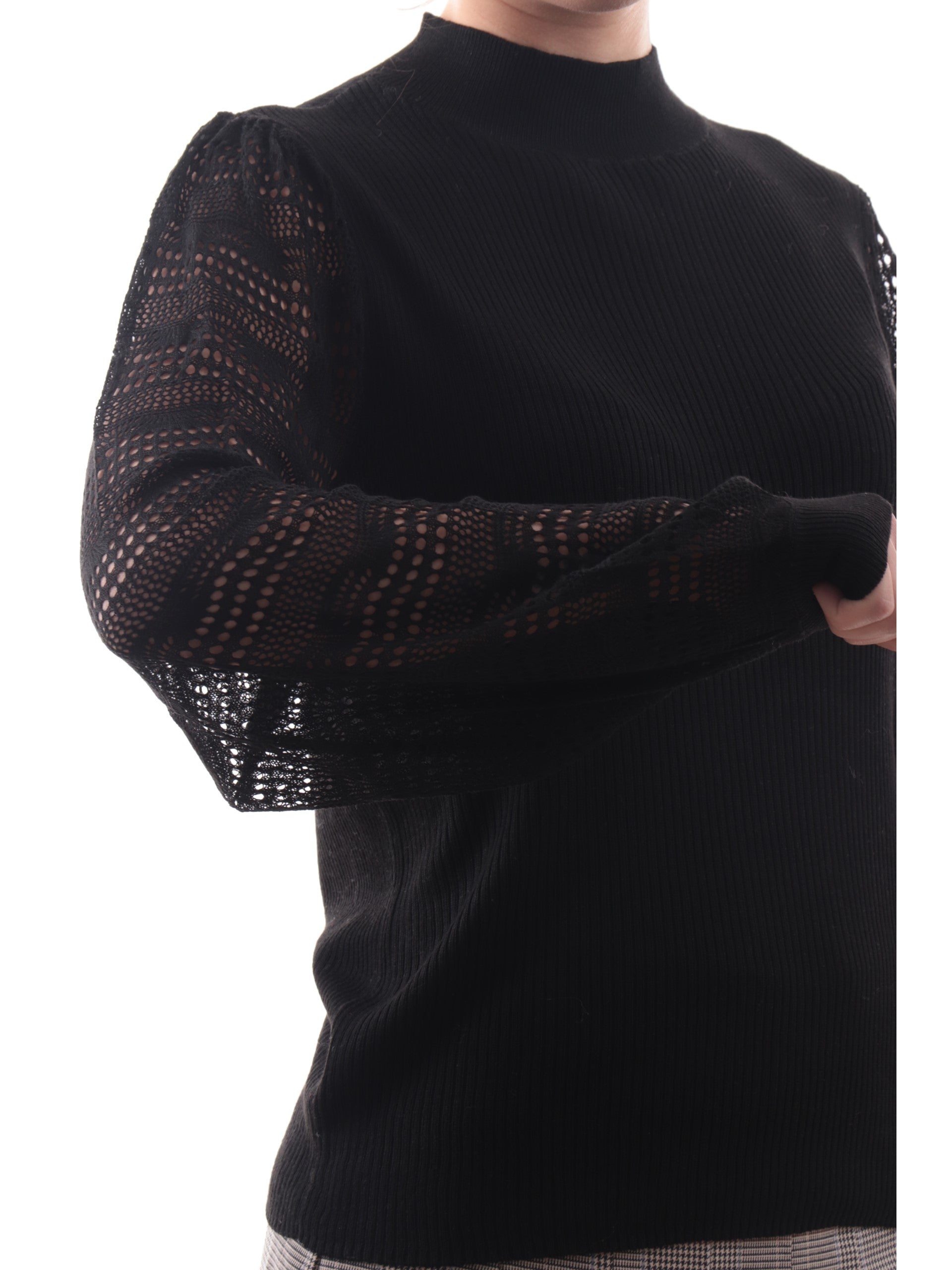 Maglione Only nero da donna girocollo Highneck. Questo maglione da donna Only nero è realizzato da un soffice ed avvolgente tessuto a costine. Questa maglia è caratterizzata da un tessuto traforato sulle maniche con polsini elasticizzati e si può abbinarlo come si preferisce