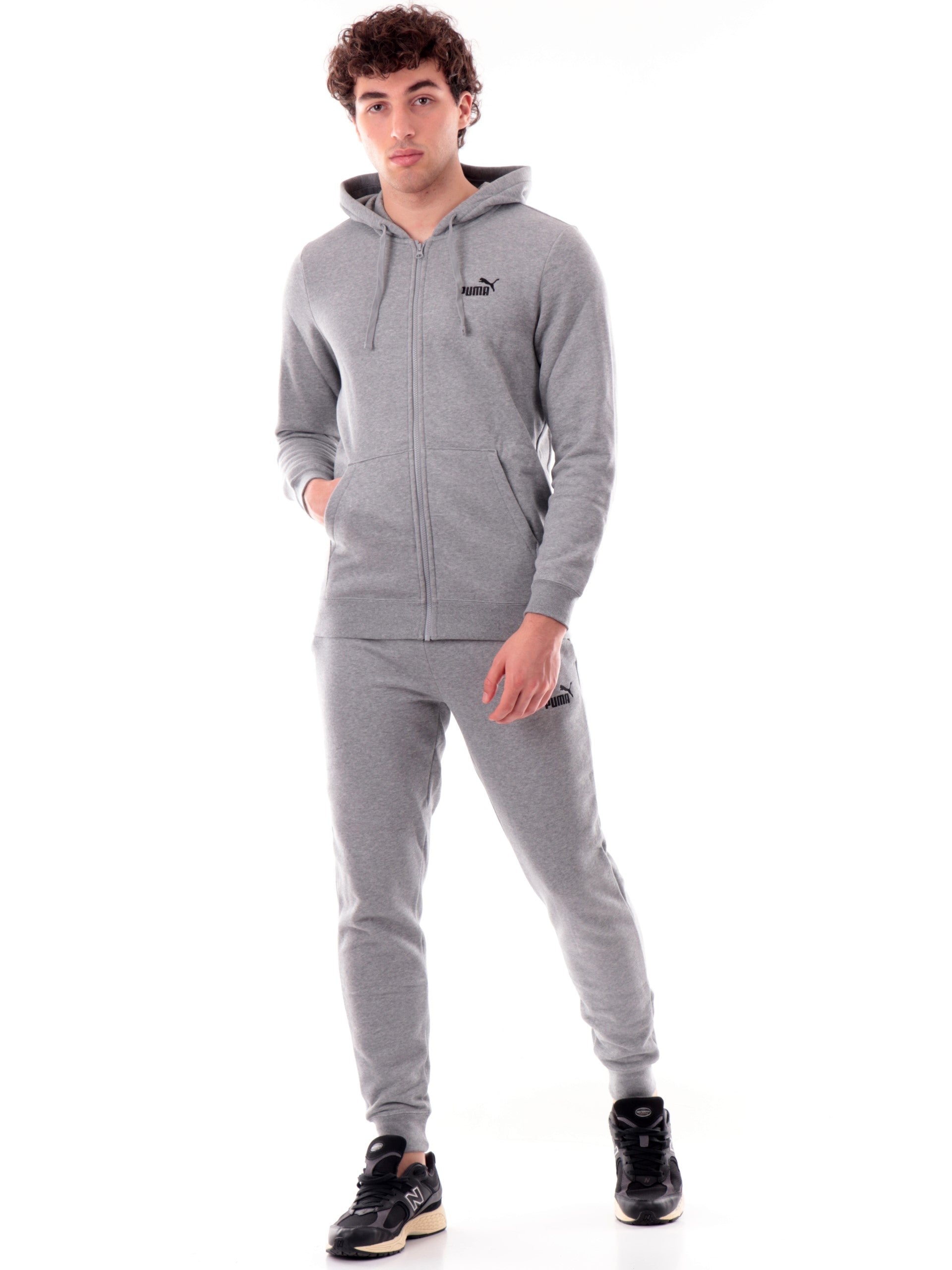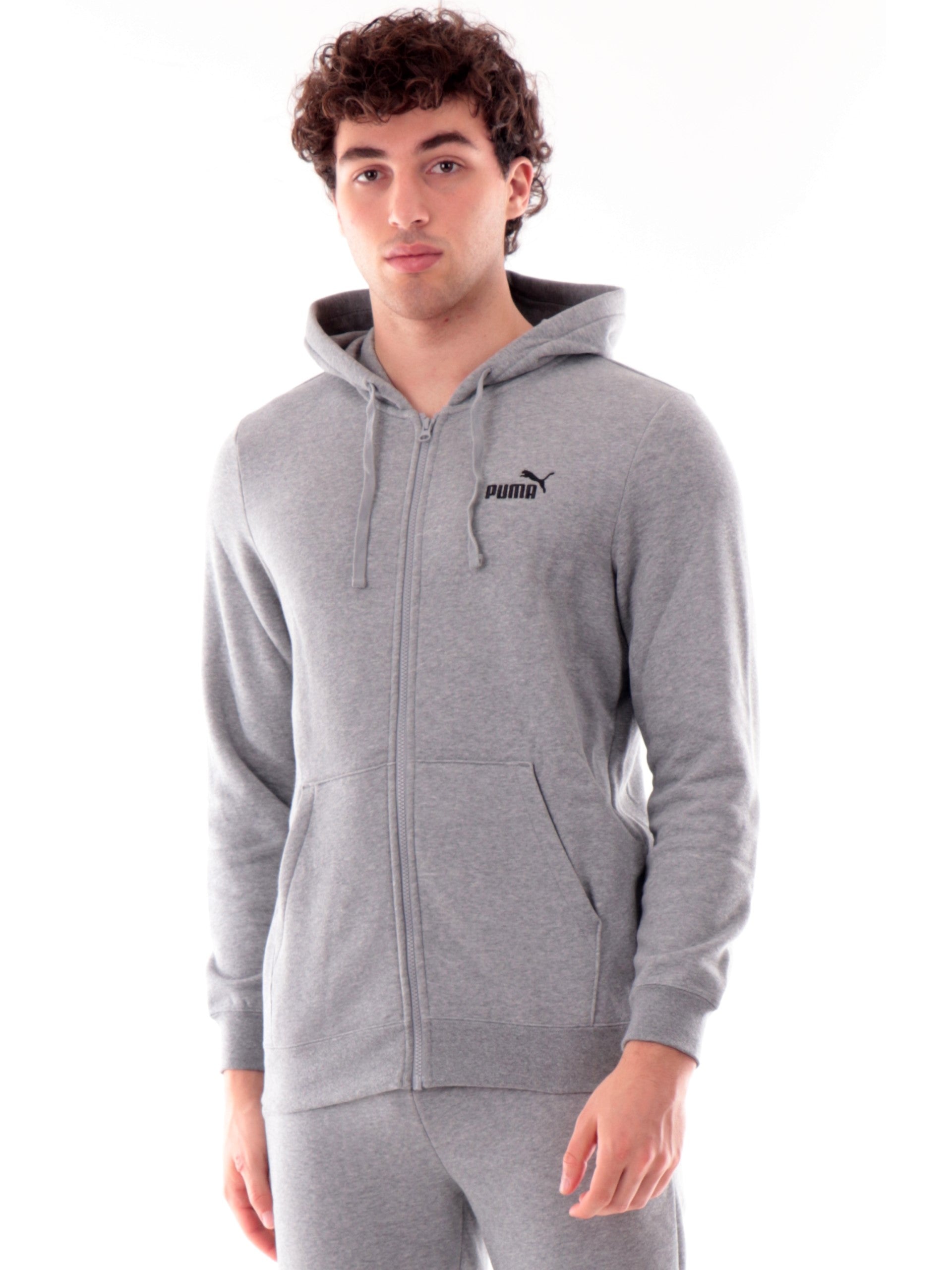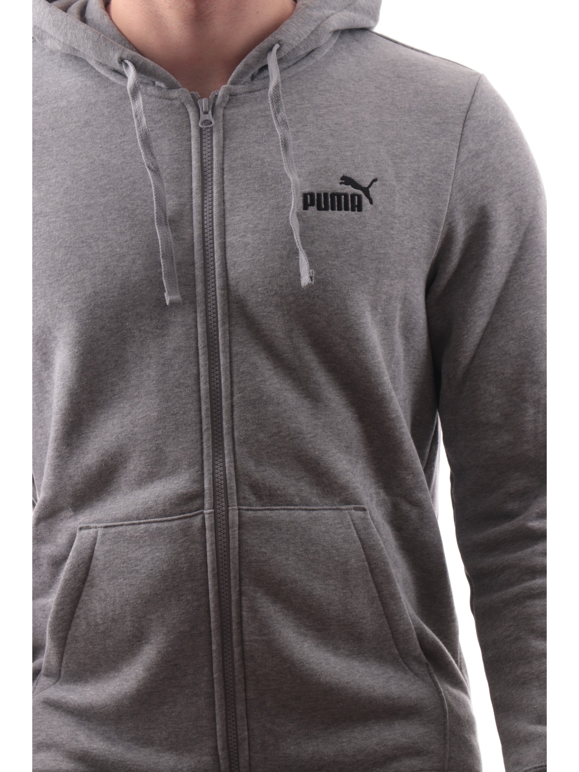 Felpa Puma grigia full zip da uomo con cappuccio 682586, realizzata in cotone. Questa felpa uomo Puma grigia ha il cappuccio fisso regolabile con laccetti, la chiusura full zip centrale, due tasche laterali aperte, il logo Puma ricamato lato cuore, polsini e fondo elasticizzati.