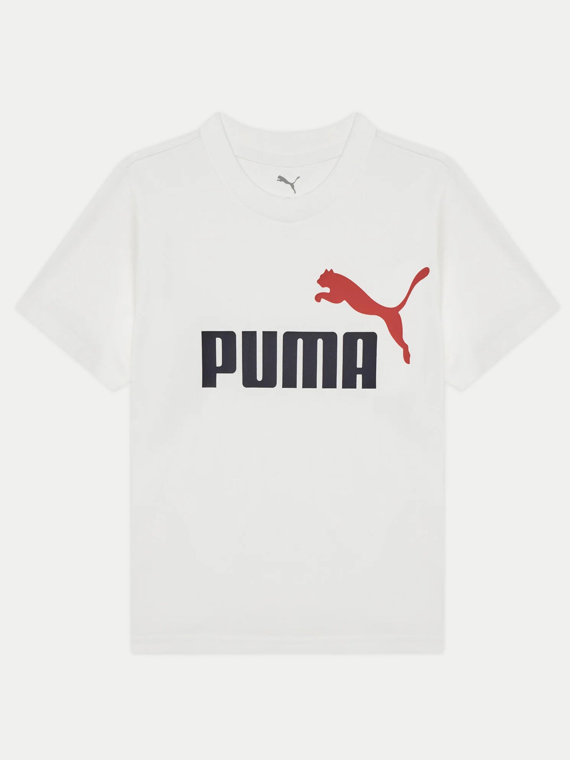 Maglia Puma bianca da bambino stampa logo color 685778, realizzata in 100% puro cotone. Questa t-shirt Puma girocollo ha le maniche corte e la maxi stampa logo color sul davanti.