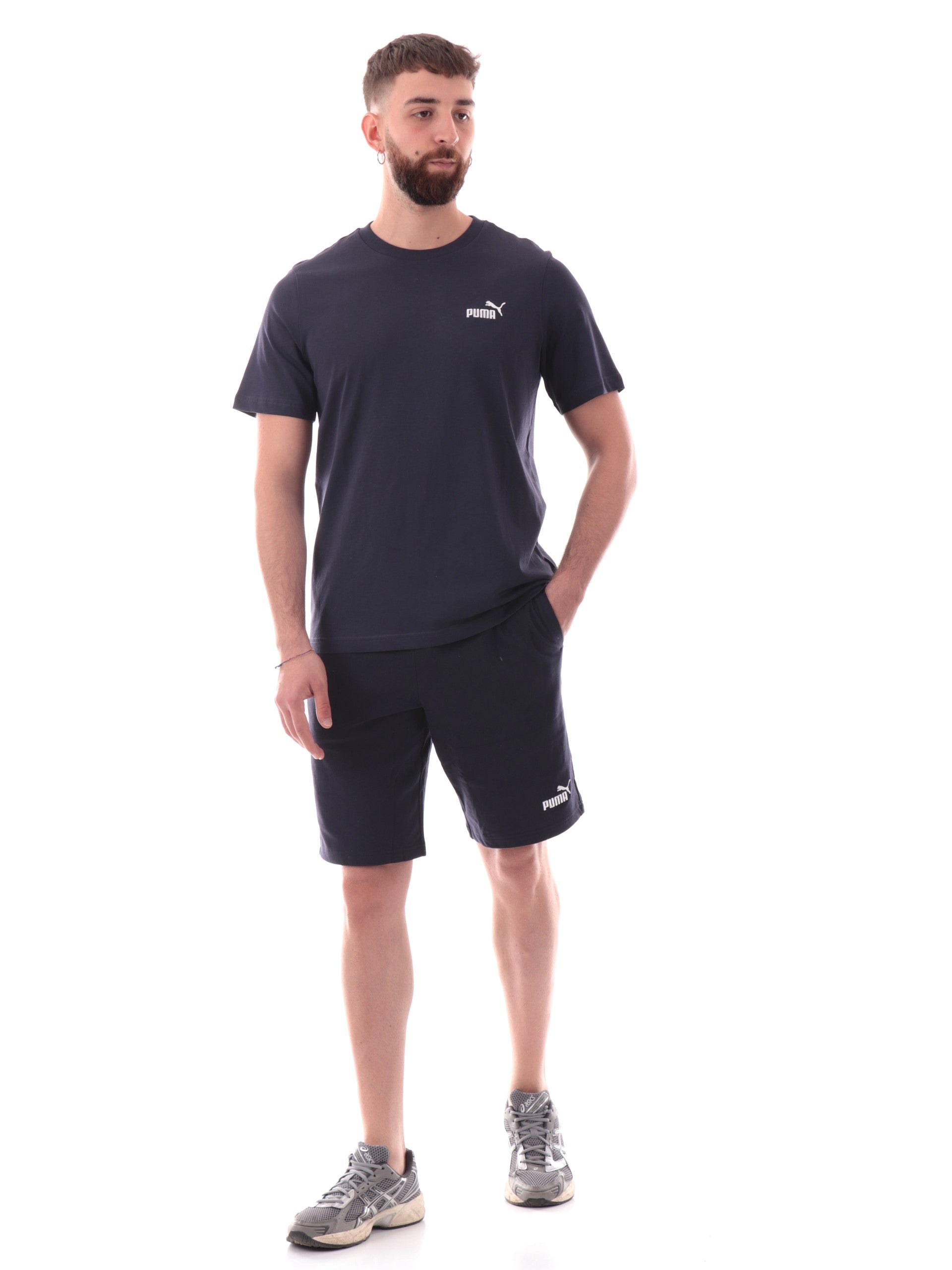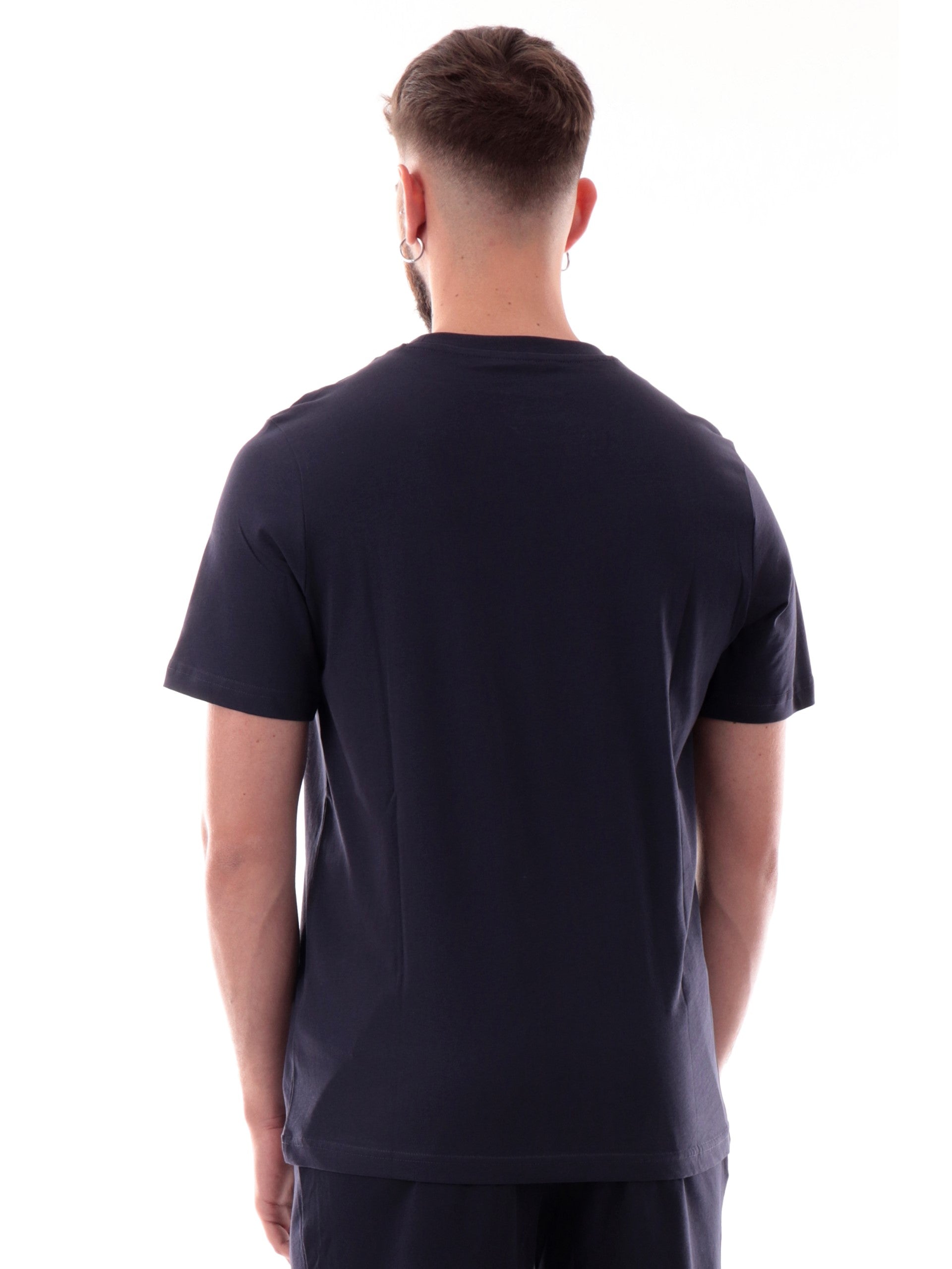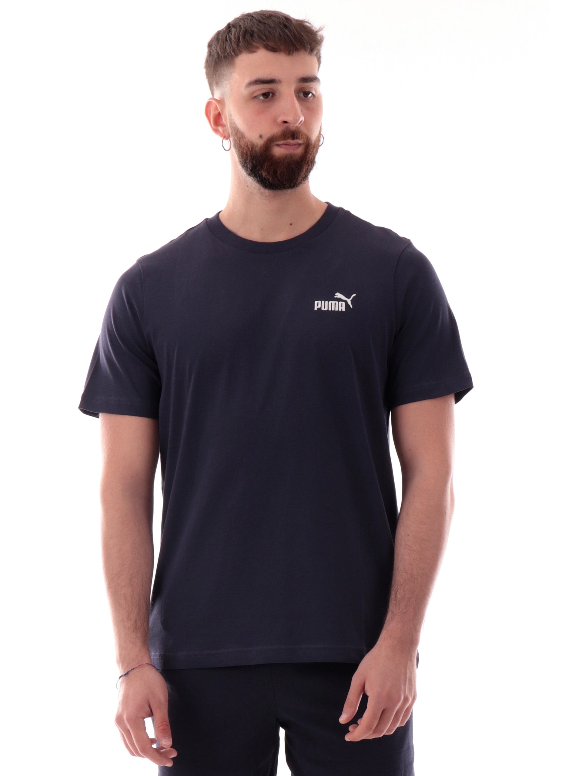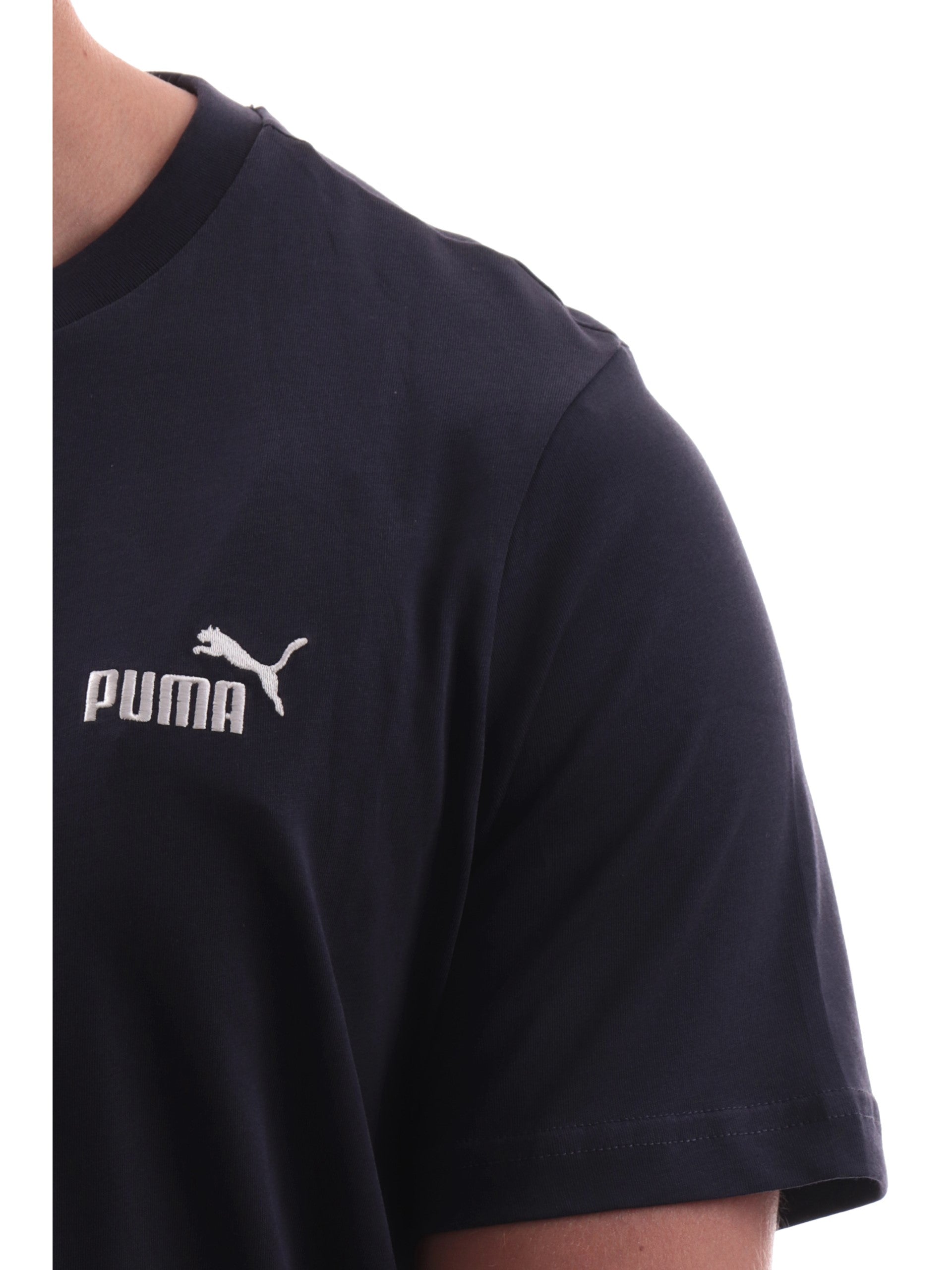 Maglia Puma blu girocollo da uomo logo Puma ricamato 682534, realizzata in 100% puro cotone. Questa t-shirt Puma girocollo ha le maniche corte e il logo Puma ricamato lato cuore.