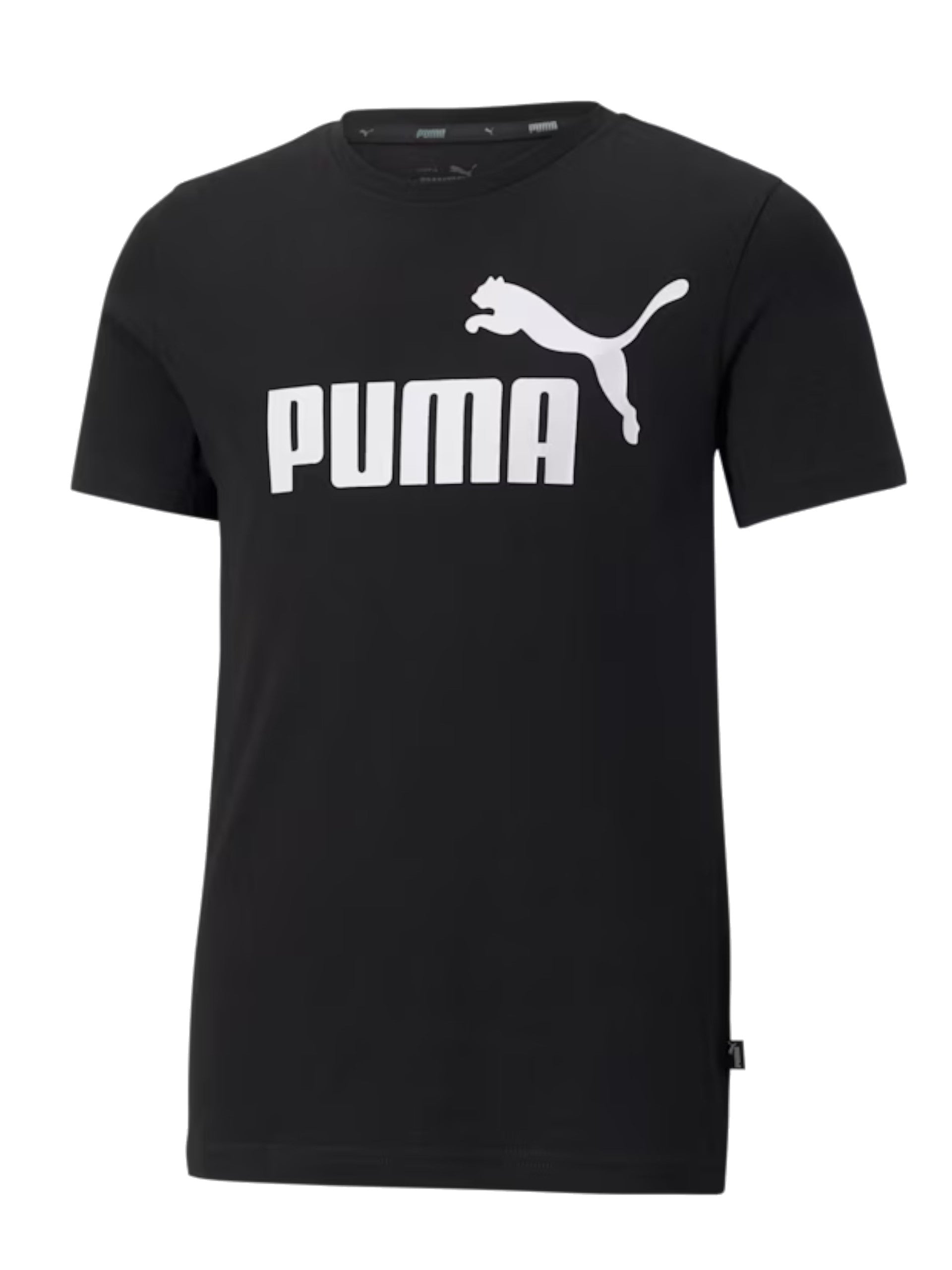 T-Shirt Puma Nera da bambino. Questa maglietta Puma da bambino è caratterizzata da logo bianco stampato sul davanti, maniche corte ed è realizzata in cotone elasticizzato.