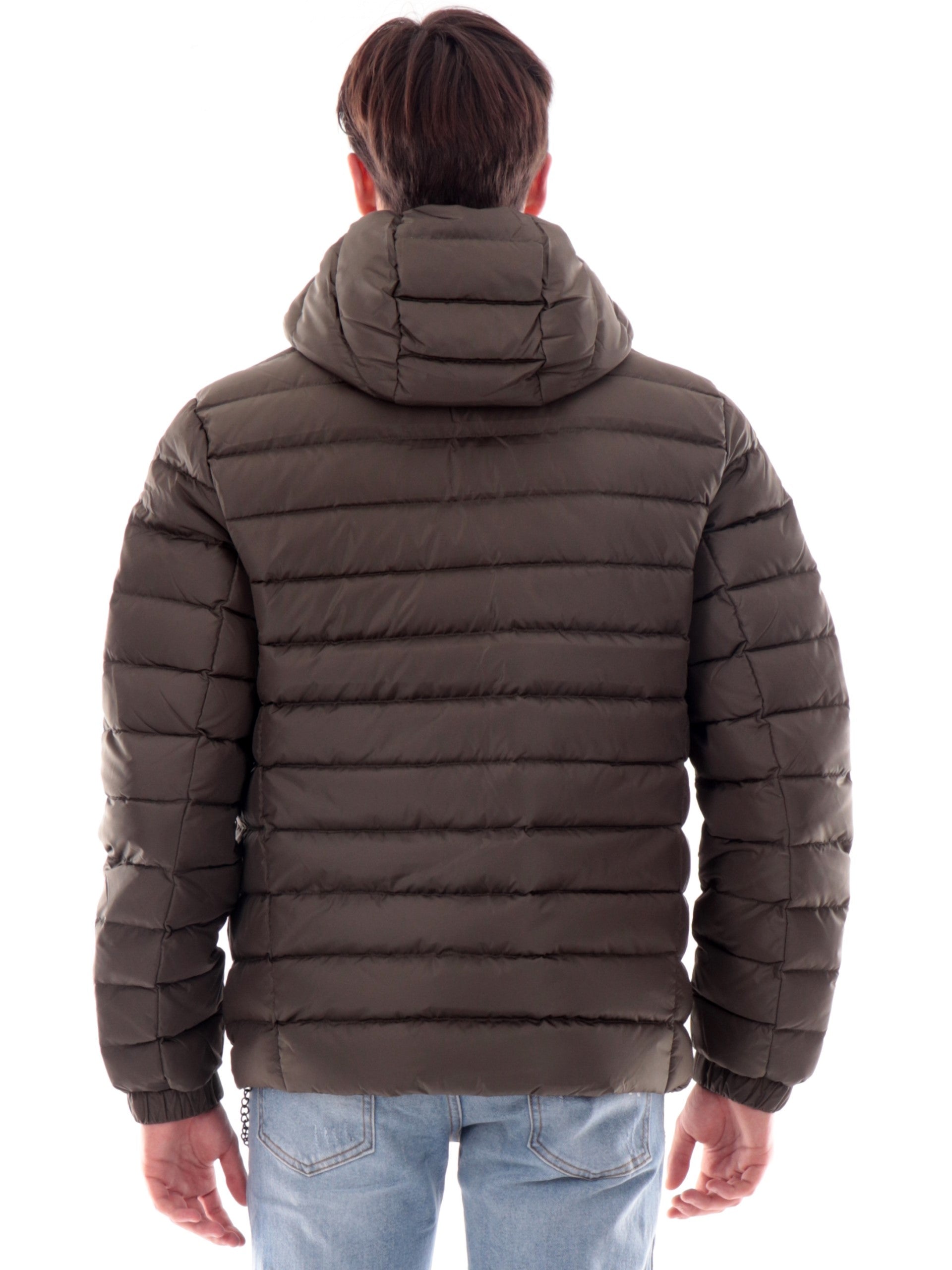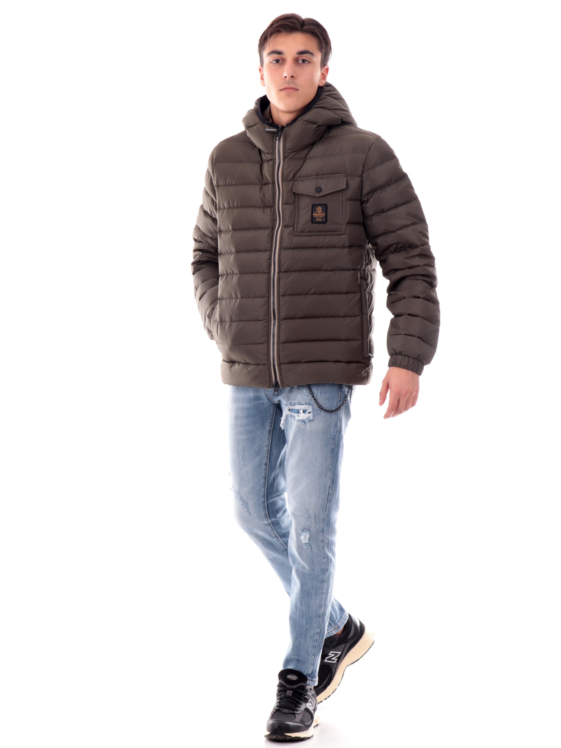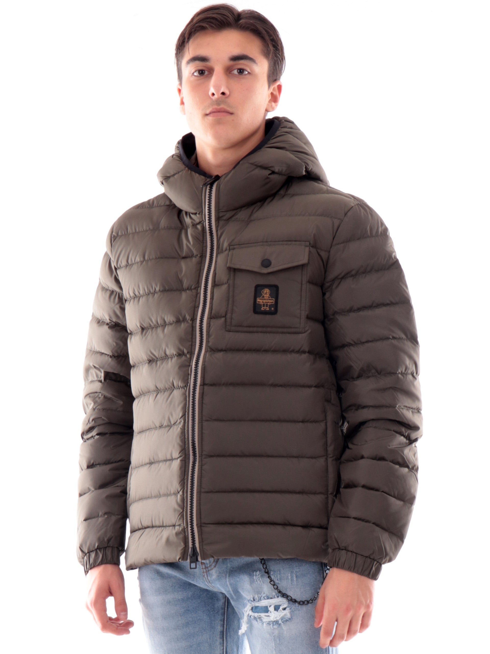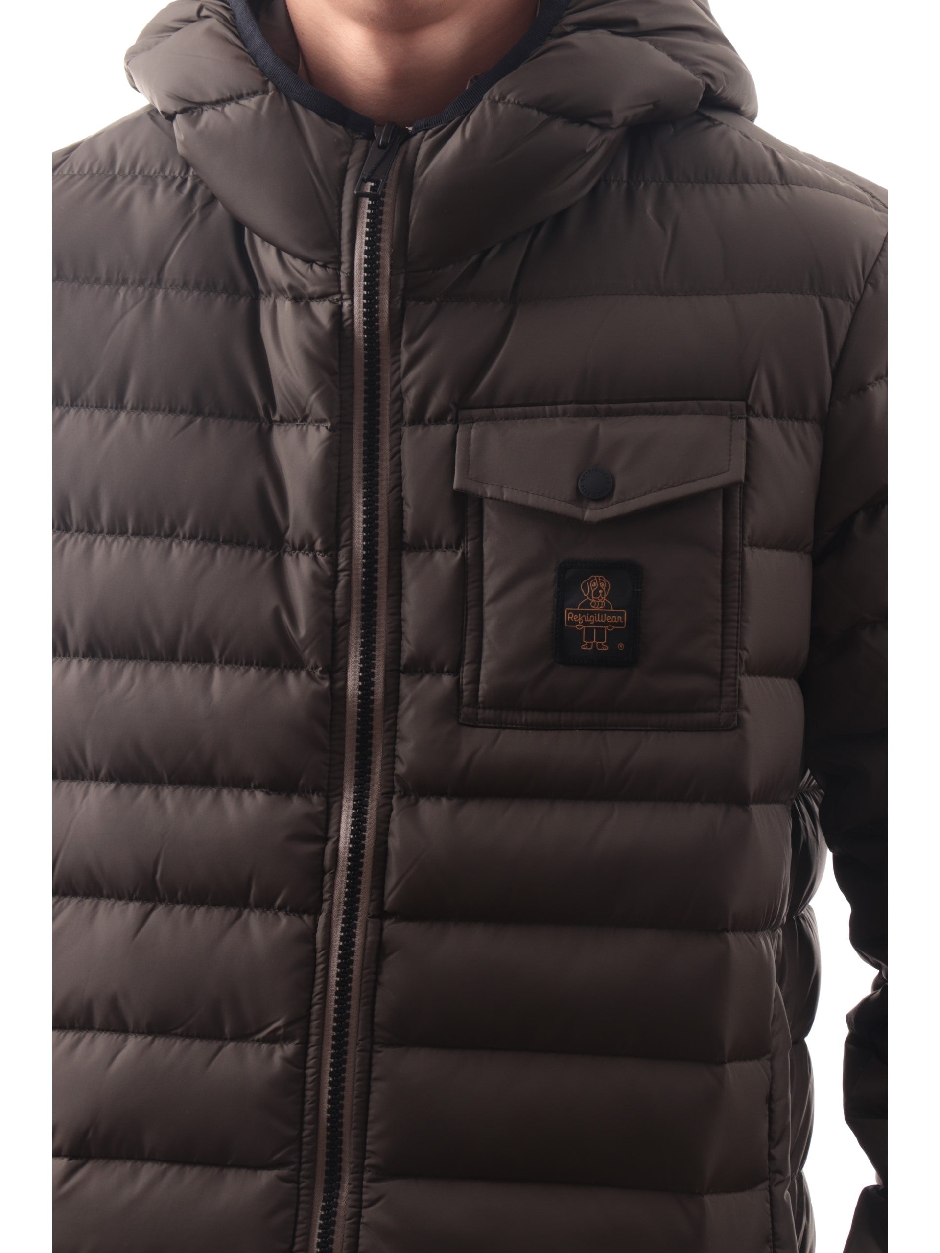 Giacca Refrigiwear Hunter verde militare da uomo full zip con cappuccio, realizzato con imbottitura in piuma naturale. Questo giubbotto Refrigiwear verde militare ha il cappuccio fisso con banda elastica, la chiusura full zip centrale, due tasche laterali con zip, un taschino con patta, polsini elasticizzati e il patch del brand cucito sul cuore a contrasto colore. All'interno troviamo due tascheampie aperte. Questo piumino è perfetto per un look casual