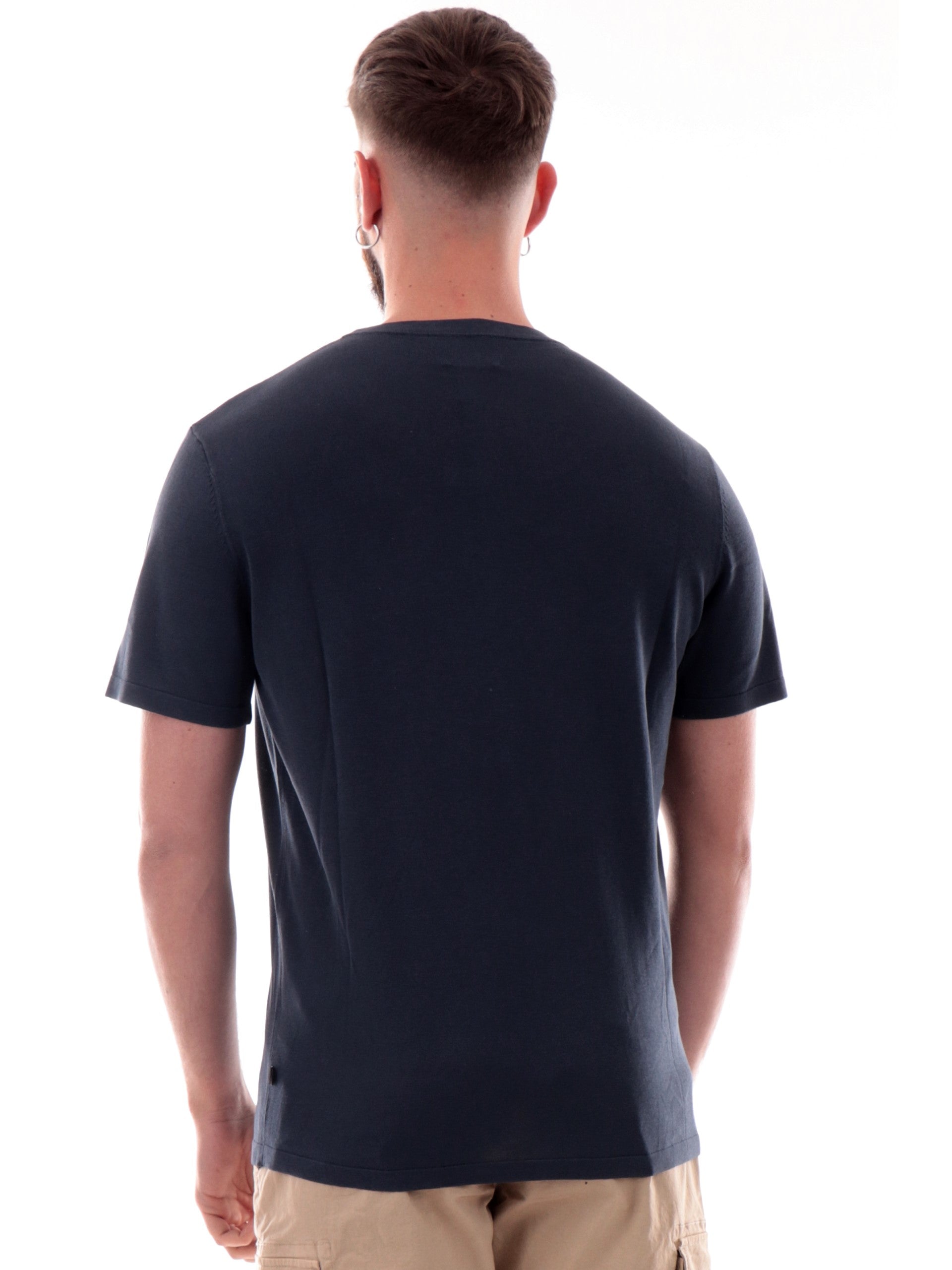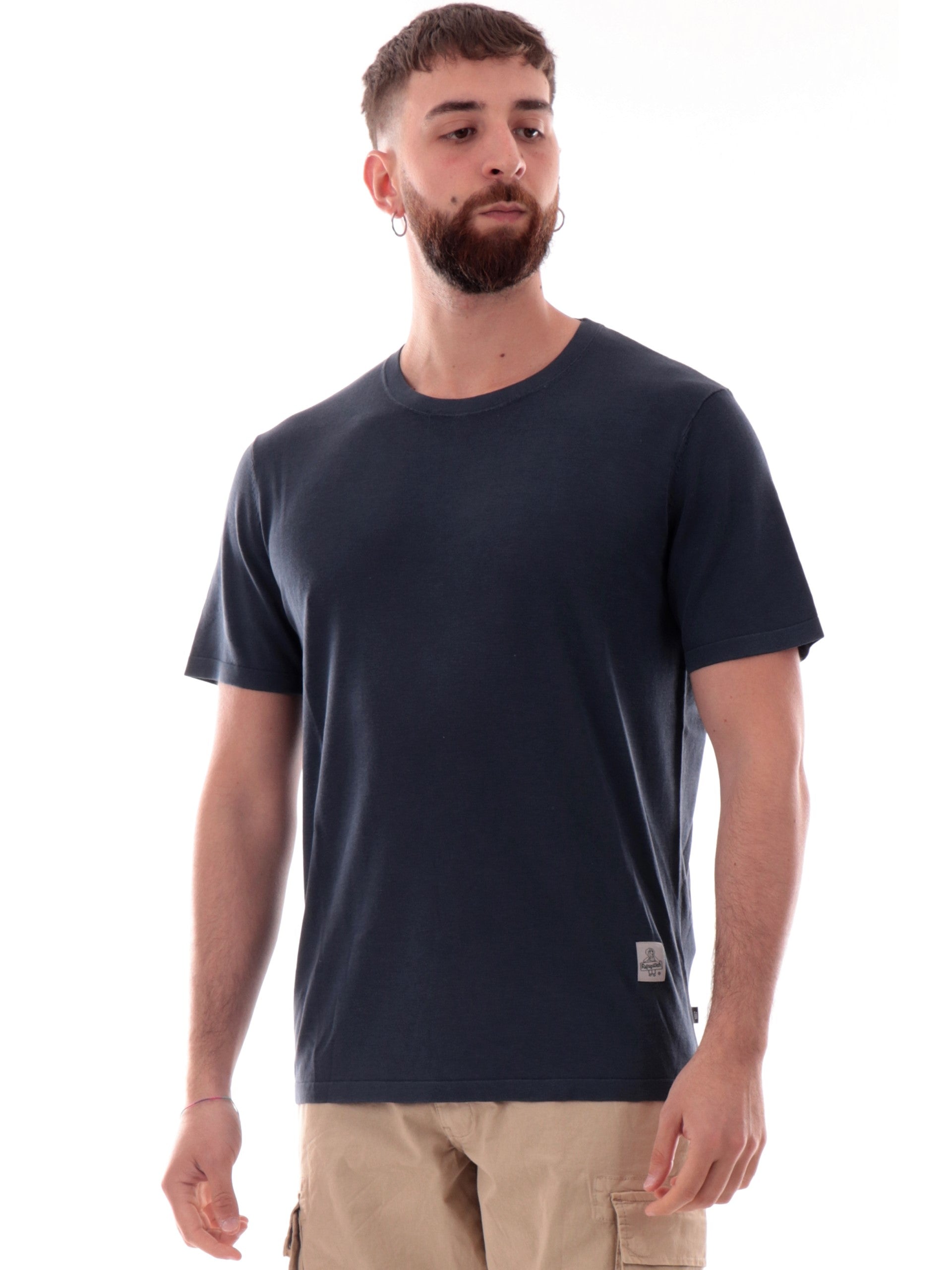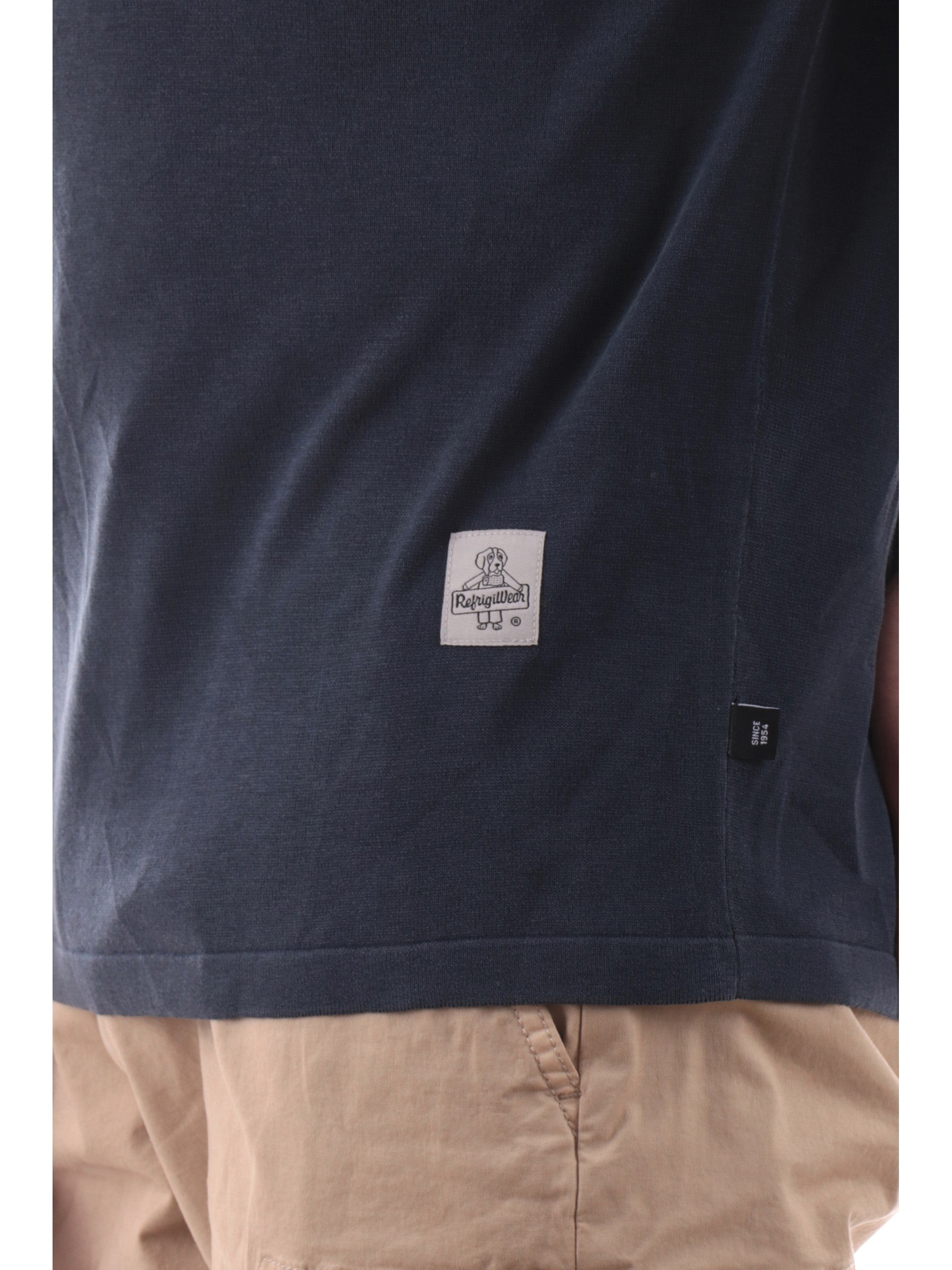 Maglia Refrigiwear in filo blu da uomo slim fit, realizzata in 100% puro filo di cotone. Questa t-shirt Refrigiwear blu ha il logo del brand applicato sul fondo.
