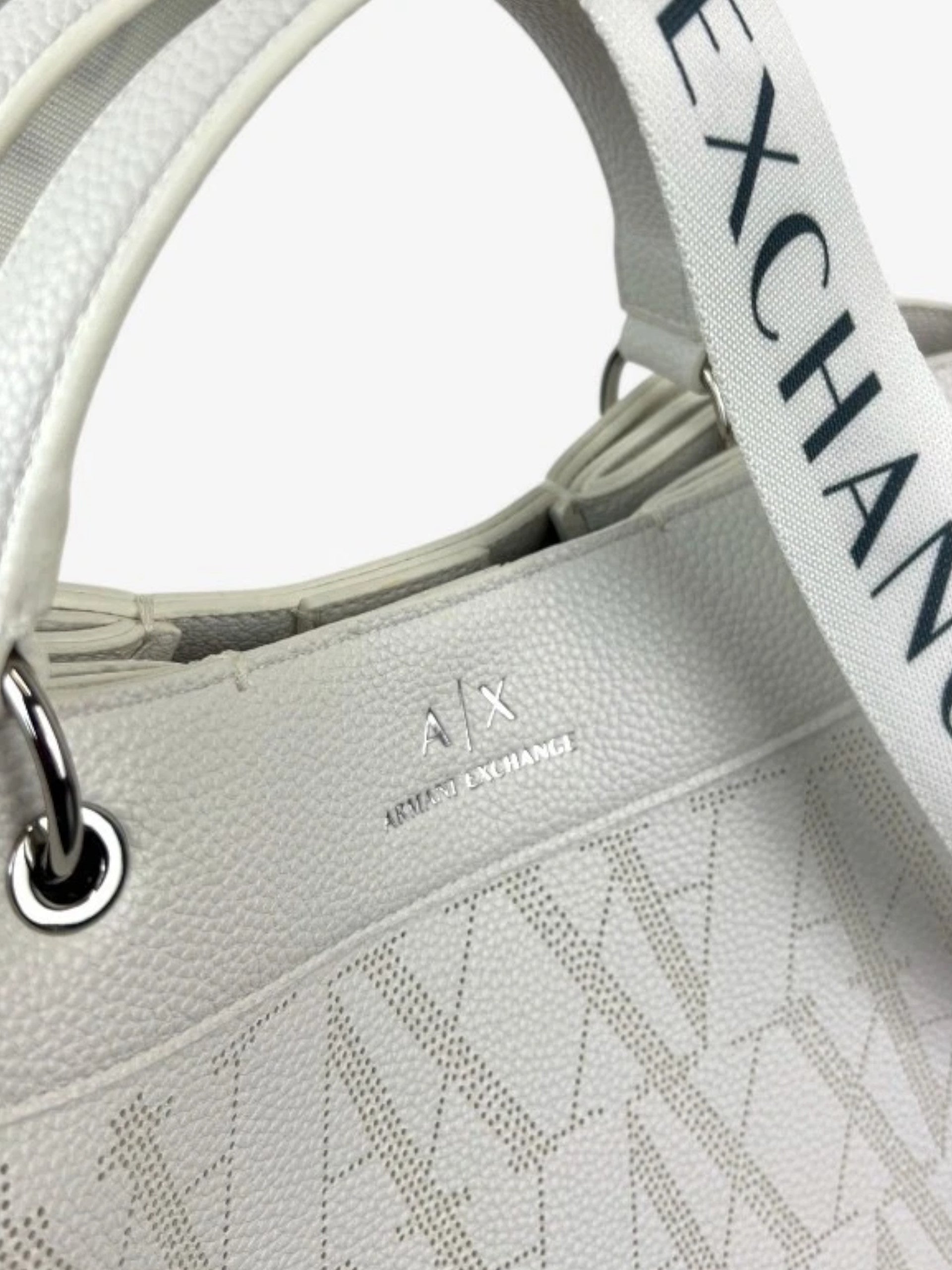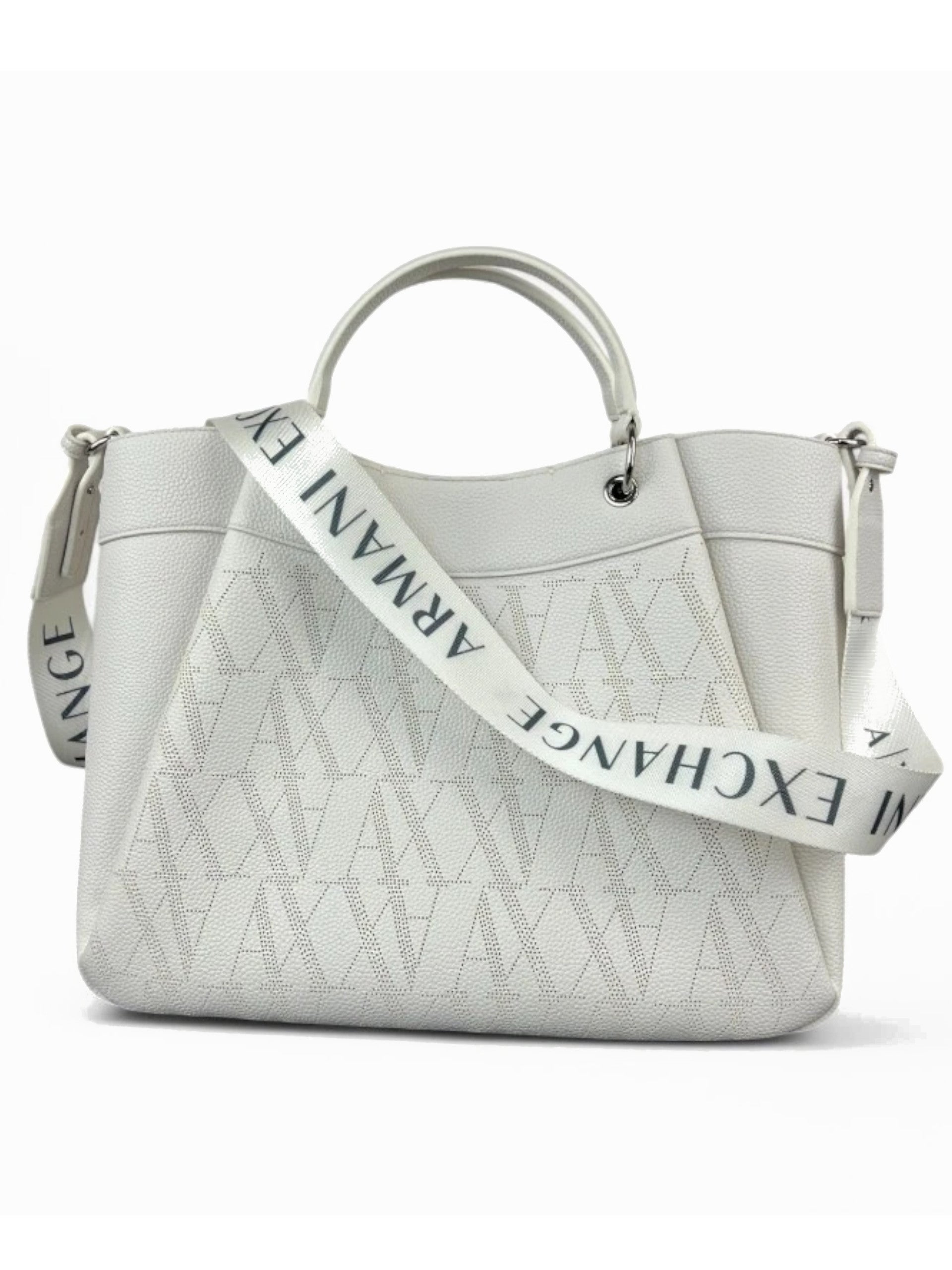 Borsa Armani Exchange AX bianca Shopping L da donna XW000954AF13679 U0002. Questa borsa AX bianca ha il doppio manico, la chiusura con bottone automatico, la tracolla rimovibile e regolabile, il salvaspalla e il logo AX all over traforato. All'interno di questa borsa donna Armani troviamo un unico grande scomparto con due tasche interne.