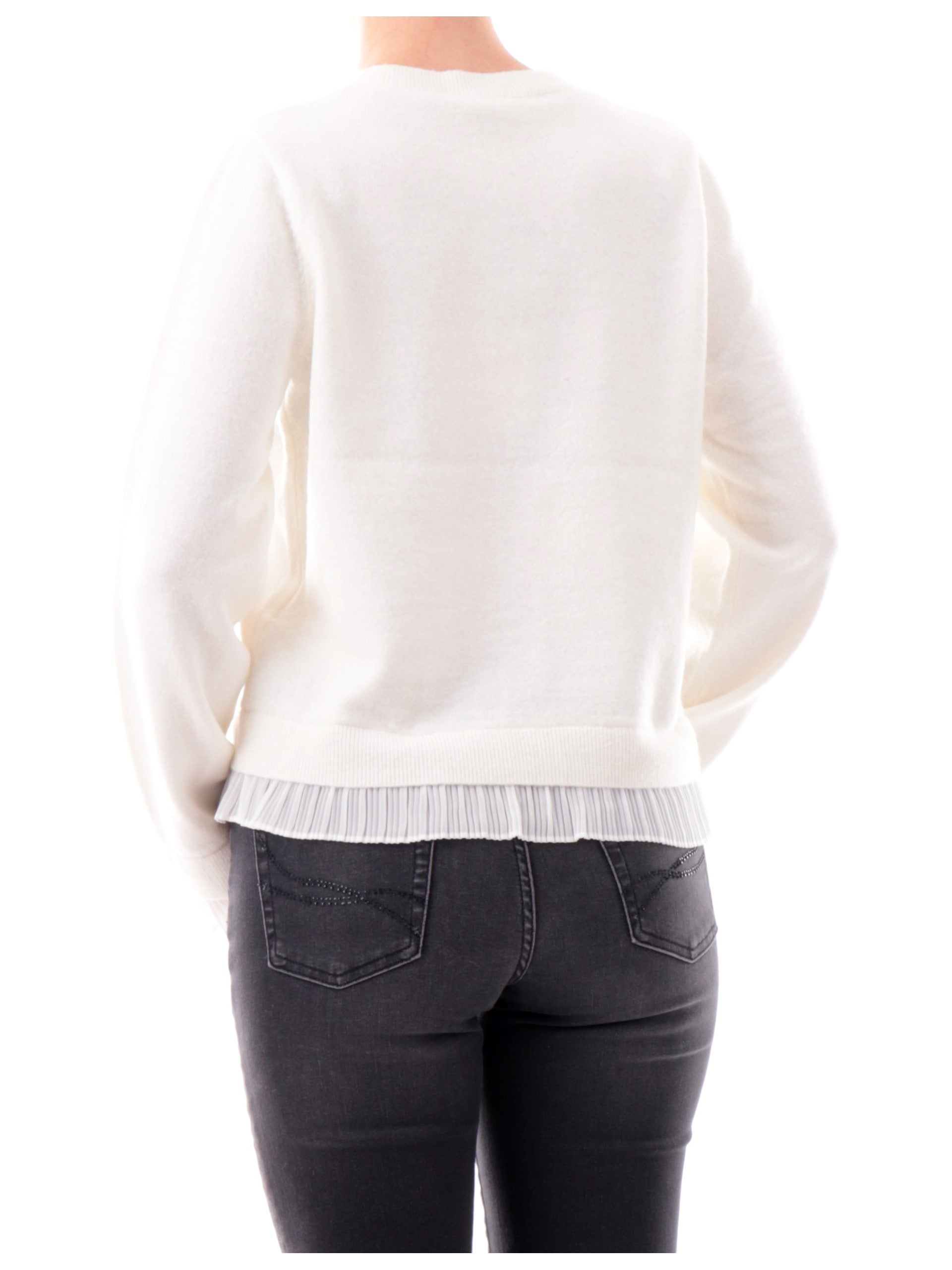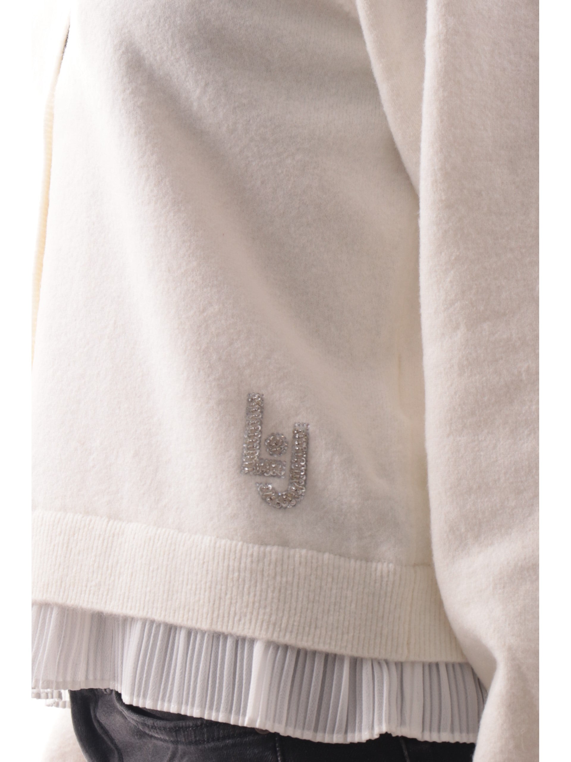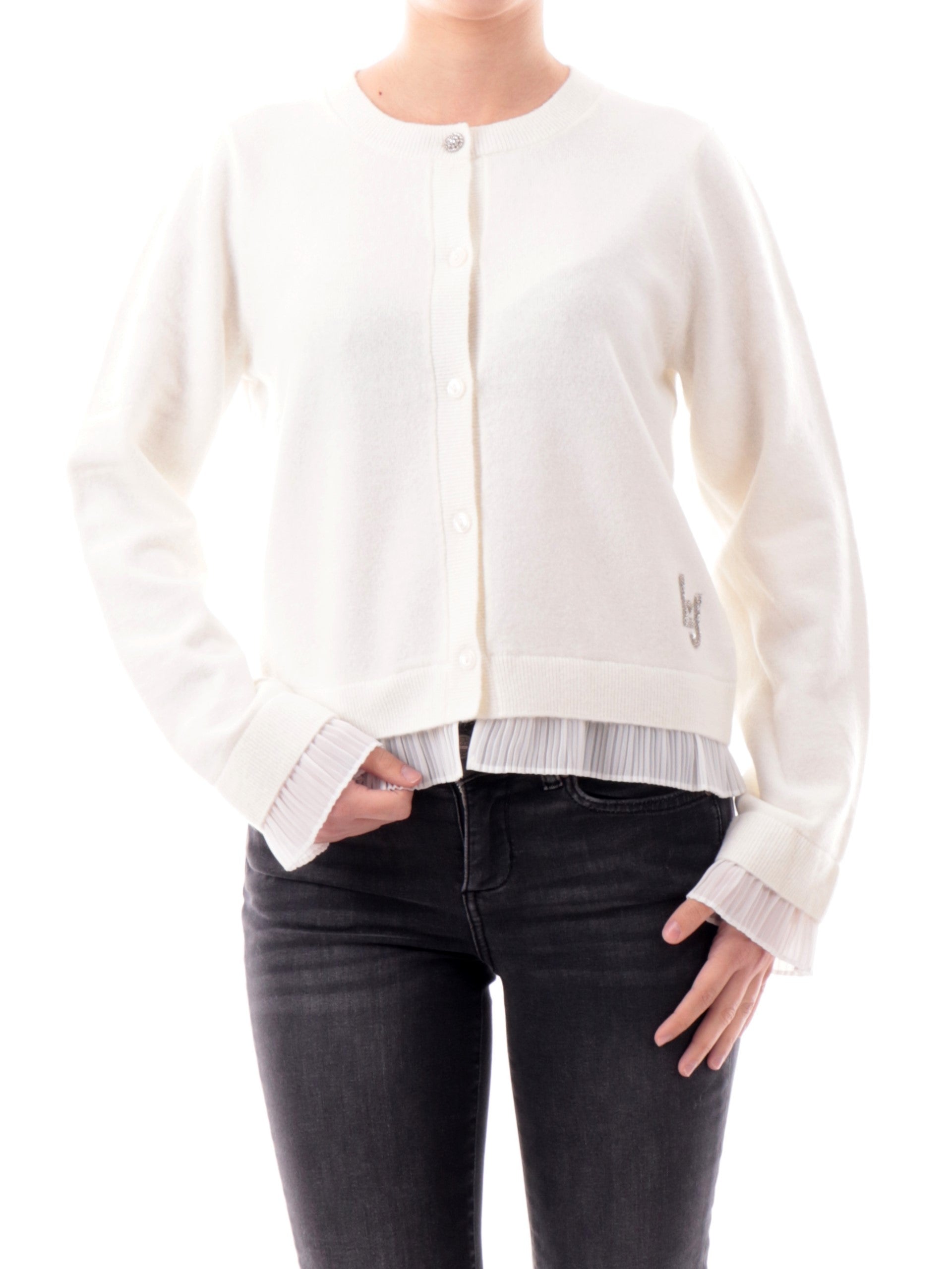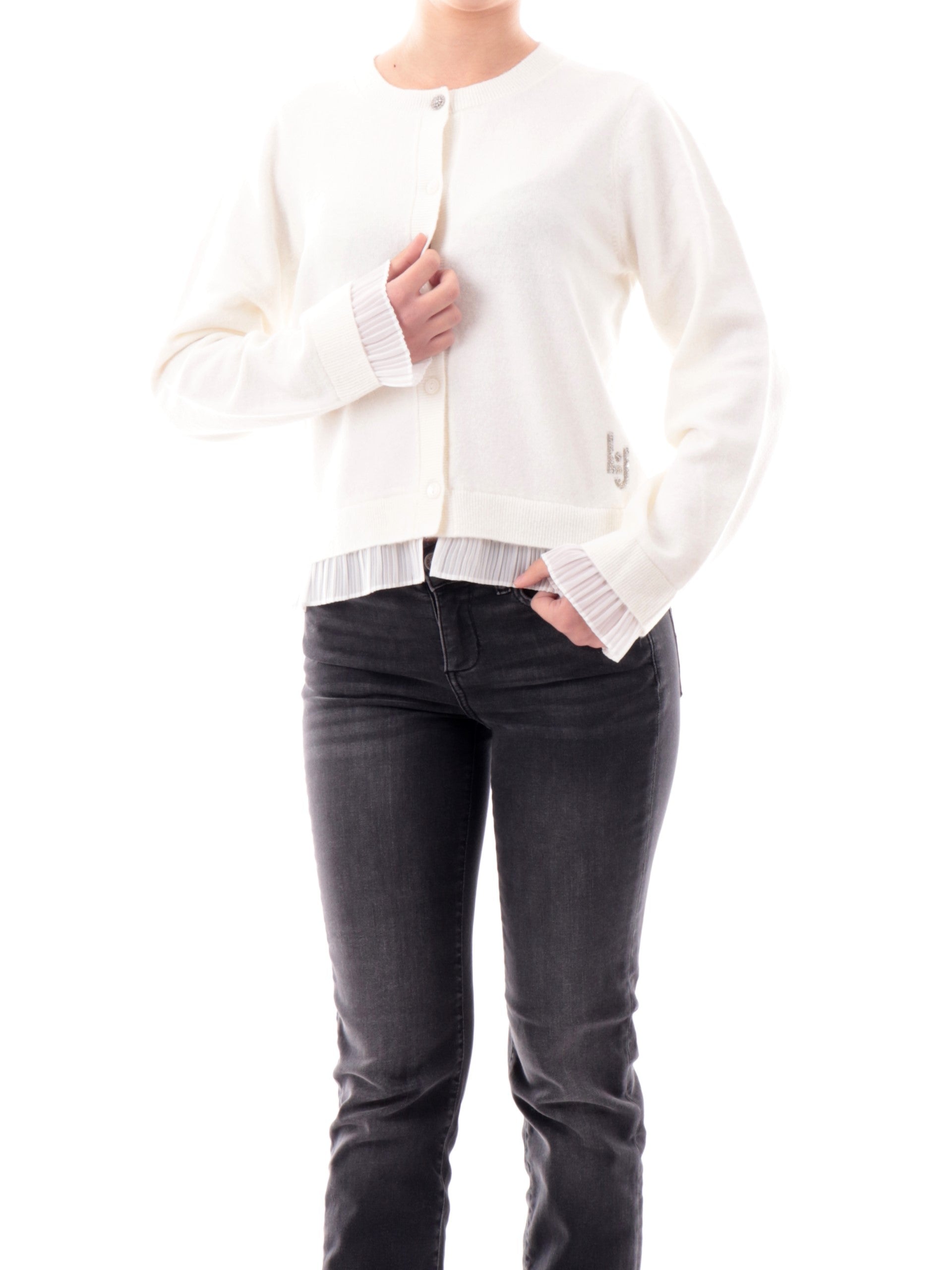 Cardigan bianco Liu Jo da donna con volant in crêpe plissé. Questa maglia Liu Jo realizzata da un tessuto in misto lana, caldo e morbido al tatto è caratterizzata dal girocollo, chiusura centrale a bottoni tra cui uno bottone gioiello, volant in crêpe plissé sul fondo e in fondo a sinistra troviamo il logo del brand brillantinato