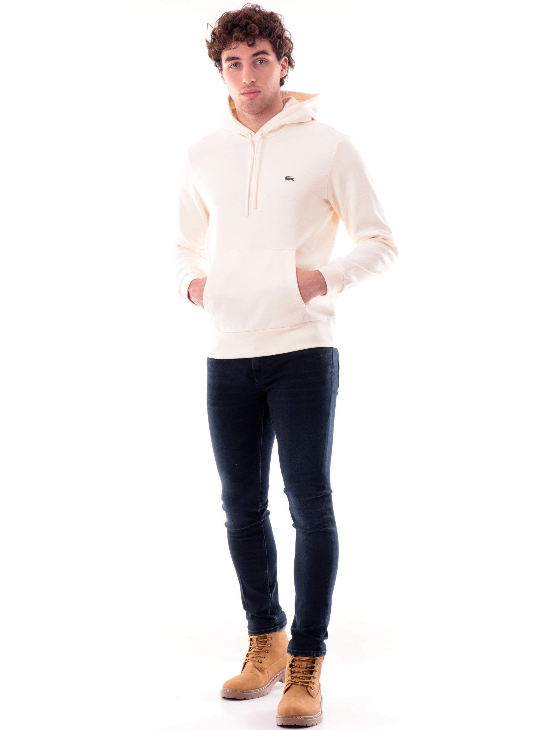 Felpa Lacoste beige da uomo con cappuccio SH9623. Questa felpa Lacoste beige a tinta unita ha il cappuccio regolabile con laccetti, l'iconico coccodrillo ricamato sul davanti lato sinistro, la tasca a marsupio, il morbido interno felpato e polsini e fondo a costine.