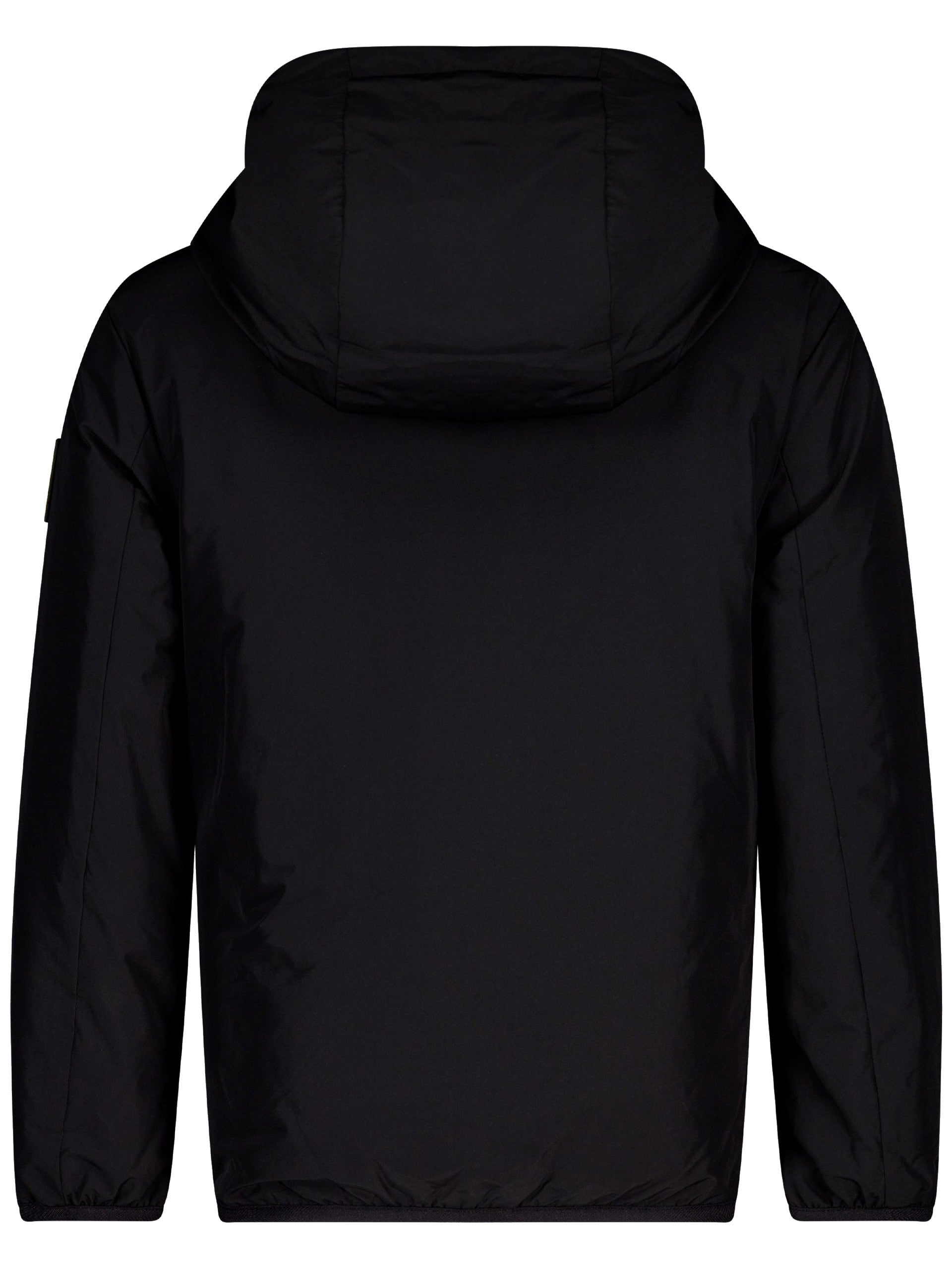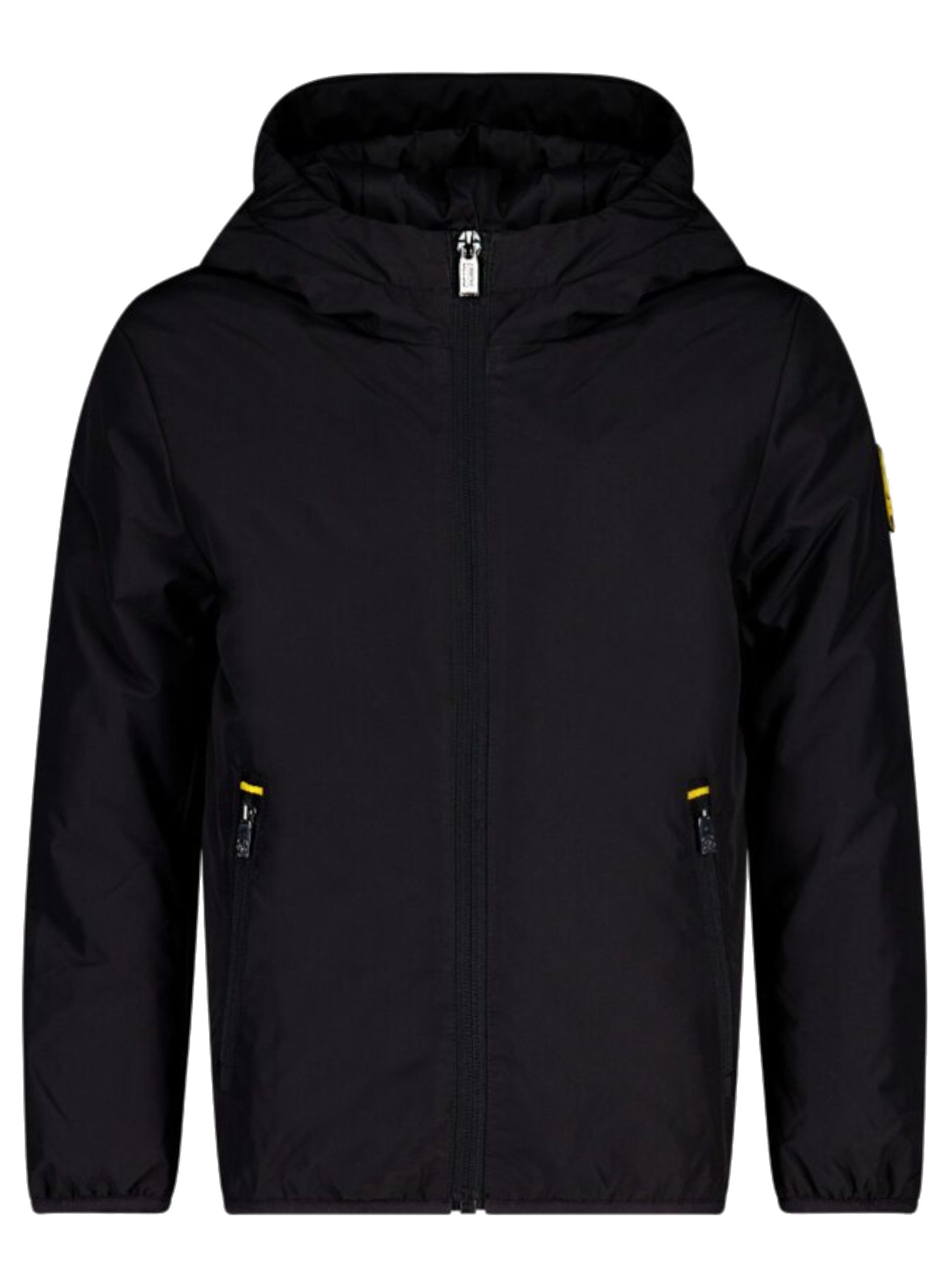 Giacca Ciesse Piumini da bambino nero. Questo giubbotto Ciesse ha la chiusura centrale full zip, due tasche laterali, cappuccio fisso, polsini e fondo elasticizzati , e il logo giallo applicato sul lato sinistro