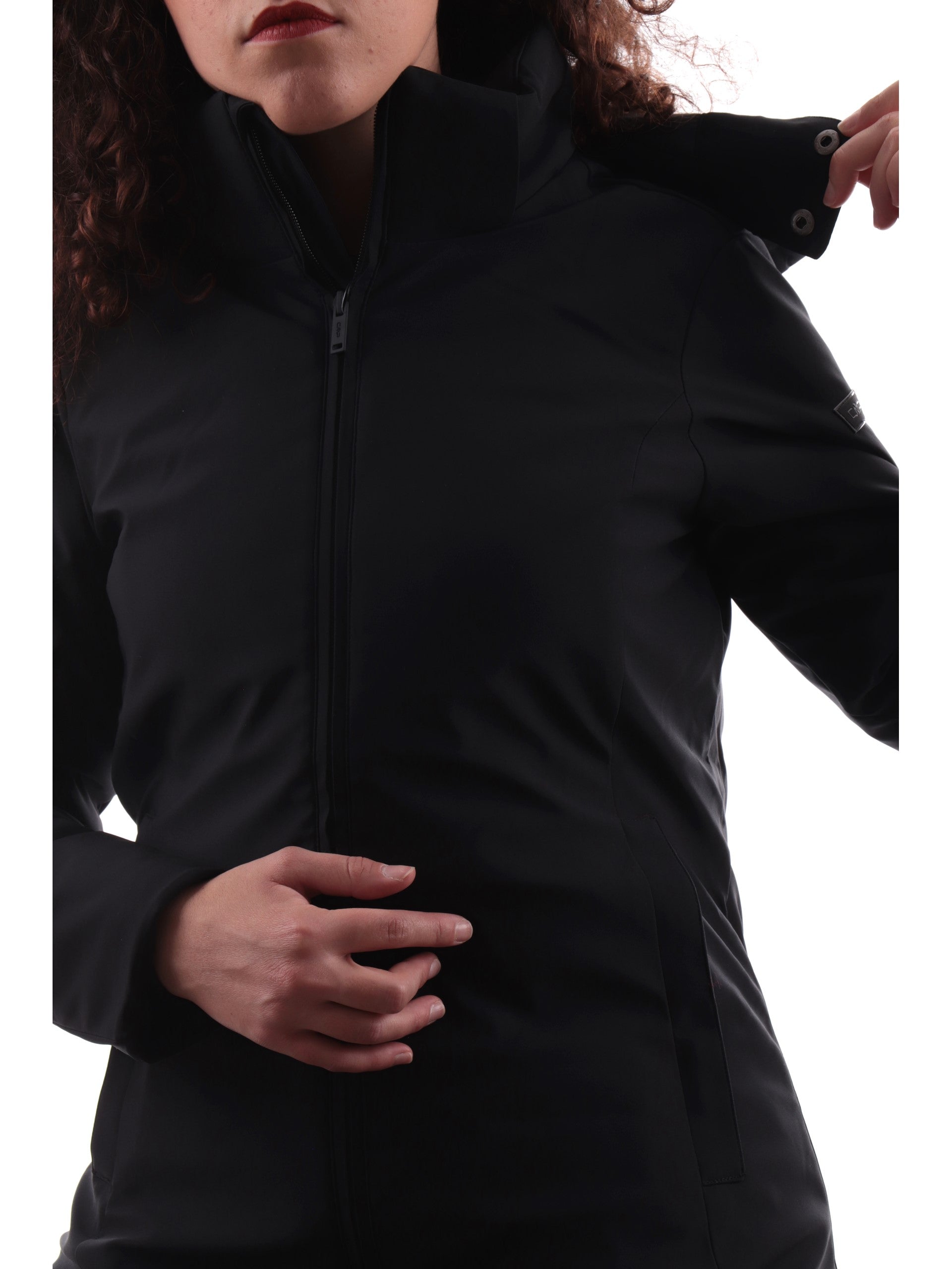 Giacca CMP nera da donna 33K3556, realizzata con tecnologia Clima Protect che garantisce maggiore impermeabilità e traspirabilità. Questo cappotto CMP nero ha il cappuccio rimovibile, lo scaldacollo regolabile con coulisse, la chiusura full zip centrale, due tasche laterali con zip ed il patch del brand applicato sulla manica sinistra a contrasto colore.