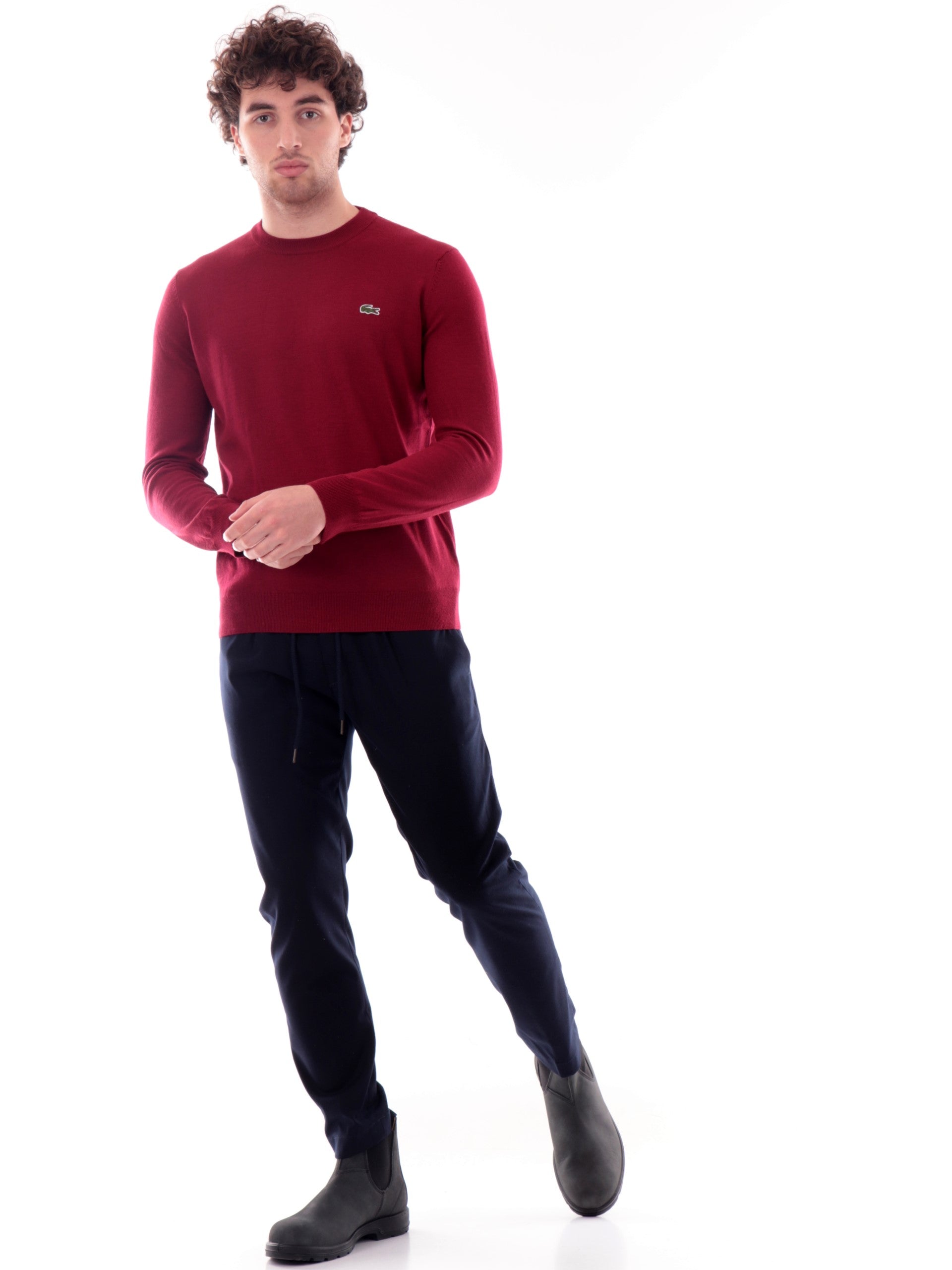 Maglione Lacoste bordeaux da uomo pullover in maglia, realizzato in misto lana. Questo pullover Lacoste bordeaux girocollo ha l'iconico coccodrillo sul cuore a contrasto colore, polsini e fondo elasticizzati a costine. Questo maglione Lacoste bordeaux è perfetto per la stagione autunno-inverno