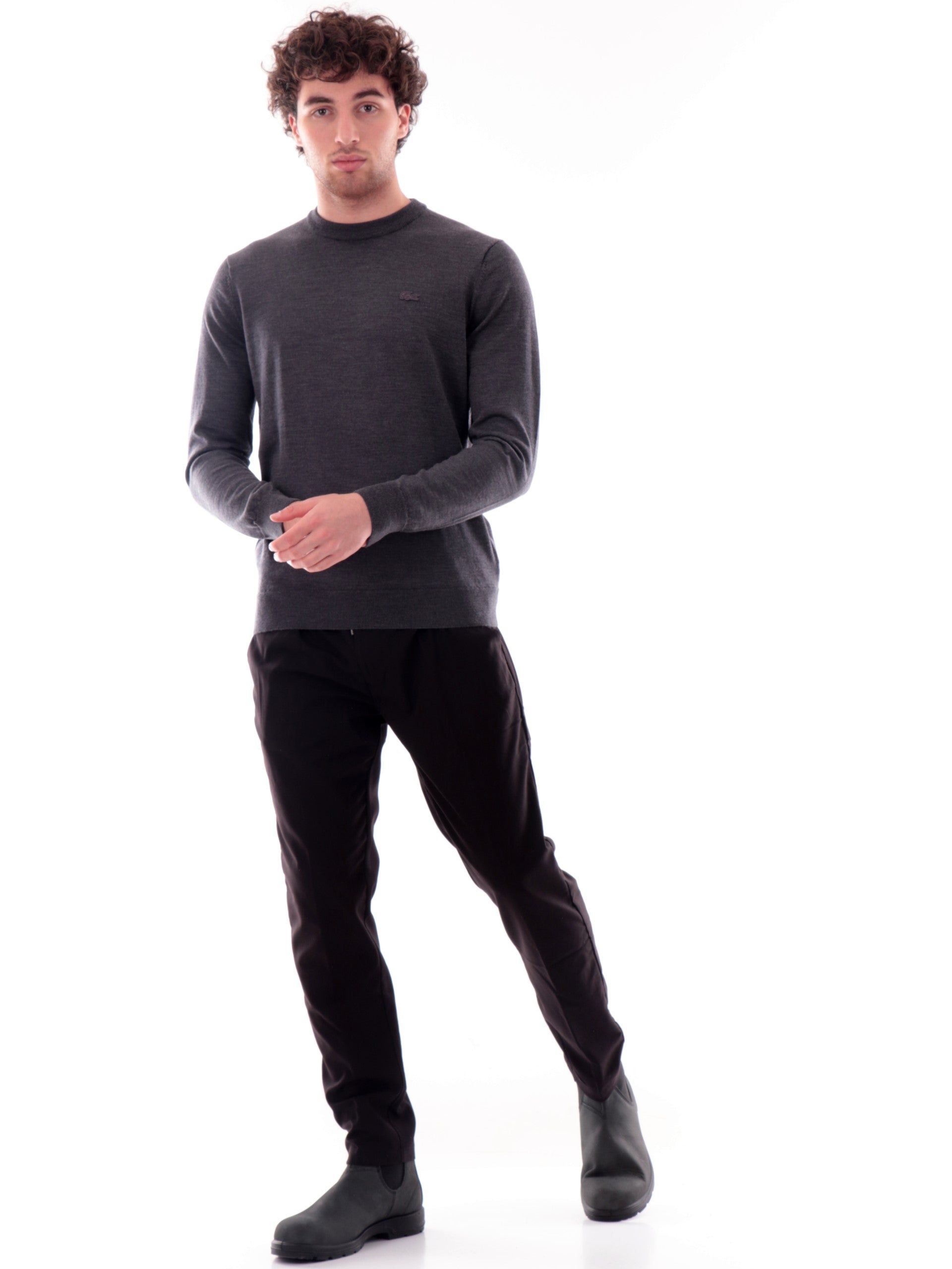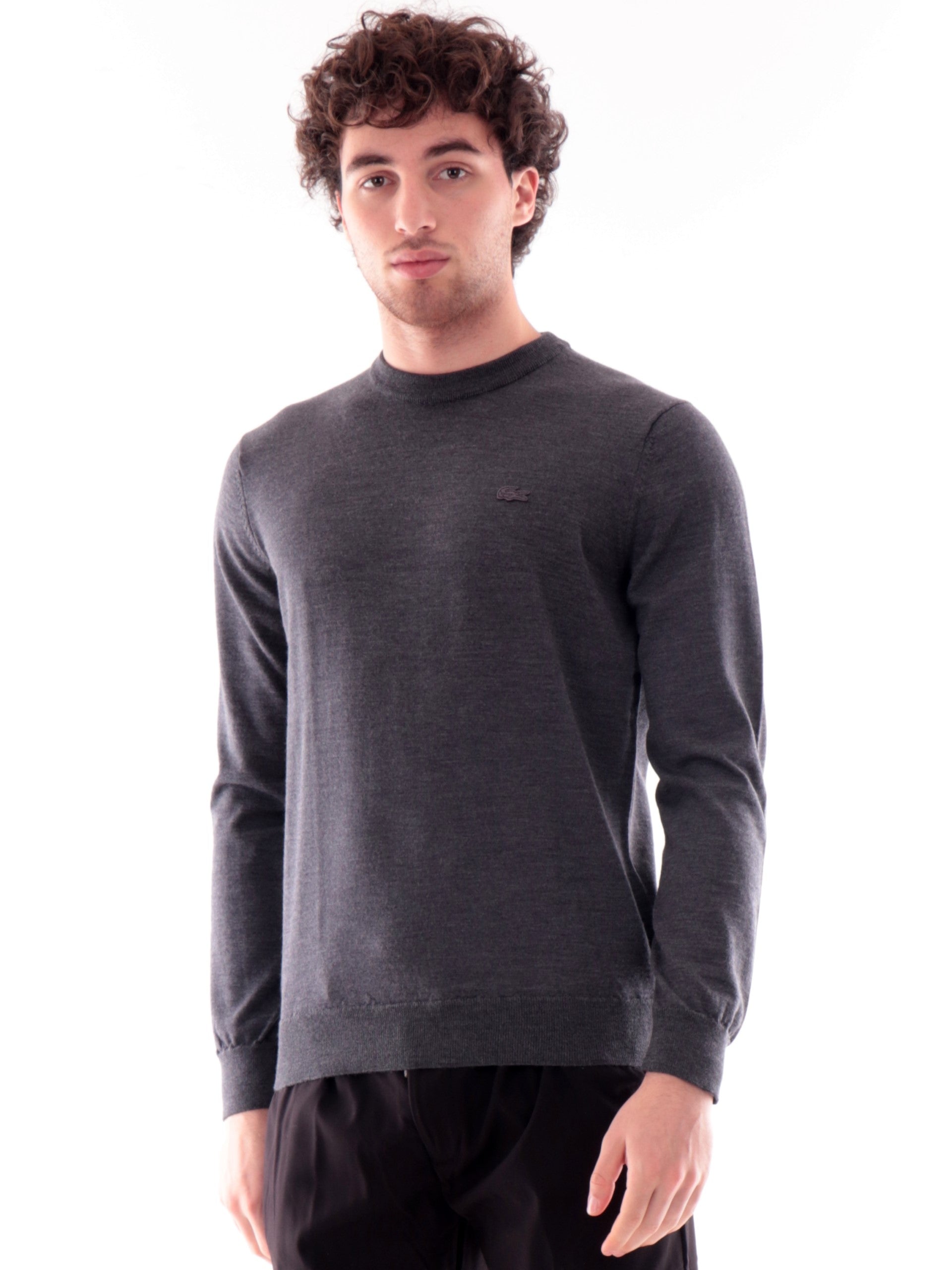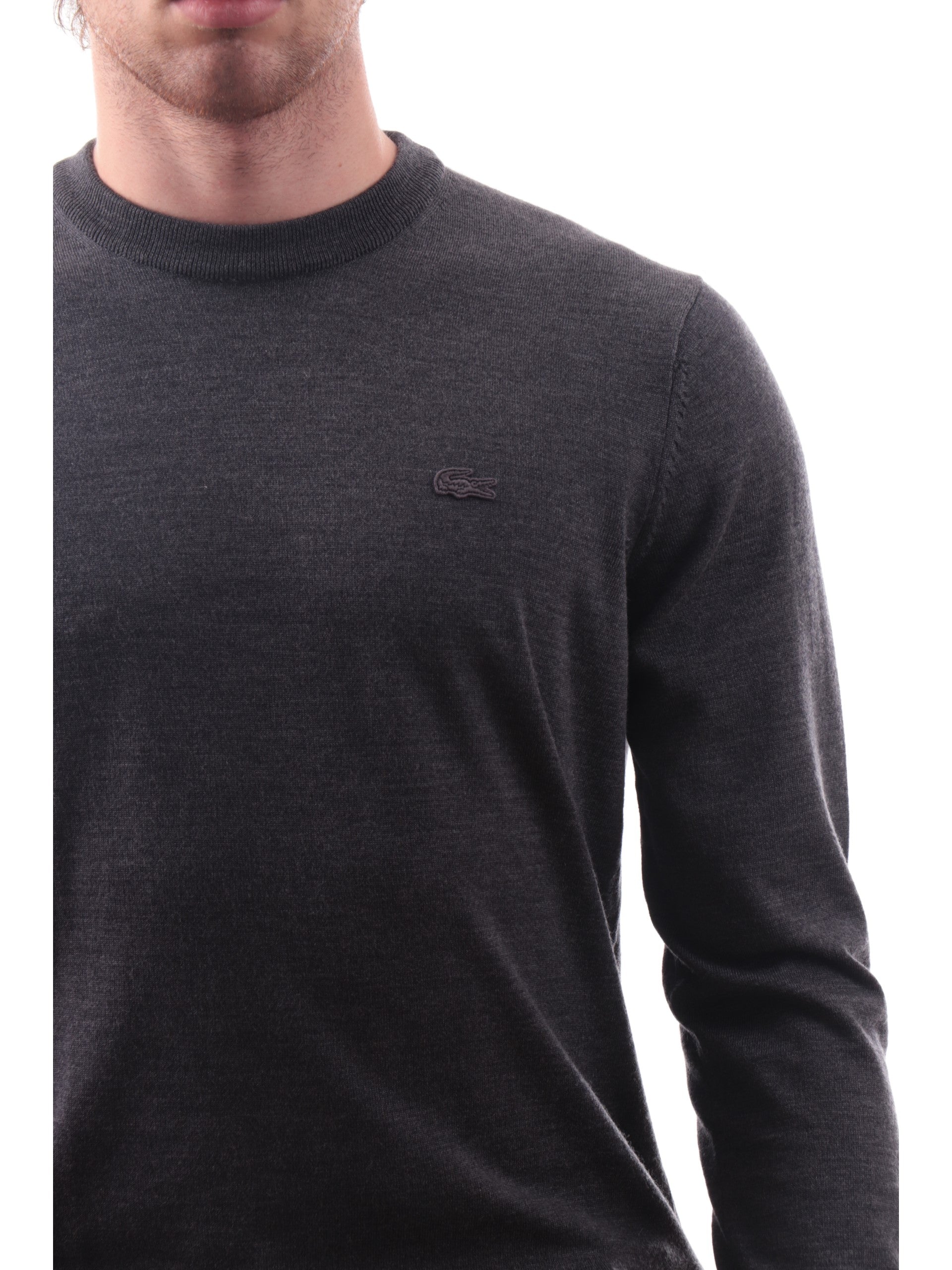 Maglione Lacoste da uomo grigio a tinta unita. Questo pullover Lacoste grigio girocollo ha polsini e fondo a costine, l'iconico coccodrillo cucito sul davanti lato sinistro tono su tono e una vestibilità regolare. Questo maglione Lacoste da uomo è realizzato al 100% in lana, risulta molto morbiso al tatto, si abbina a tutti i tuoi outfit e si adatta a qualsiasi contesto