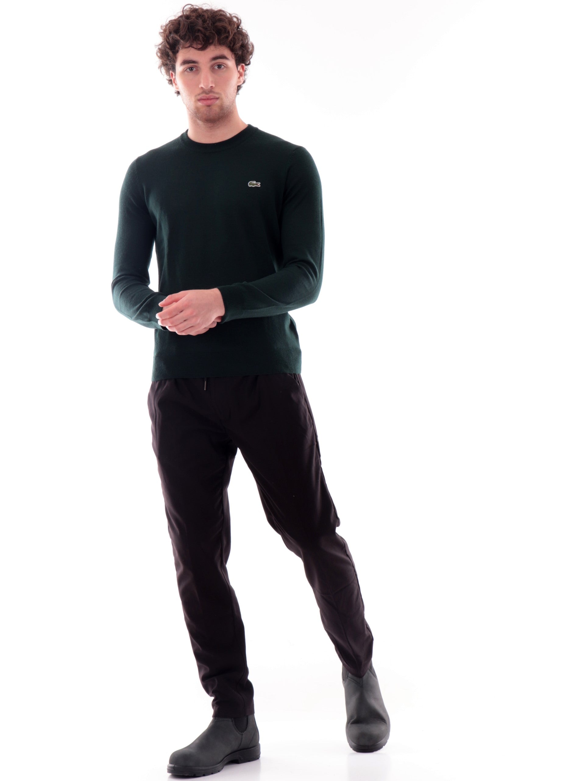 Maglione Lacoste verde da uomo pullover in maglia, realizzato in misto lana. Questo pullover Lacoste verde girocollo ha l'iconico coccodrillo sul cuore a contrasto colore, polsini e fondo elasticizzati a costine. Questo maglione Lacoste verde è perfetto per la stagione autunno-inverno