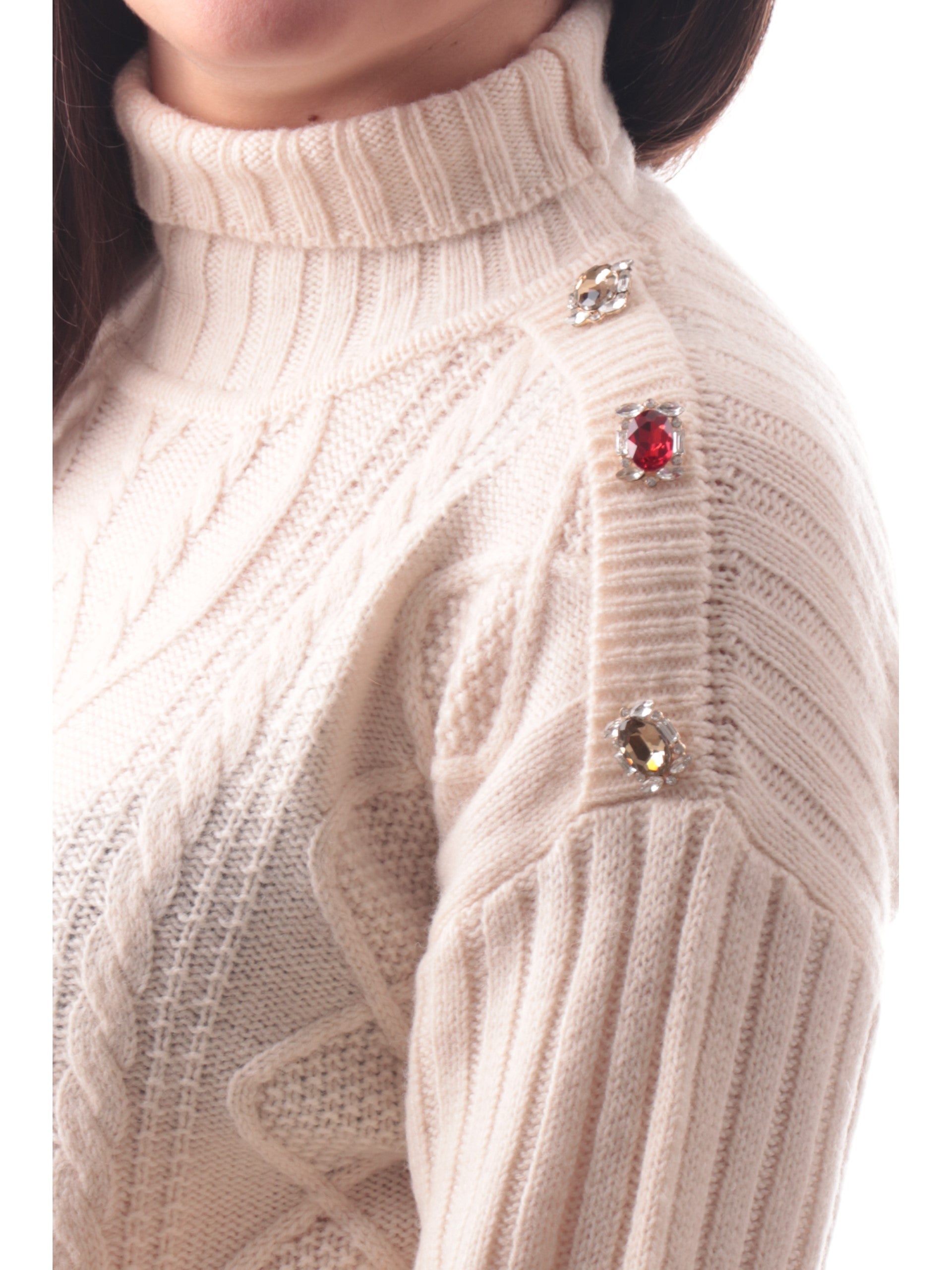 Maglione Liu Jo a treccia da donna Beige dolce vita. Questa maglia a dolce vita Liu Jo beige è realizzata da un tessuto misto lana caldo e comfortevole adatto per l'inverno. Questo maglione Liu Jo è caratterizzato da tessuto a treccia, maniche larghe e sulla spalla troviamo tre piccoli bottoni gioiello