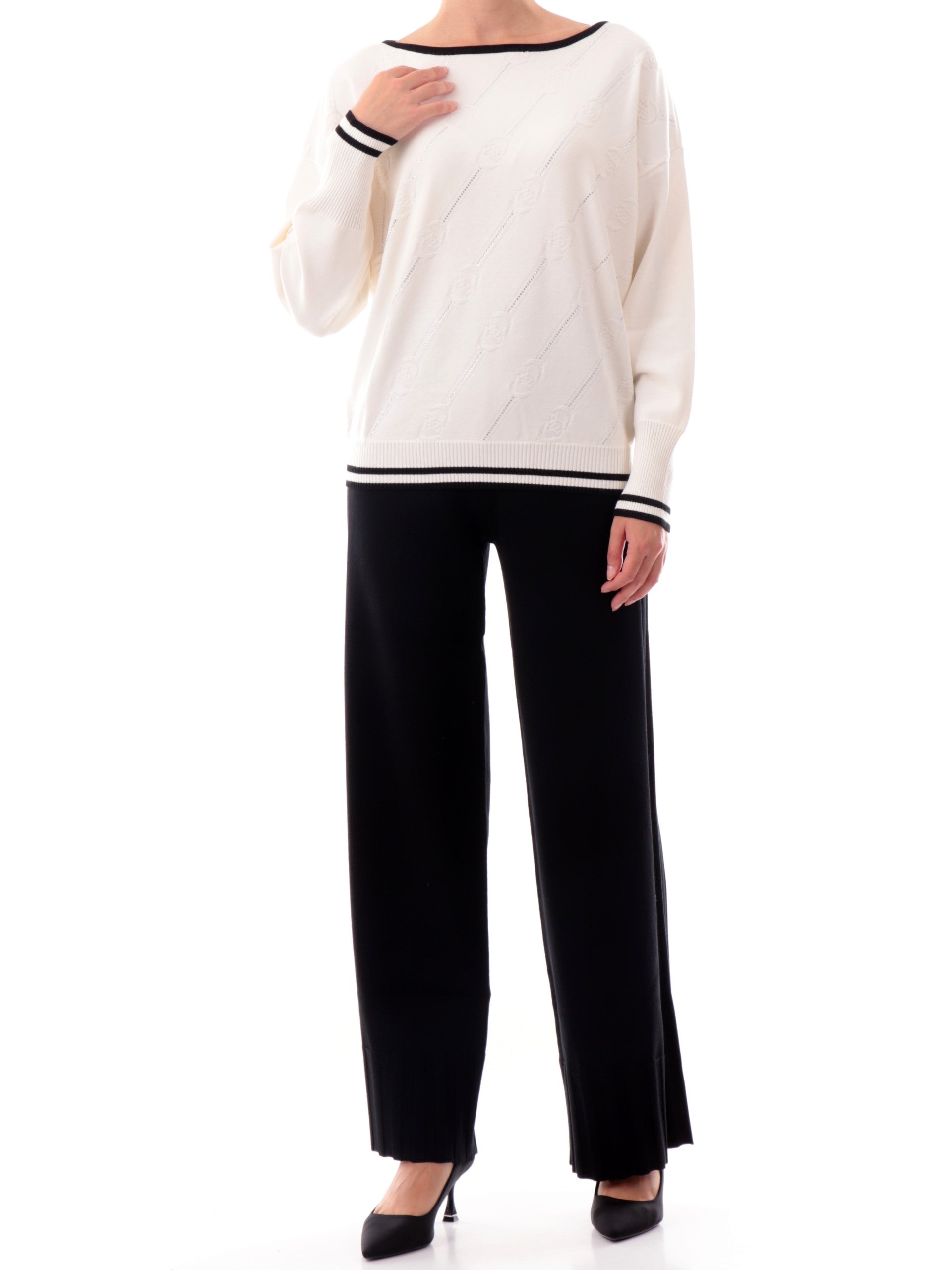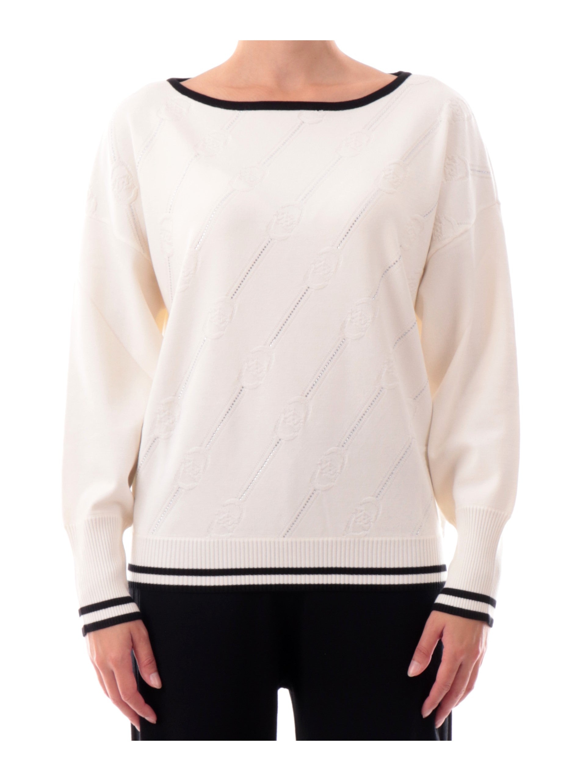 Maglione Liu Jo bianco girocollo da donna con strass TF5206MS63L, realizzato in viscosa. Questo maglione donna Liu Jo bianco girocollo ha le maniche lunghe, il logo applicato tono su tono all over, strass decorativi, polsini e fondo elasticizzati.