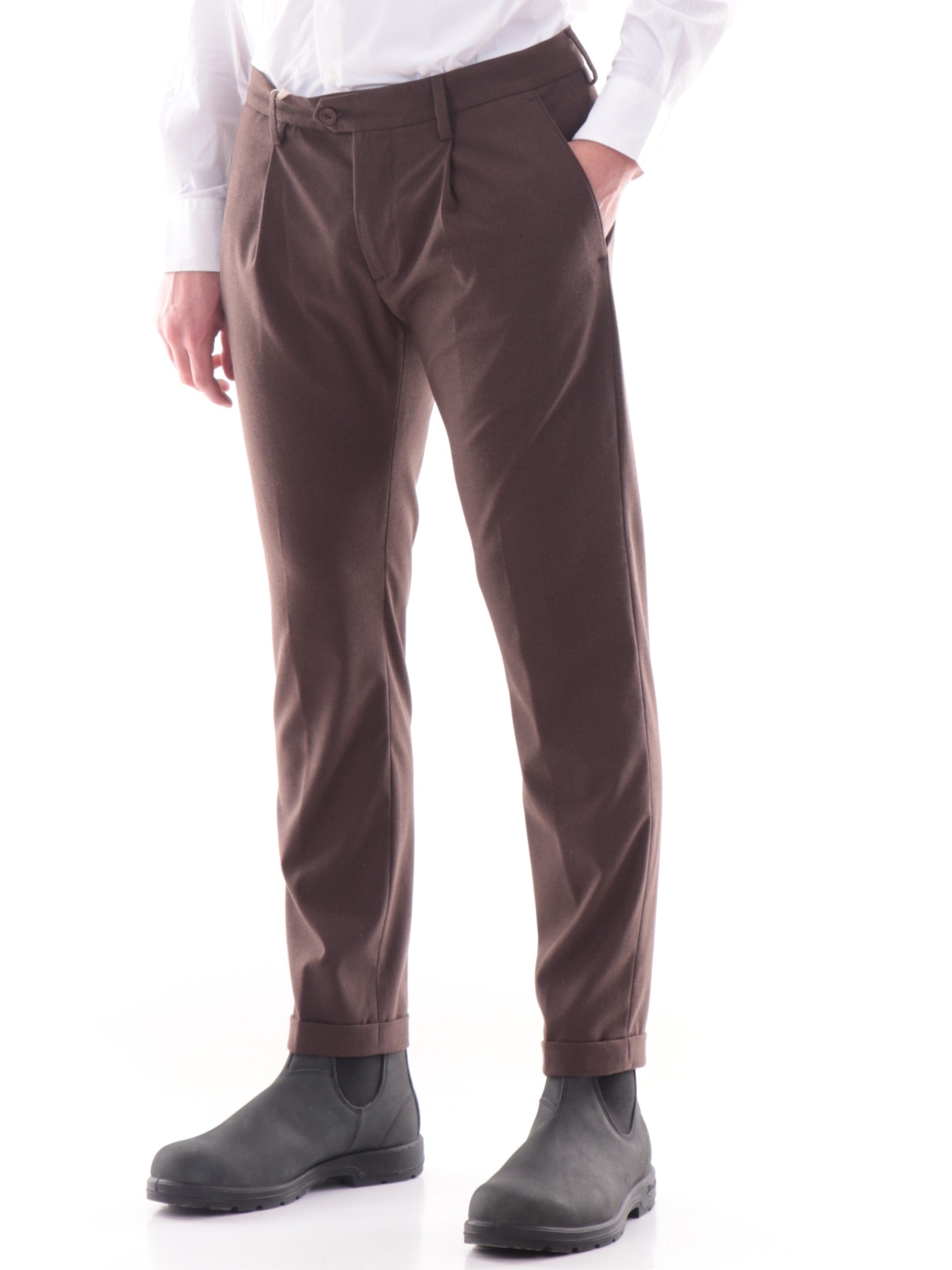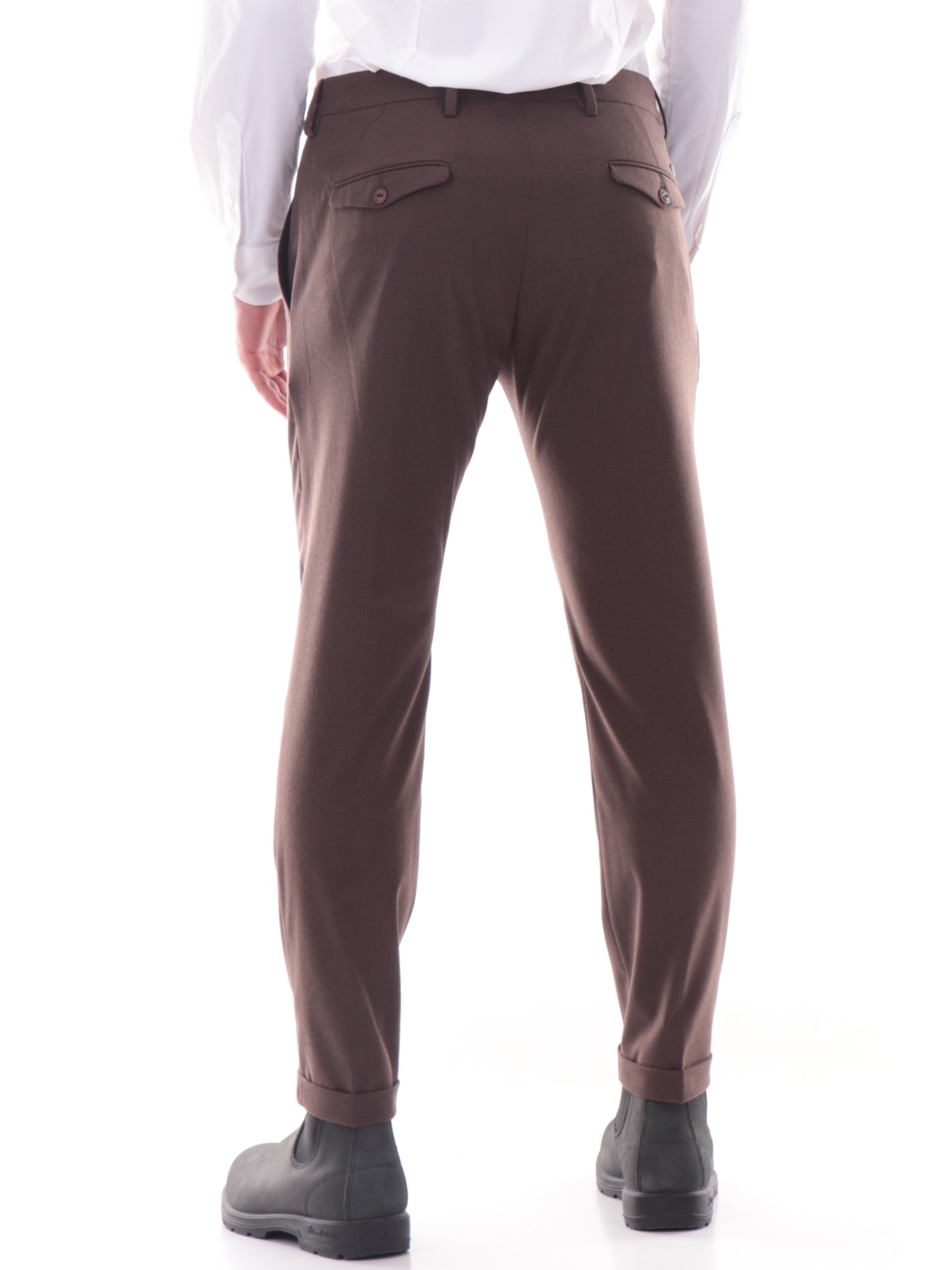 Pantaloni marroni da uomo Modfitters Regent. Questi pantaloni da uomo marroni sono realizzati dal tessuto in flanella che li rende caldi, morbidi e sofffici al tatto, questi pantaloni Regent sono caratterizzati dalla chiusura con bottone più zip, due tasche laterali aperte e due tasche posteriori con bottoni e il fondo con il risvolto. Questi pantaloni sono perfetti per un look sia elegante che casual