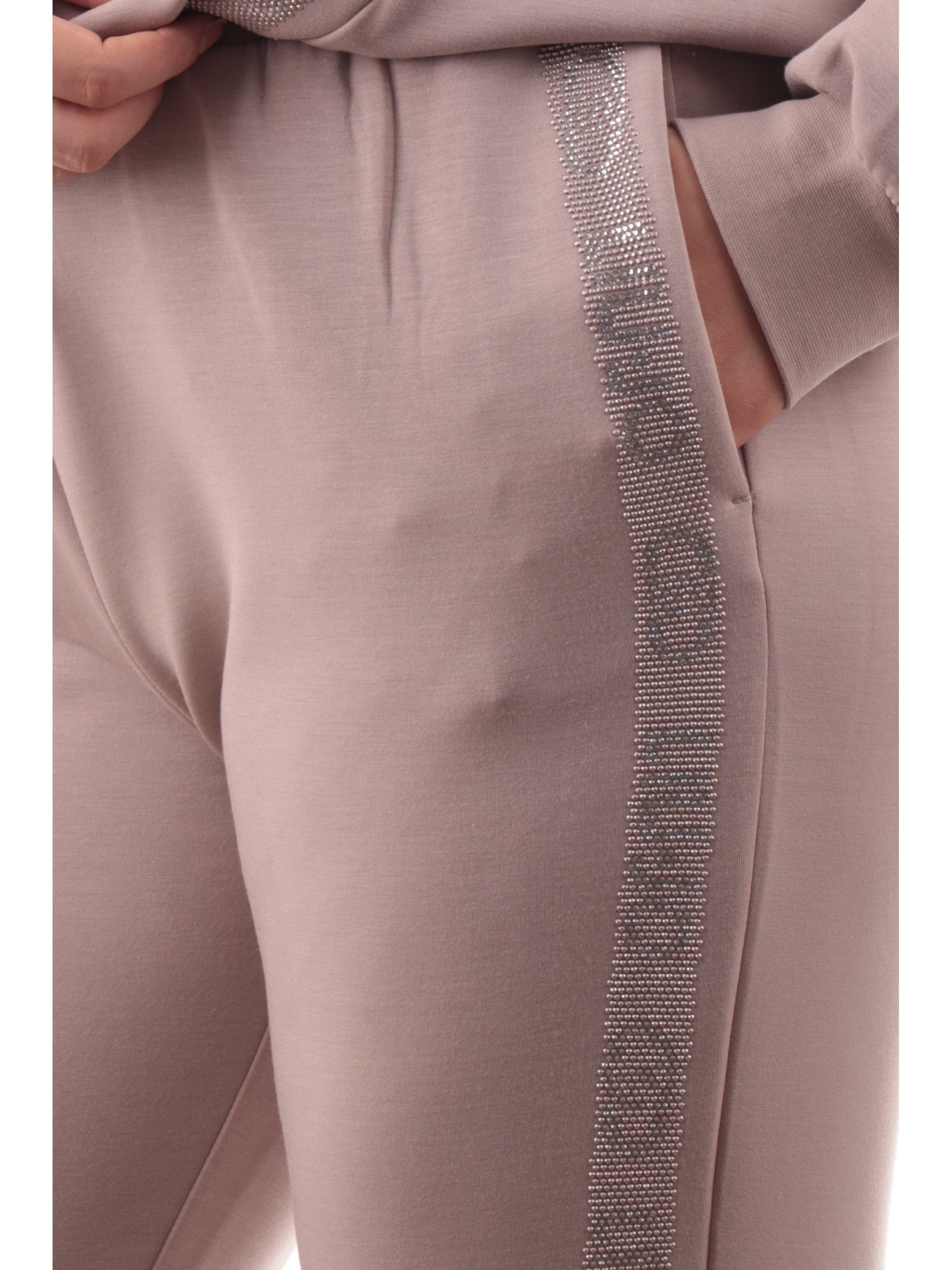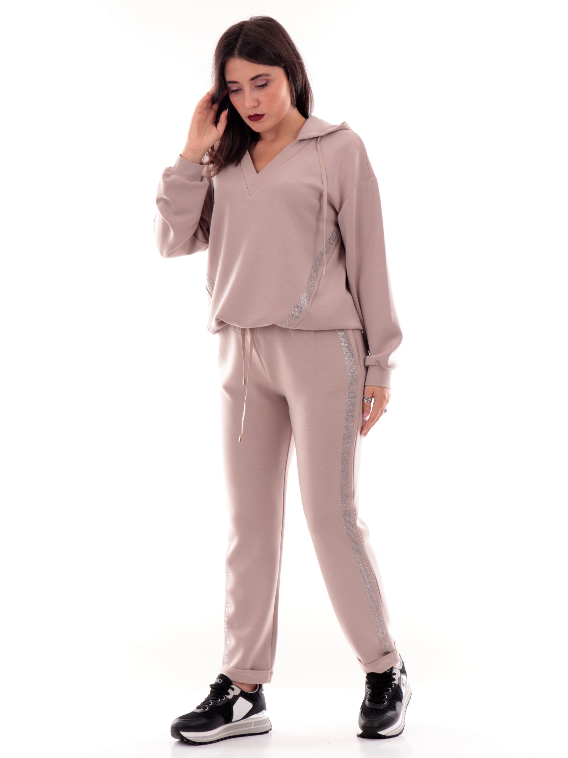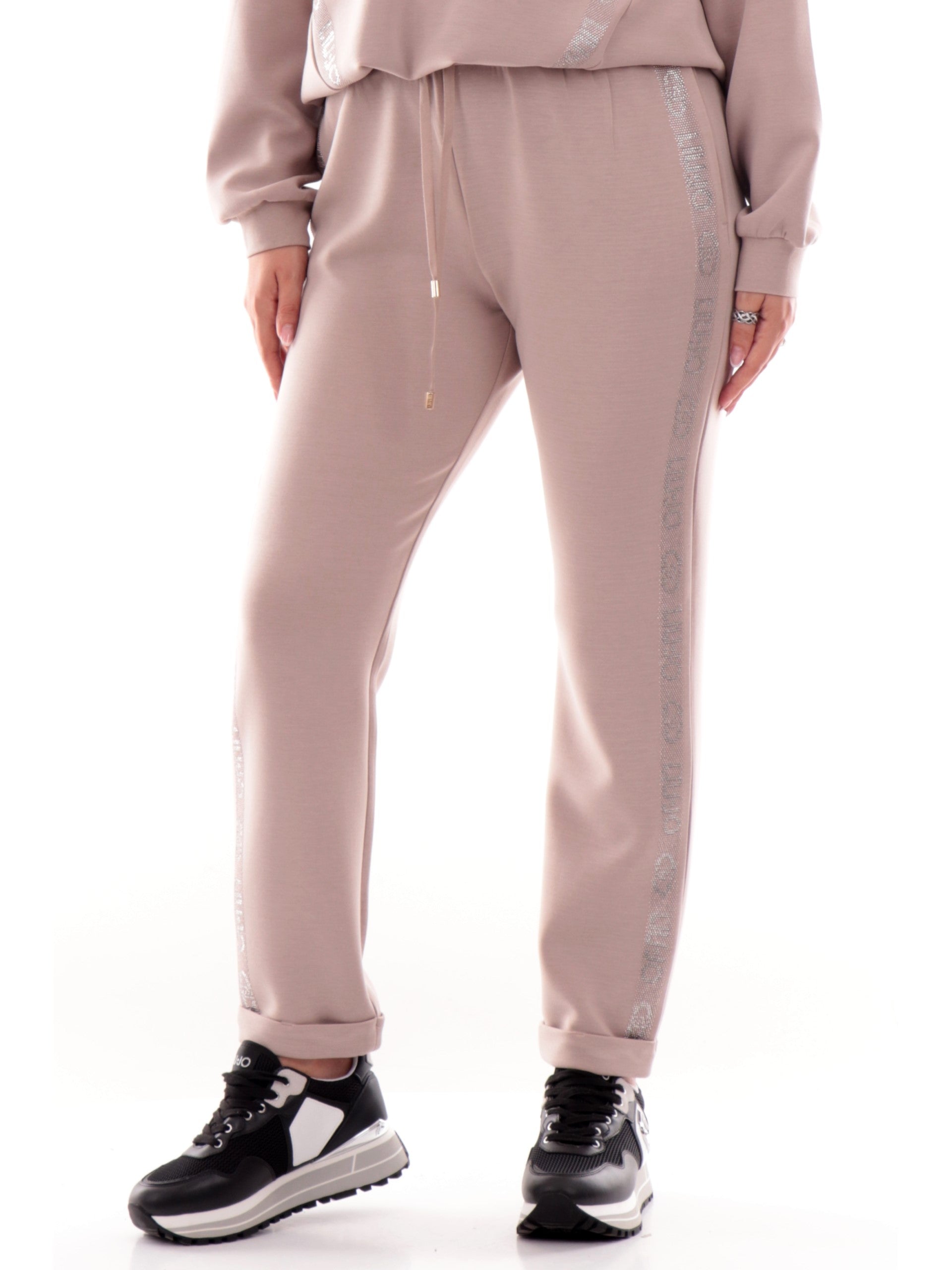 Pantaloni tuta Liu Jo beige da donna bande con strass TF5093J4616. Questi pantaloni Liu Jo hanno la banda elastica sul punto vita regolabile con laccetti, due tasche laterali aperte, il fondo con risvolto e le bande logate ambo i lati con strass.