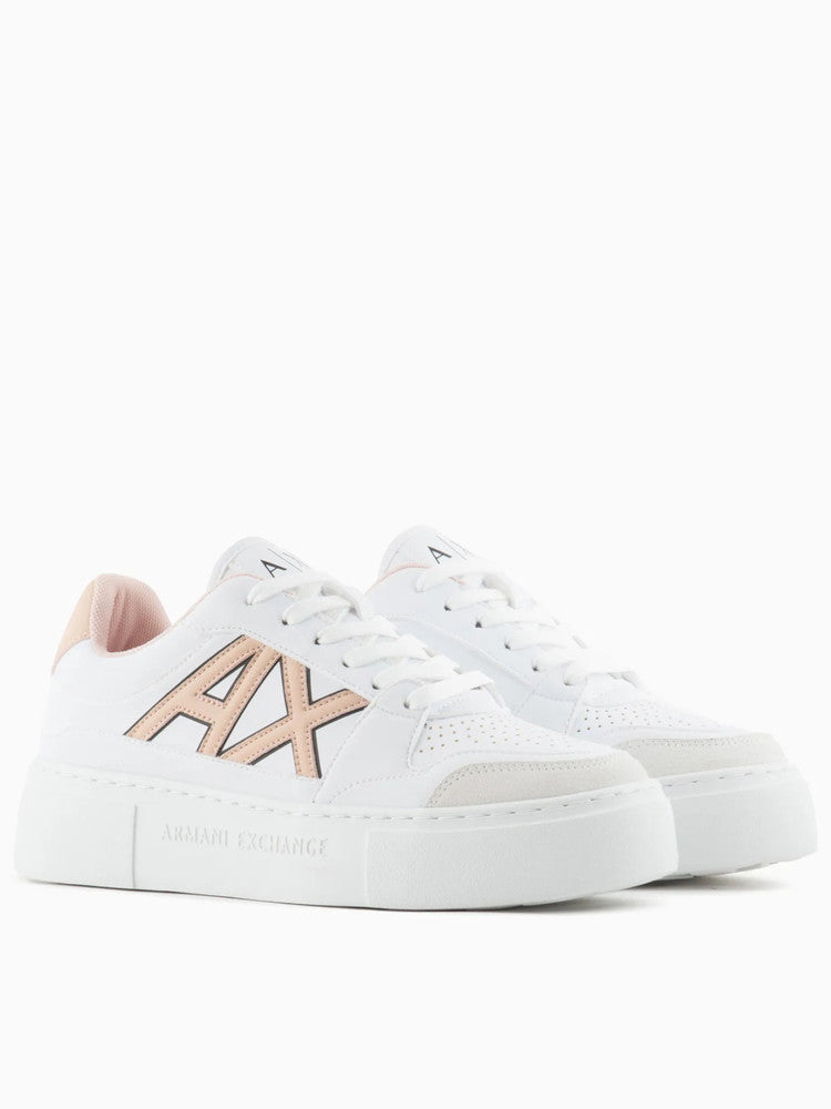 Scarpe Armani Exchange bianche e rosa da donna XDX147XV830. Queste sneakers AX bianche hanno la tomaia in mesh, la suola in gomma, i fori traspiranti e la soletta removibile. Sul davanti di queste AXtroviamo la classica chiusura a lacci e il patch del brand a lato a contrasto colore.