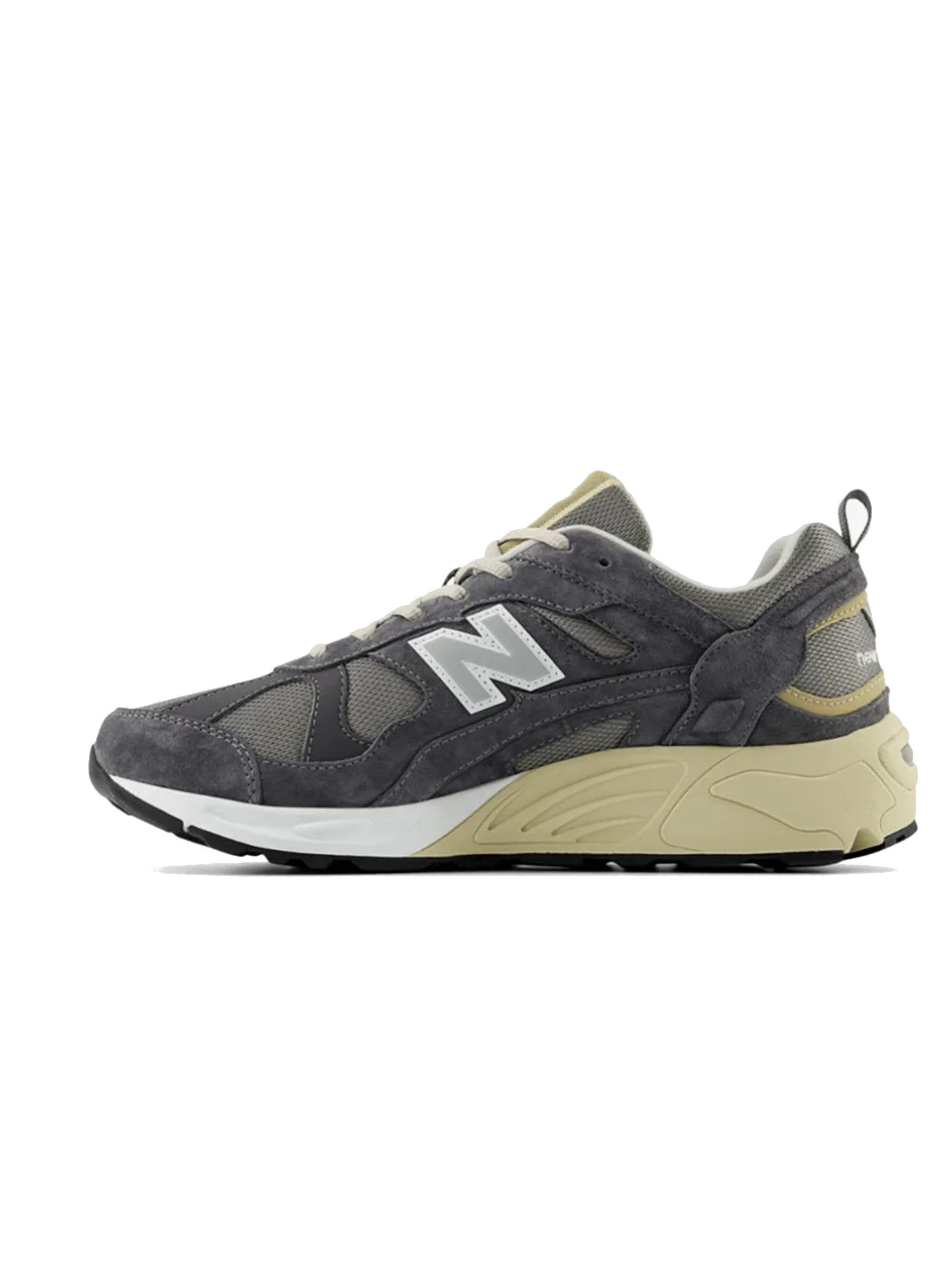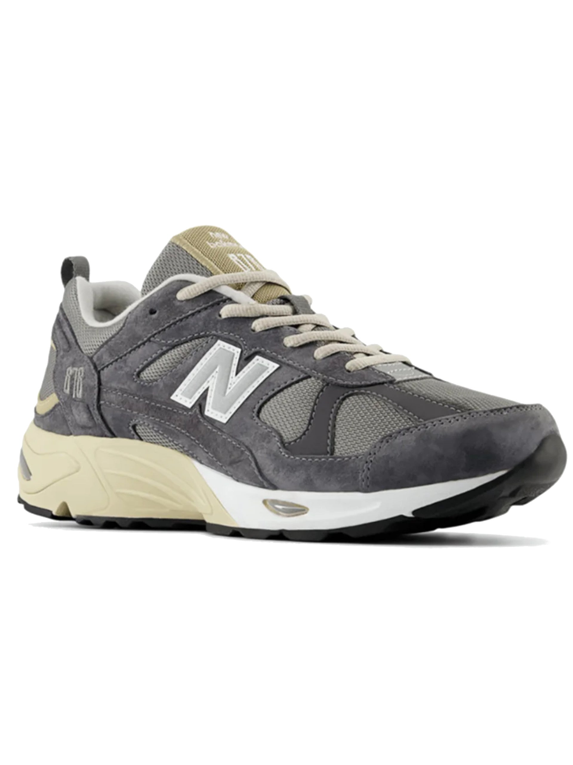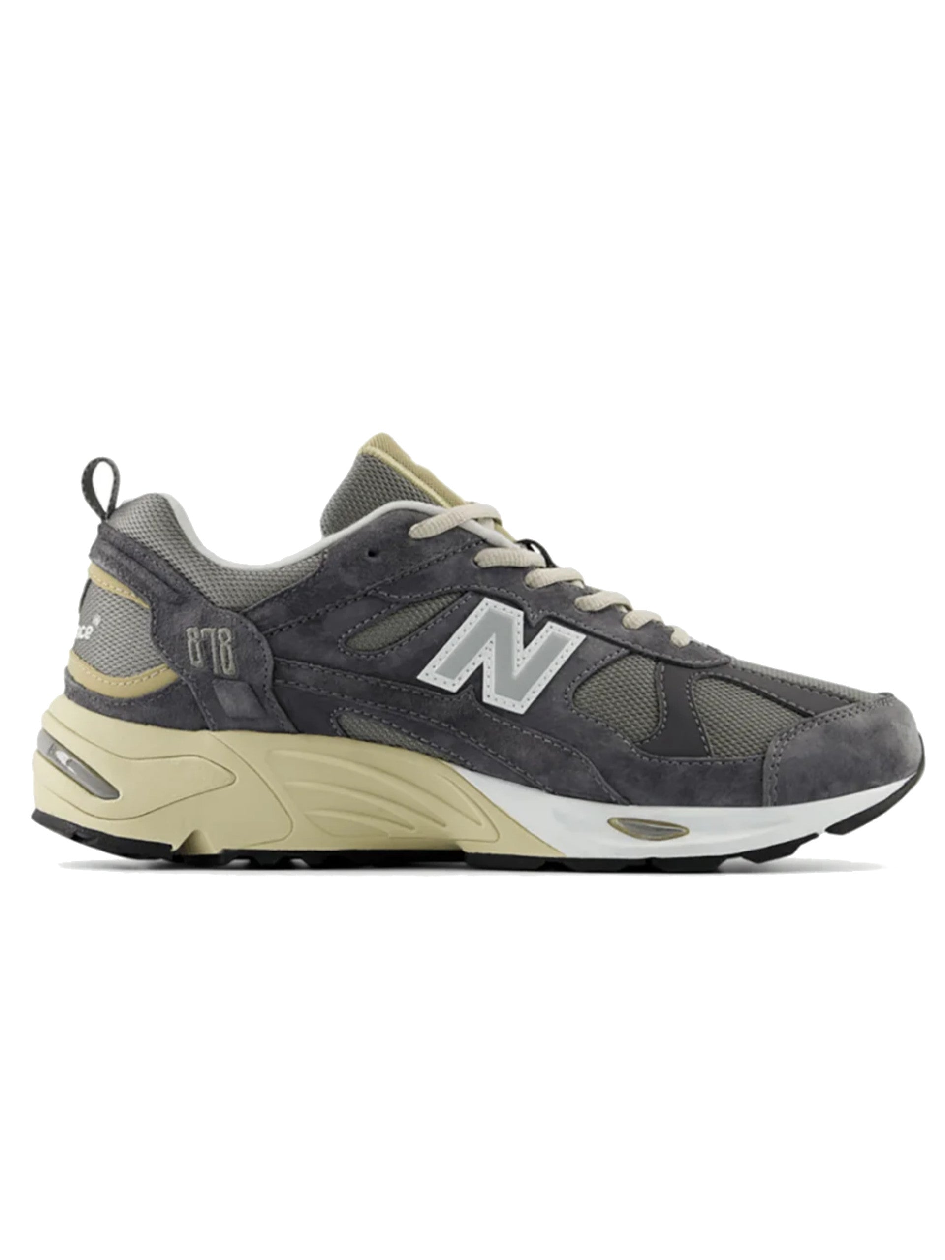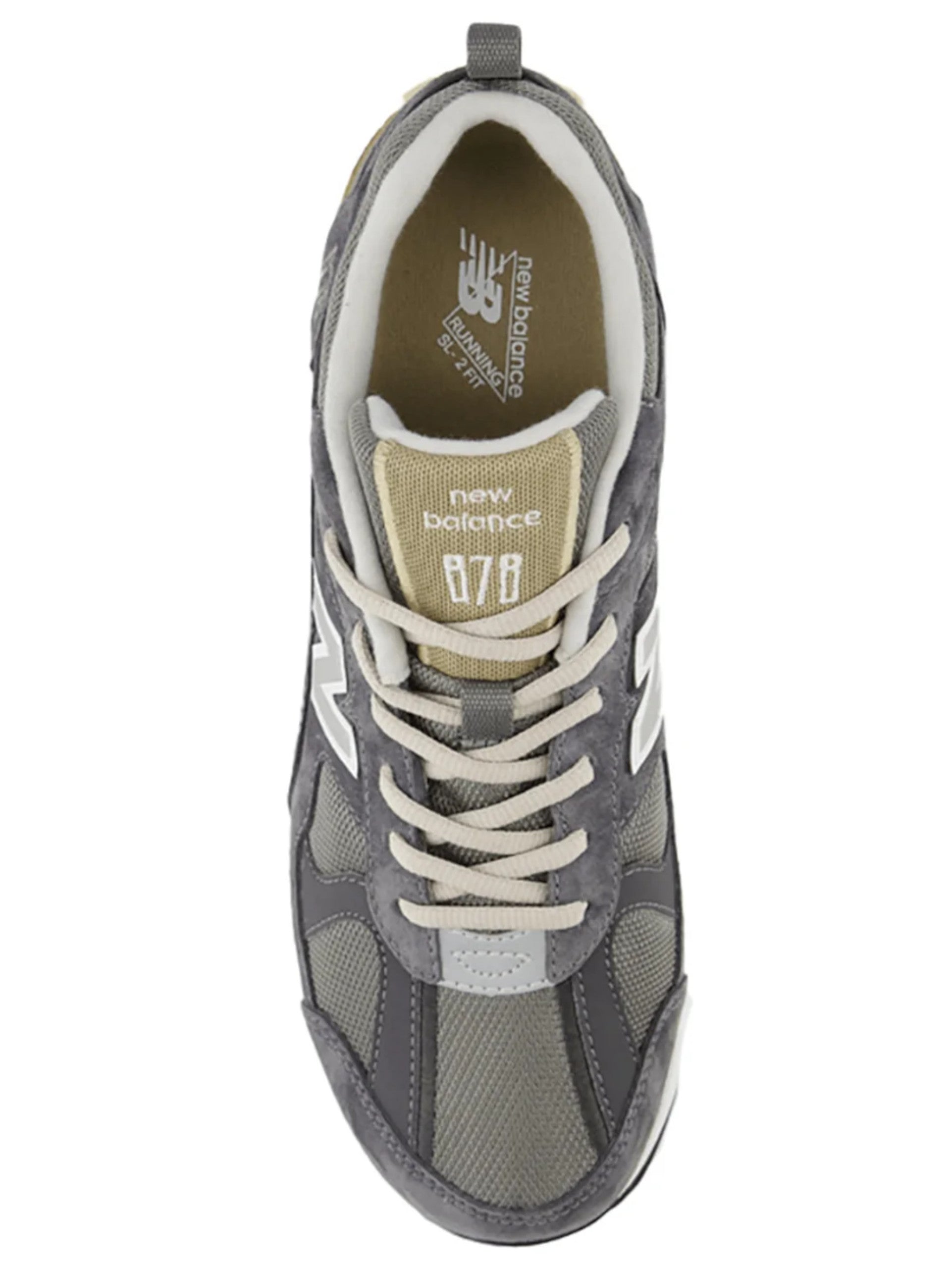 Scarpe New Balance 878 grigie. Queste New Balance grigie hanno la tomaia in tessuto e la suola Abzorb in gomma, hanno la linguetta posteriore che agevola l'entrata del piede, la chiusura a lacci e illogo del brand ambo i lati.