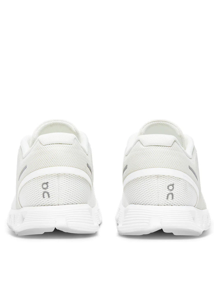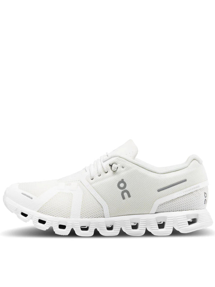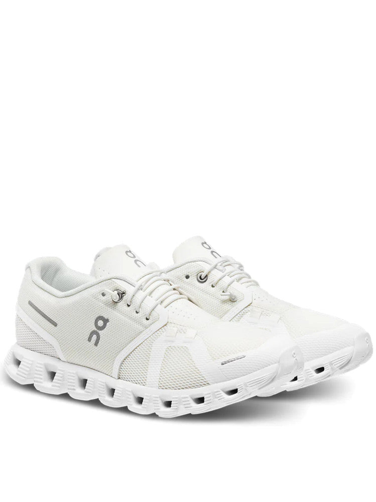 Scarpe On bianche da uomo Cloud 5 59983. Queste scarpe da running On bianche hanno la tomaia realizzata in tessuto traspirante, la chiusura con lacci, la suola in gomma traforata per massimizzare le tue performance e il sottosuola con trama antiscivolo per garantire cambi di direzioni puliti ed efficaci. Patch gommato ambo i lati.