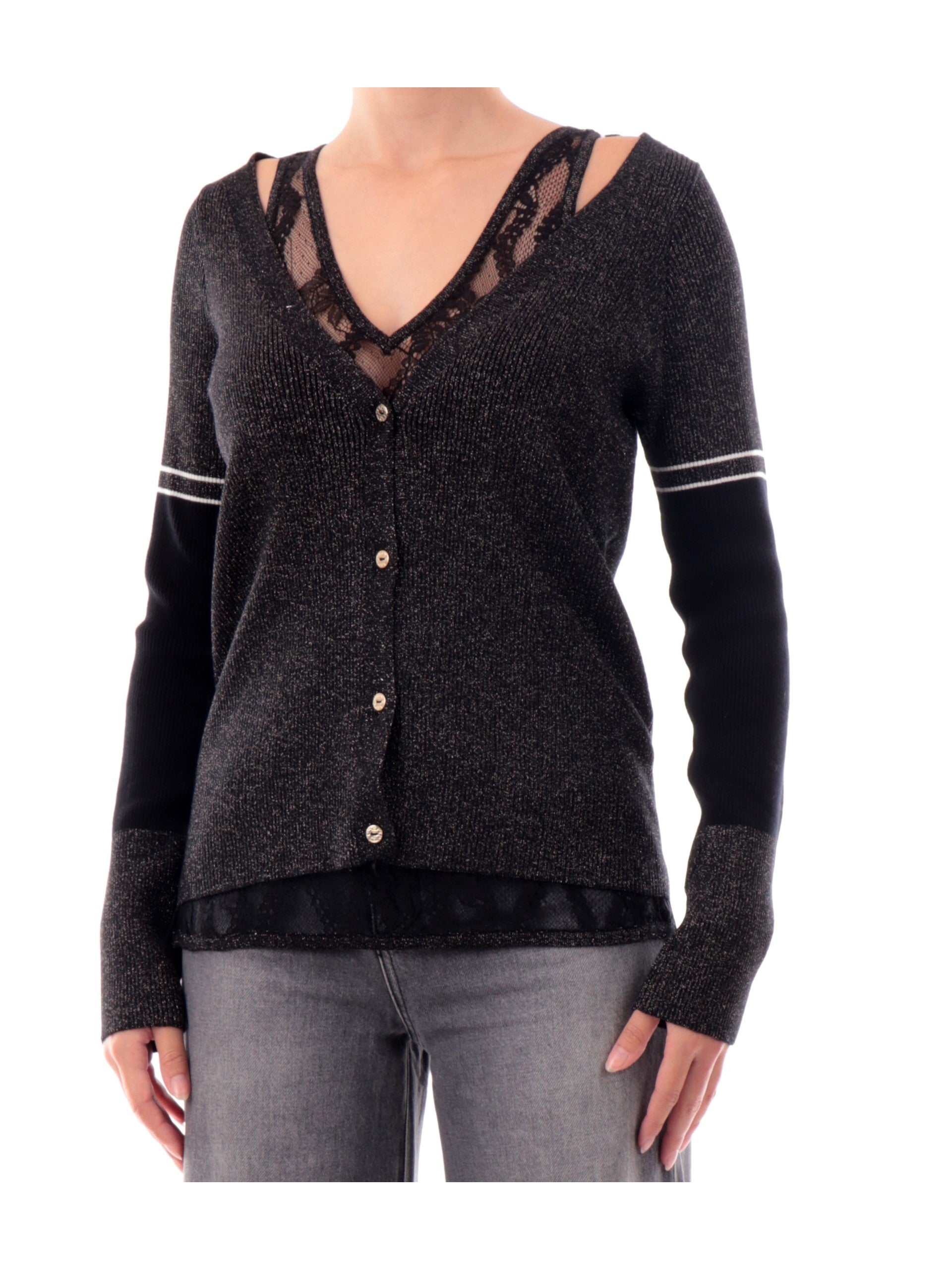 Maglia Liu Jo nera con inserto canotta in pizzo e tessuto lurex a costine con bottoni