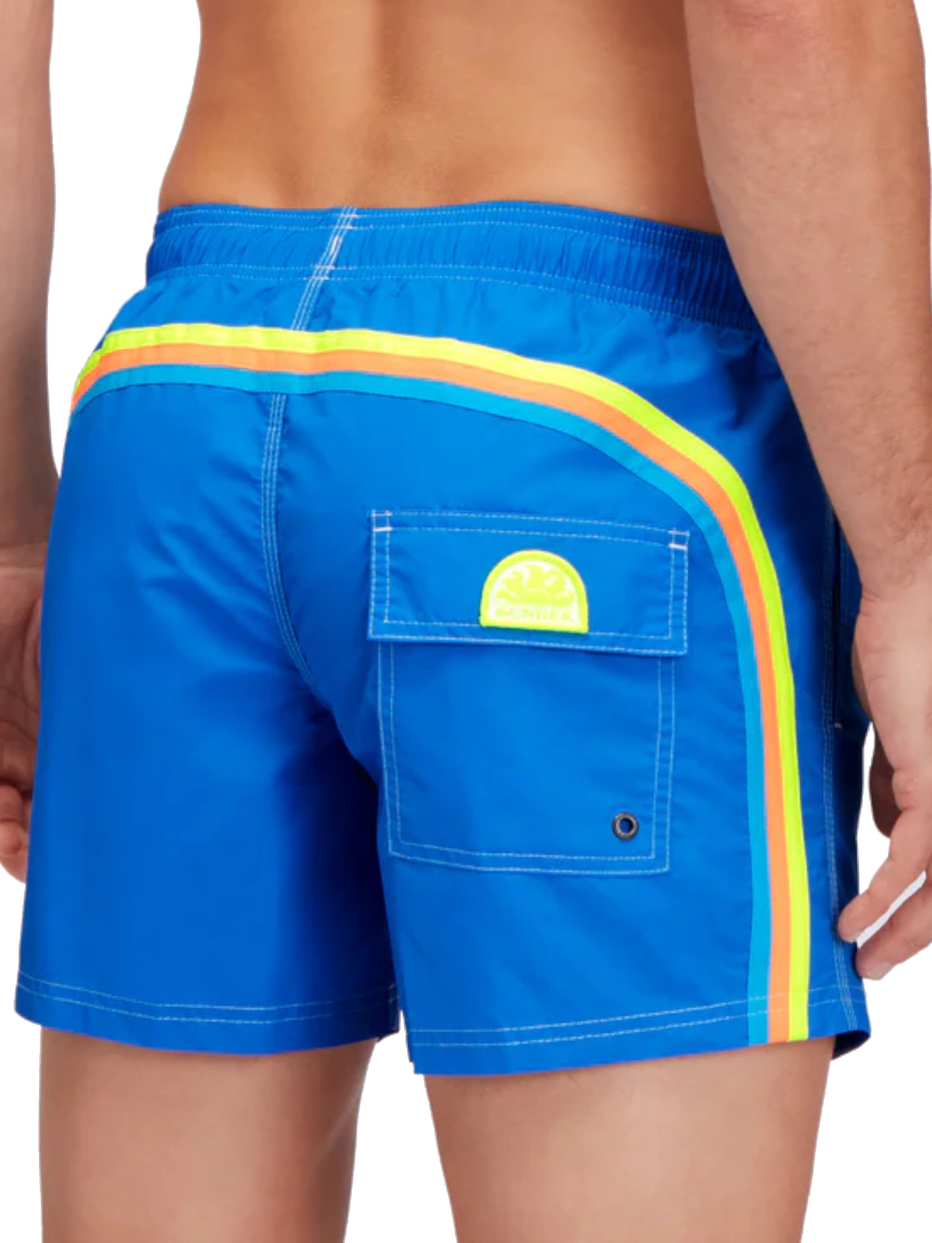 Costume mare Sundek blu da uomo Boardshort M504BDTA100, è l'iconico boxer mare con arcobaleno sul retro del brand. Questo costume Uomo Sundek è caratterizzato da cuciture a contrasto e tessuto nylon.