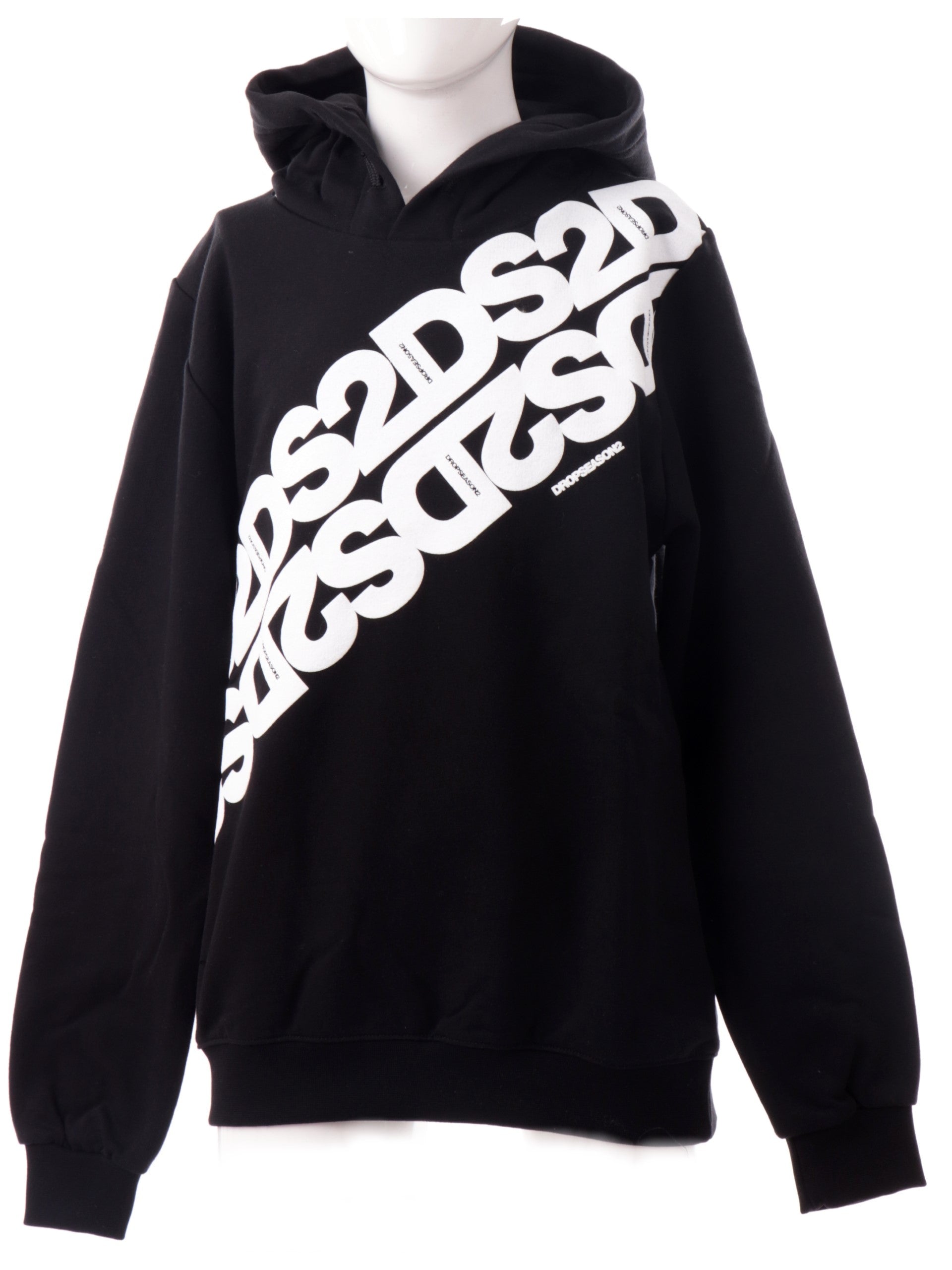 Felpa DS2 nero bambino con cappuccio. Questa felpa DS2 nera a manica lunga è caratterizzata da maxi logo DS2 con scritta bianca, cappuccio regolabile con lacci, polsini e fondo elasticizzati, Realizzato in puro cotone