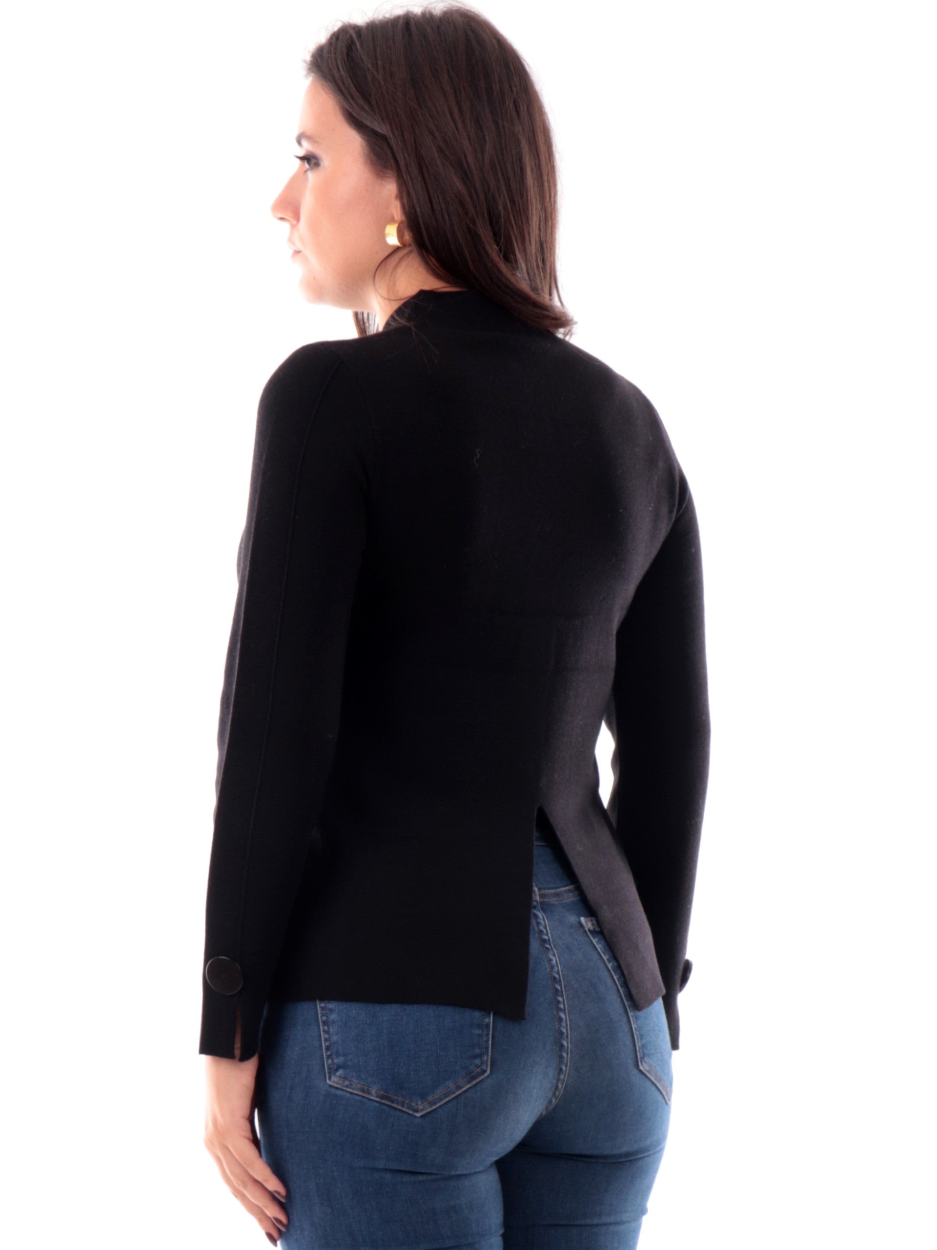 Giacca Anis White nera in filo realizzata in filato morbido misto lana. Questo cardigan con bottoni scultorei moderni dona fascino ed eleganza a chi la indossa . Una giacca coreana nera da donna emblema della collezione maglieria anis White