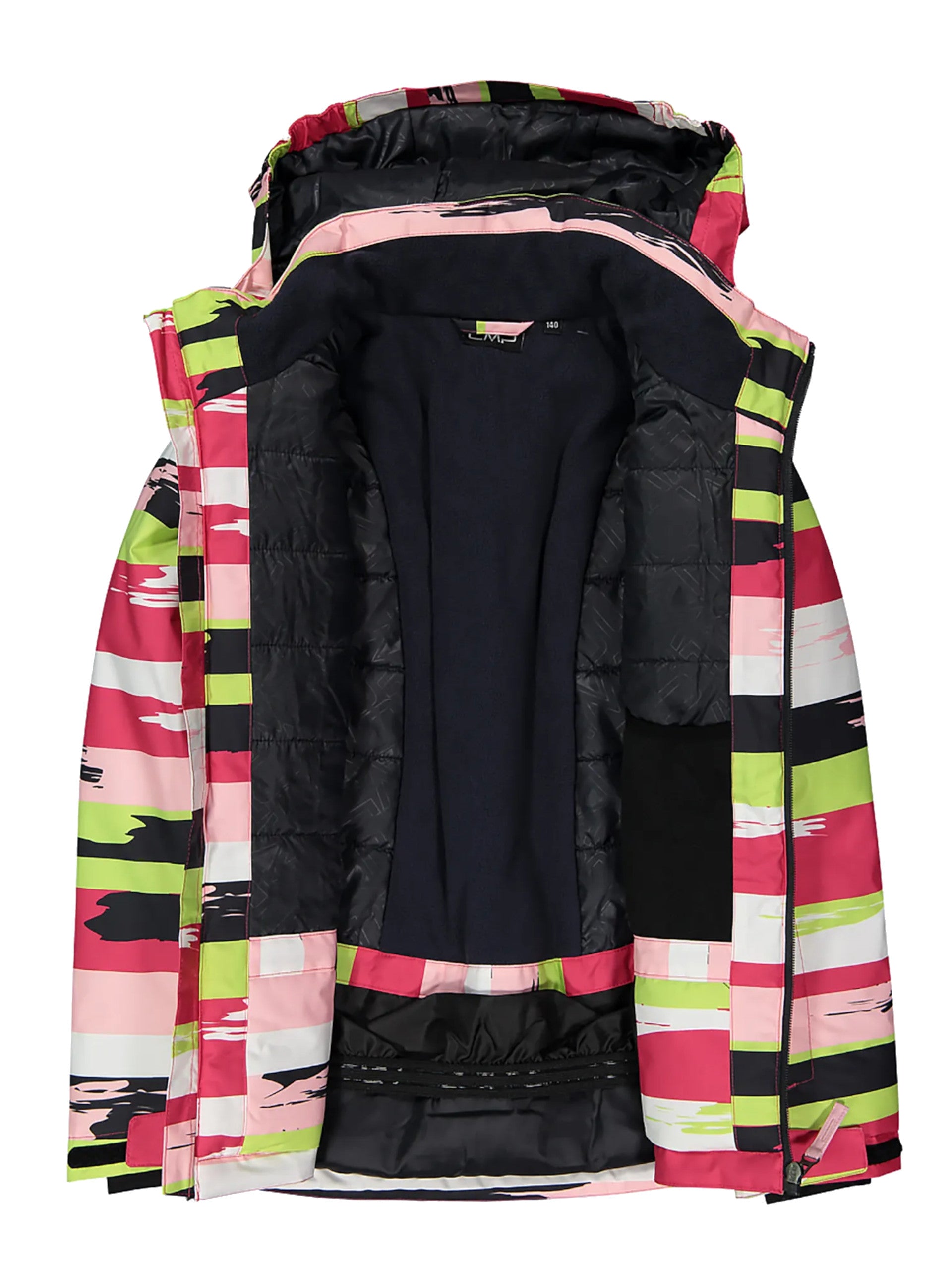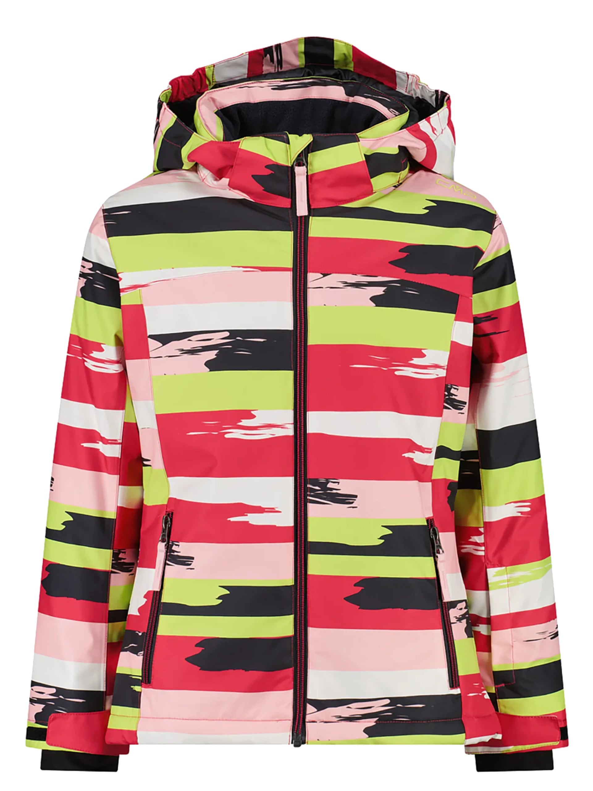 Giacca da sci da bambina rosa CMP Snaps Hood. Questa giacca da sci bambina realizzata dalla fantasia all overed è caratterizzata dalle cuciture totalmente nastrate e membrana impermeabile Clima Protec, che assicurano impermeabilità e traspirabilità anche nelle sciate più intense. Questa giacca da neve CMP da bambina è caratterizzata dal cappuccio staccabile regolabile con coulisse, due tasche laterali con zip e cerniera frontale con patta antivento interna, tasca porta skipass, polsini regolabili con velcro ed elasticizzati, fondo regolabile con coulisse, al suo interno troviamo una ghetta antineve elasticizzata con stampa antiscivolo in silicone e una tasca aperta.