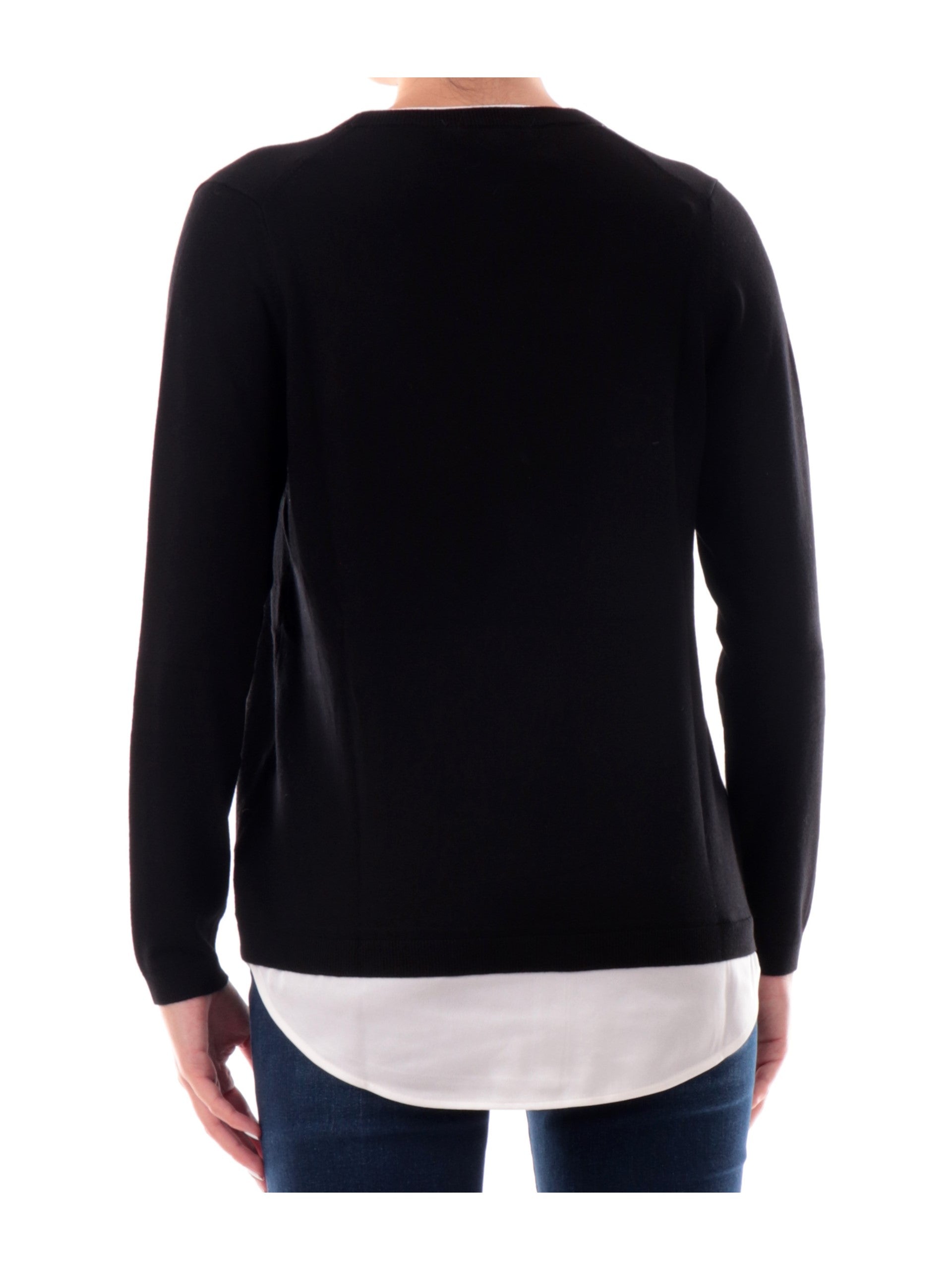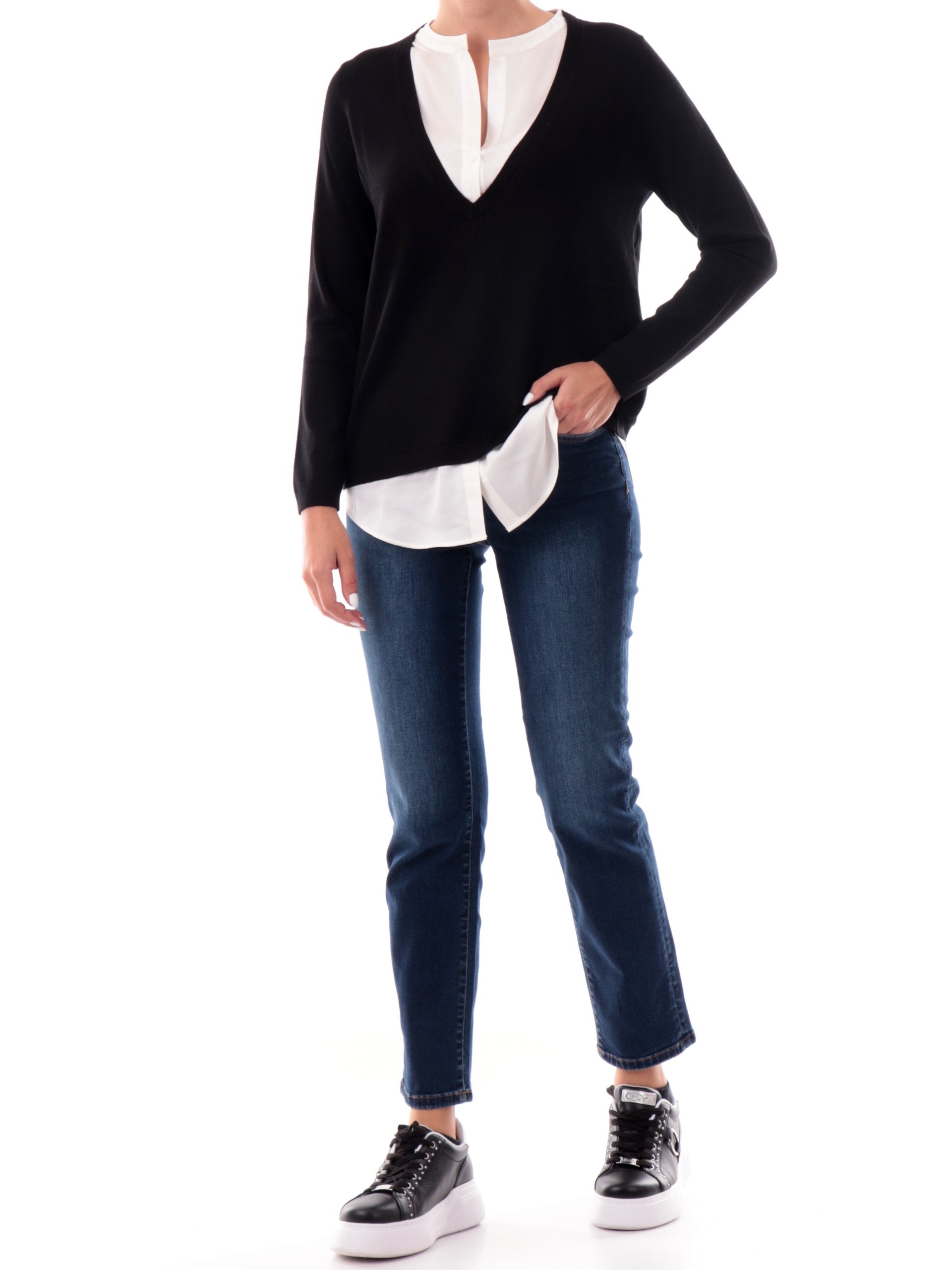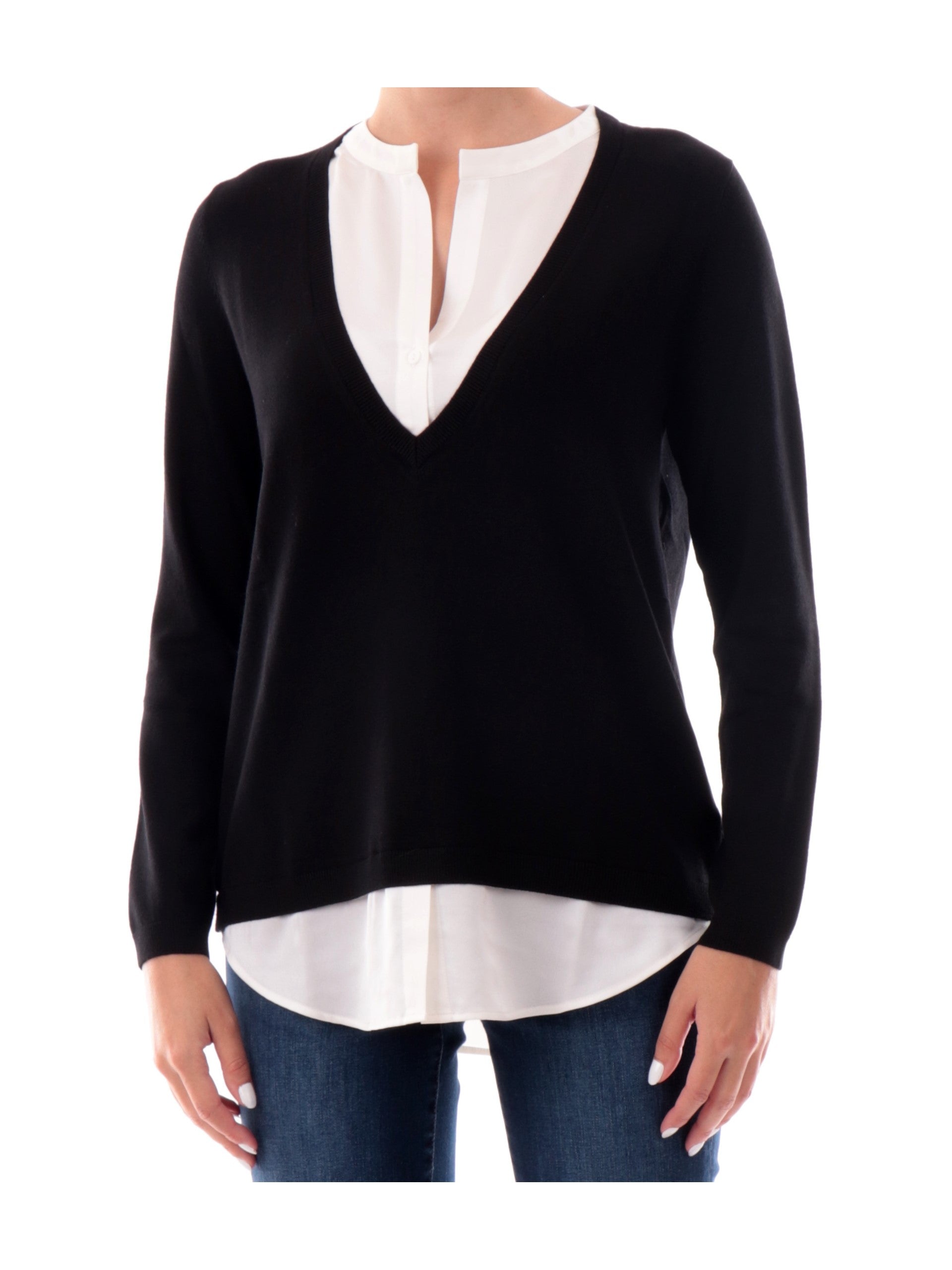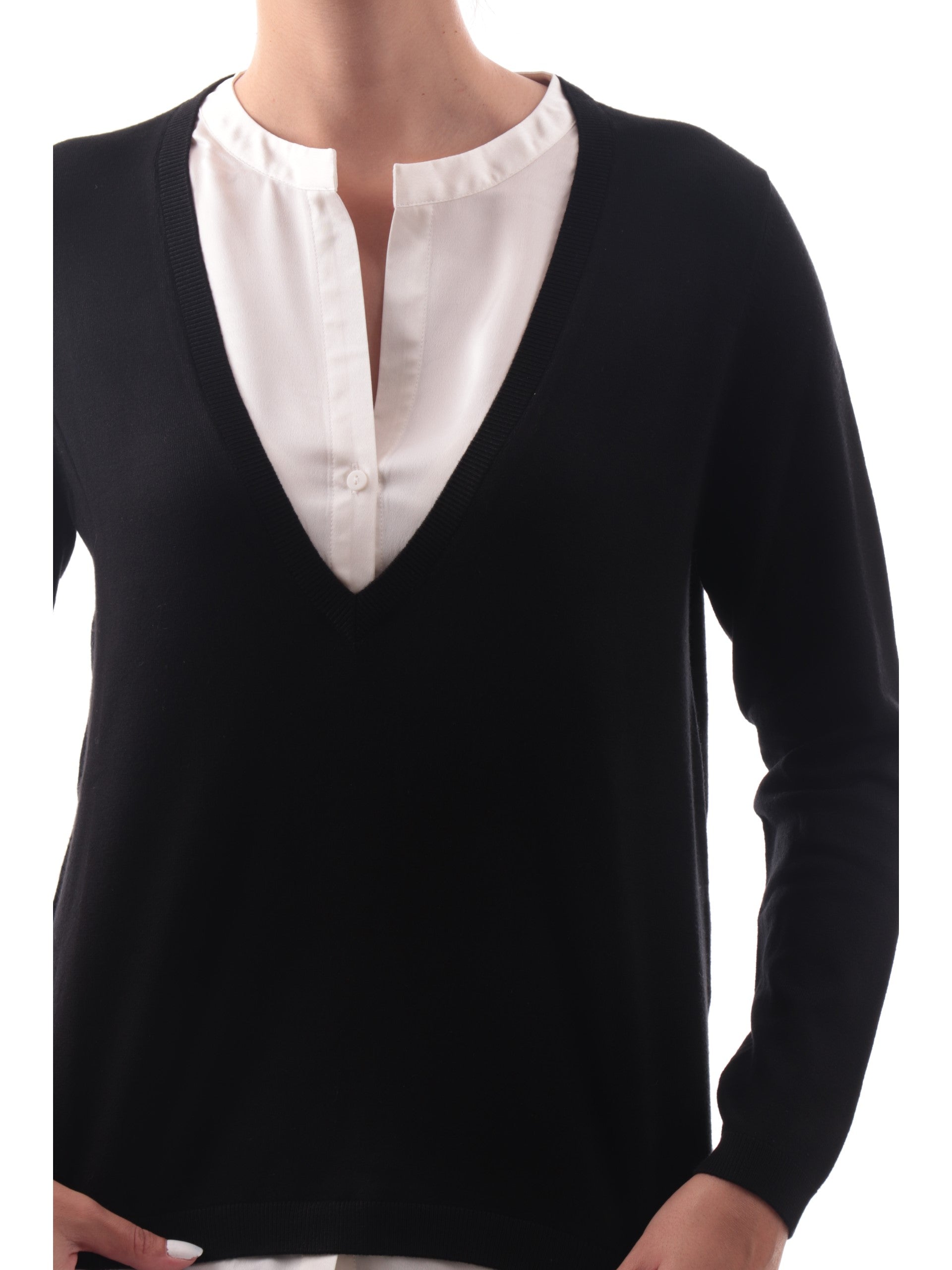 Maglione Anis nero da donna inserto serafino 255W1000, realizzato in viscosa. Questo maglione donna Anis nero ha lo scollo a V, polsini e fondo elasticizzati con inserti in raso.