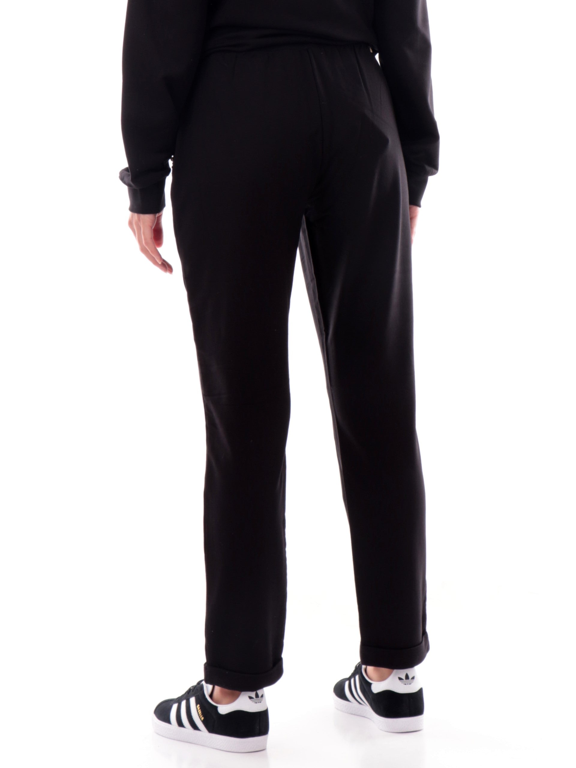 Pantaloni Liu jo neri da donna realizzati in morbido in morbido cotone sono caratterizzati da tasche con dettagli in perle applicate, vita elastica e laccetti regolabili. Questa Tuta nera Liu Jo ha la placchetta logo in metallo con strass sul retro.