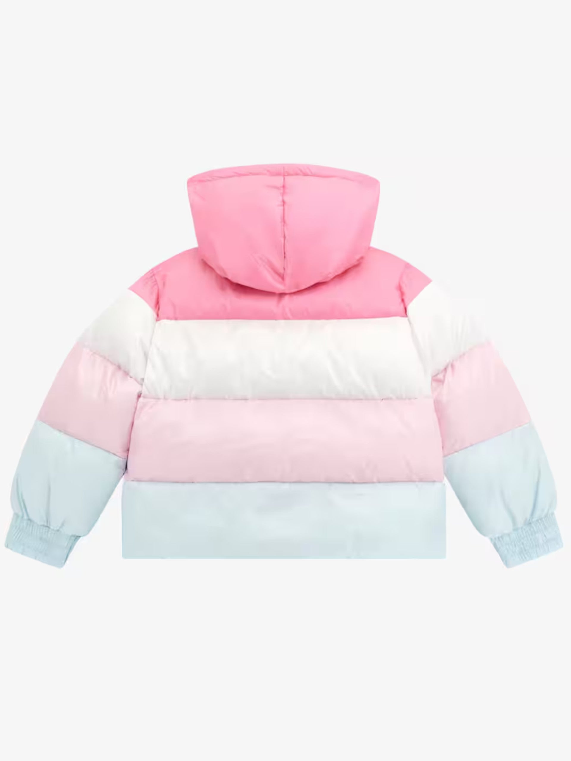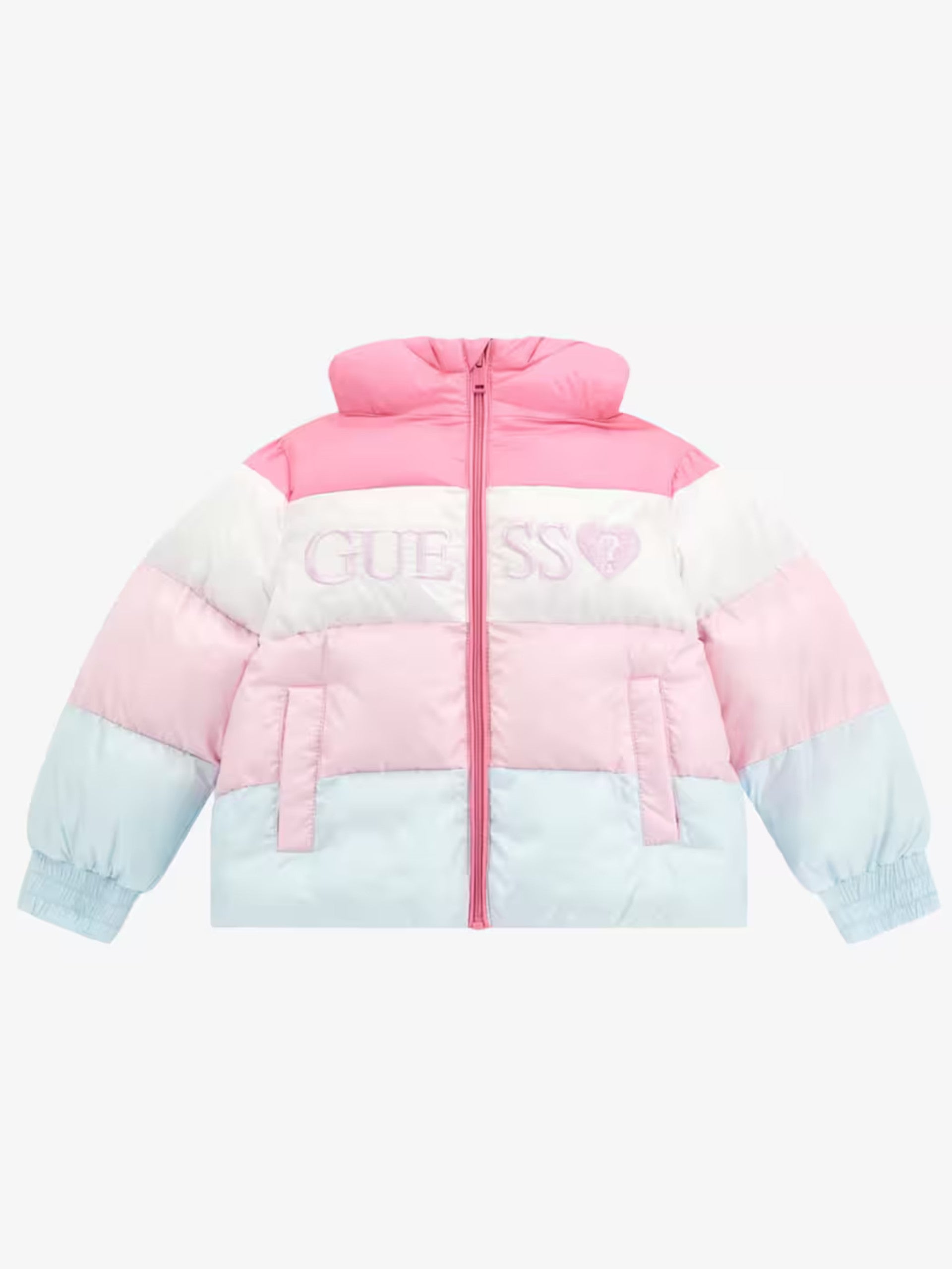 Piumino Guess bianco e rosa da neonata full zip con cappuccio K5YL01WEGY0. Questo giubbino Guess da neonata ha il cappuccio fisso, la chiusura full zip centrale, due tasche laterali con bottone automatico, il ricamo Guess sul davanti e polsini elasticizzati.